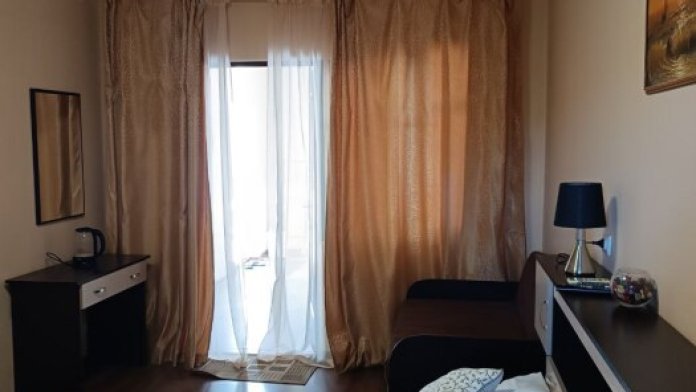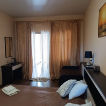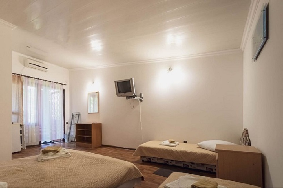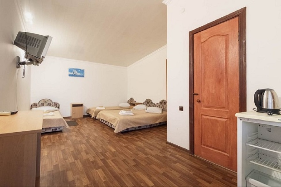 Номер трехместный с холлом, в котором находится зона отдыха (диван, стол, кресла, холодильник). В номере санузел, душевая кабина, кровати, шкаф, тумбочки, комод, спутниковое телевидение, кондиционер (сплит-система), WiFi. Большой балкон с зоной отдыха и видом на море.