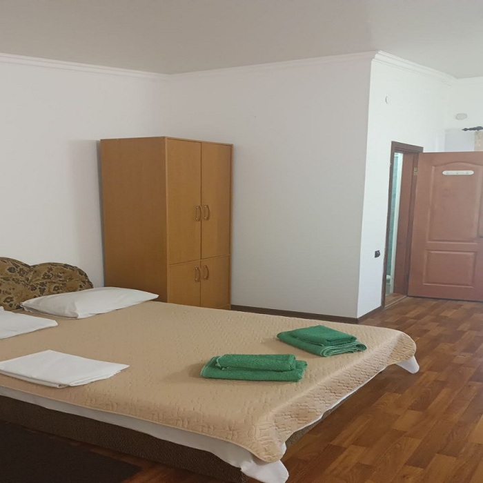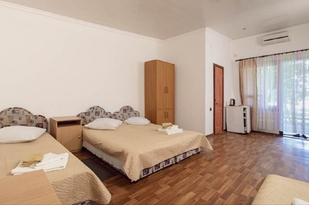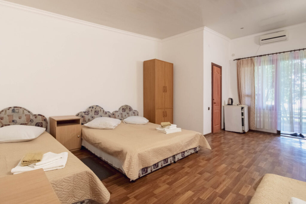 Номер стандарт до 4 человек. В номере санузел, душевая кабина, кровати, шкаф, тумбочки, комод, холодильник, спутниковое телевидение, кондиционер (сплит-система), терраса, оборудованная деревянной мебелью, WiFi.