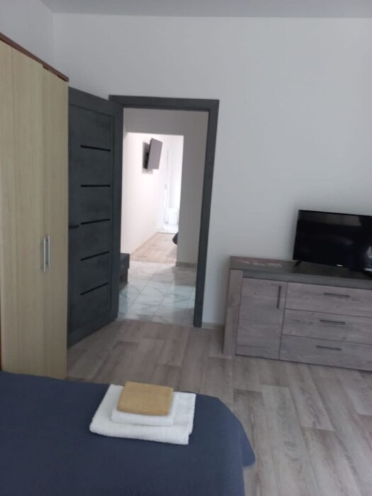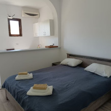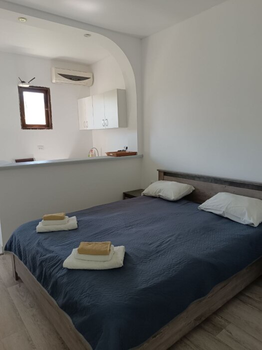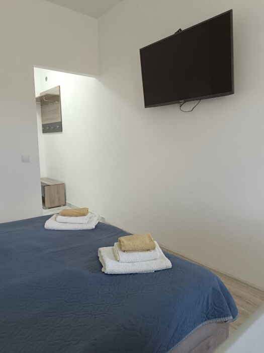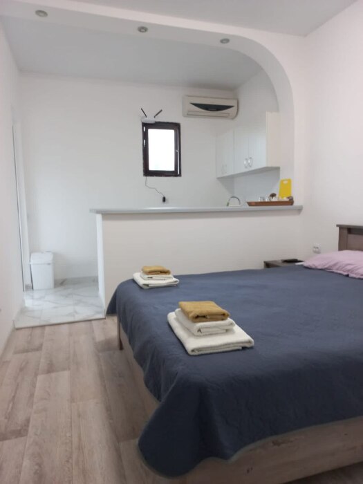 Санузел, душевая кабина, кровати, шкаф, тумбочки, комод, холодильник, спутниковое телевидение, кондиционер (сплит-система), WiFi, большой балкон с зоной отдыха и видом на море.