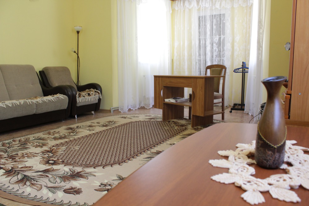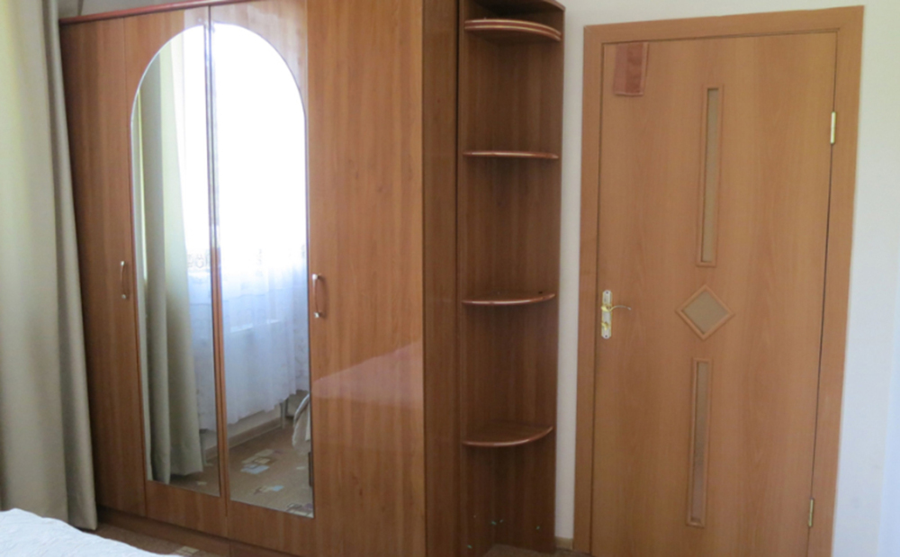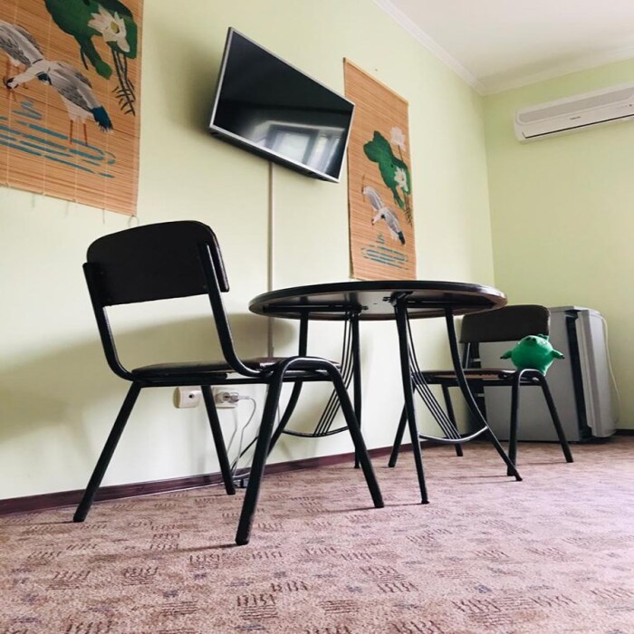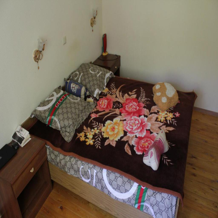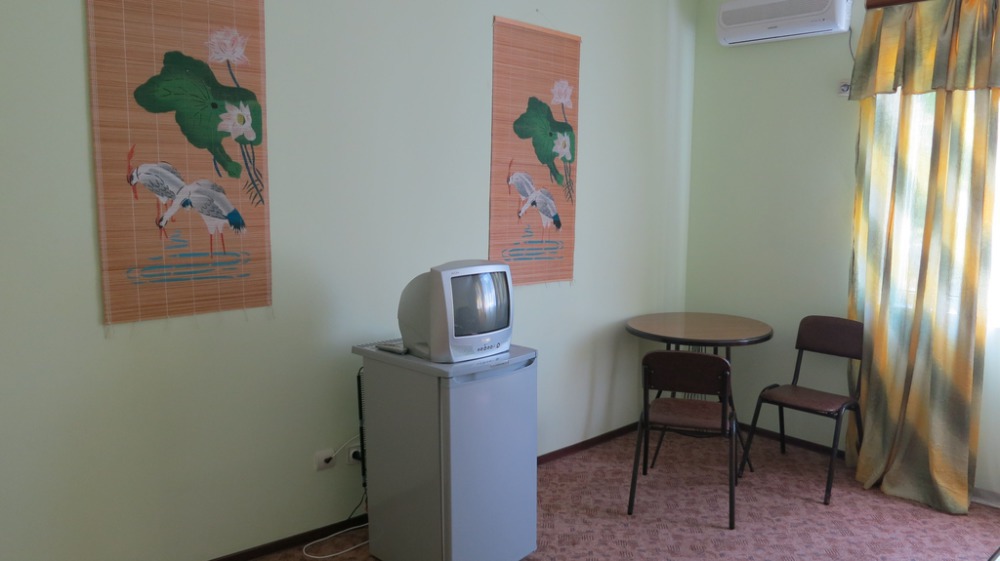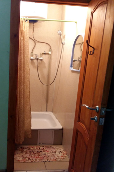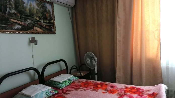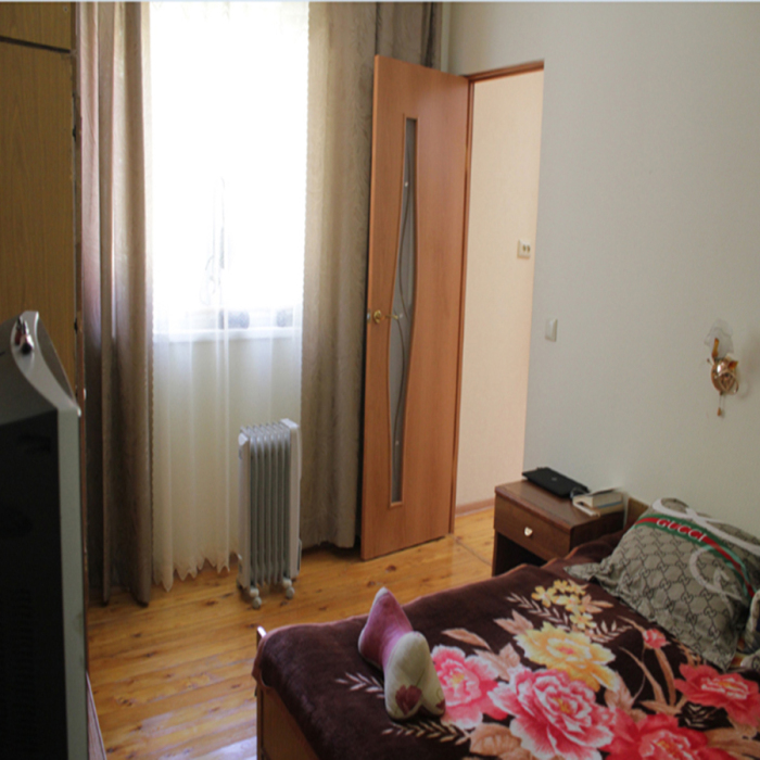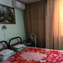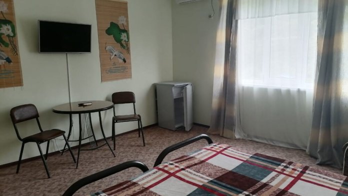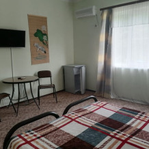 Жилая комната оборудована всем необходимым для проживания: двуспальная кровать, 2 кресла-кровати, прикроватные тумбочки, телевизор, кондиционер, санузел на этаже, душ в номере, интернет. Имеется шкаф для одежды и обуви. Расположен на первом этаже.