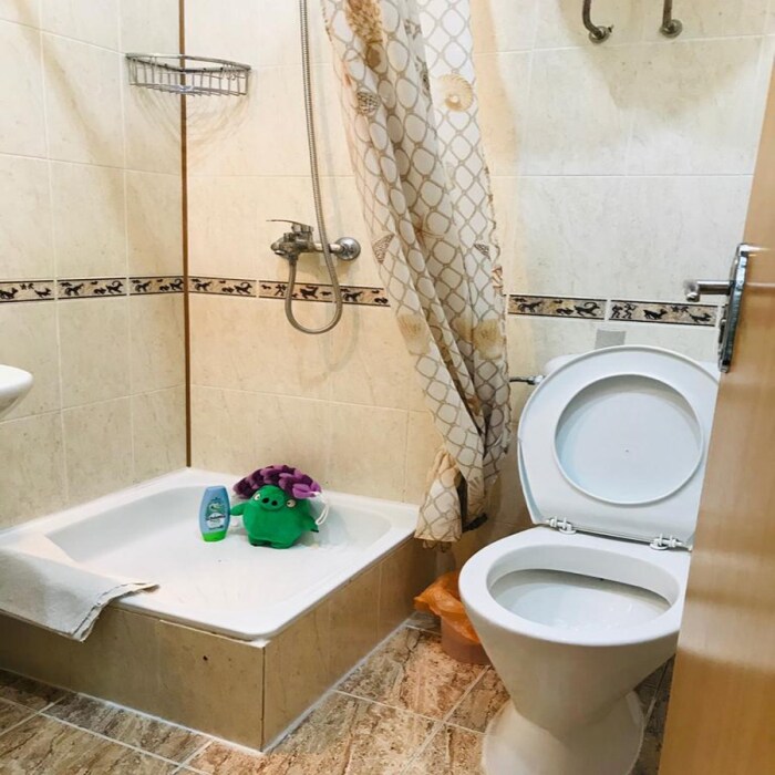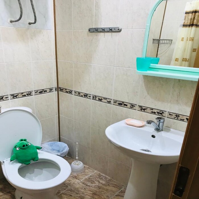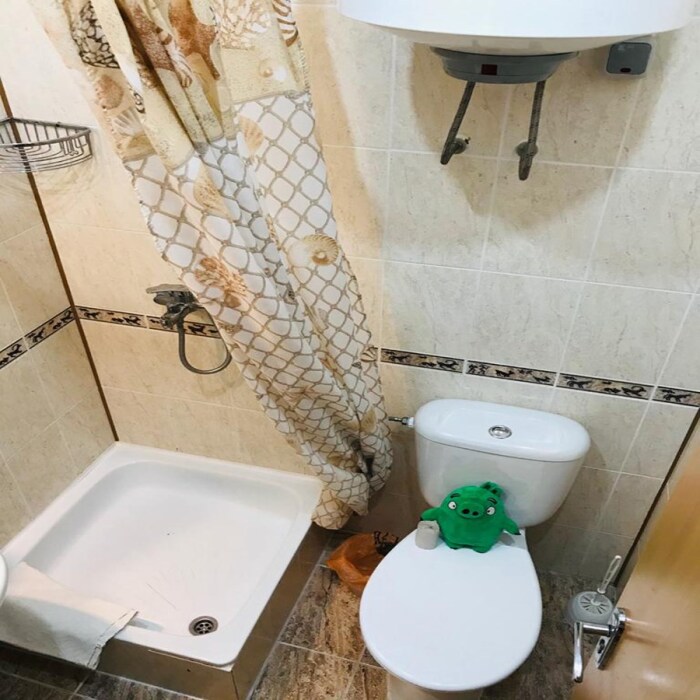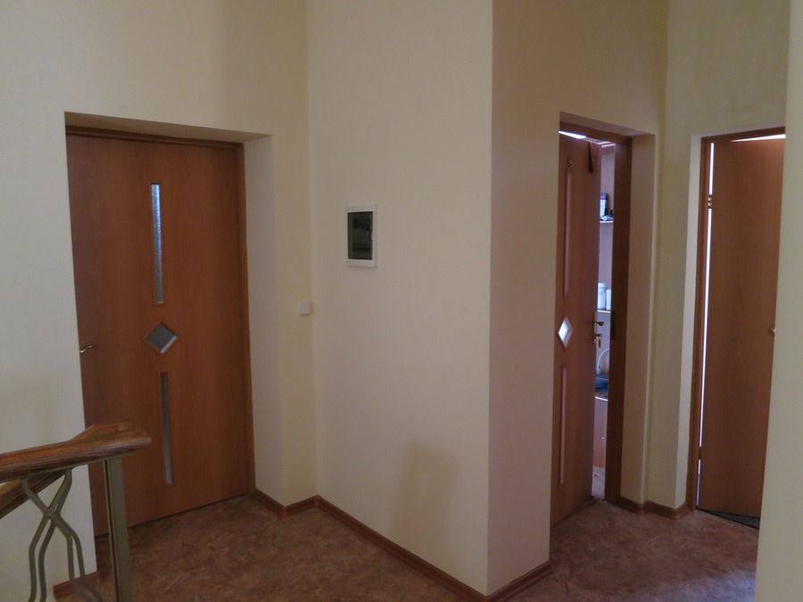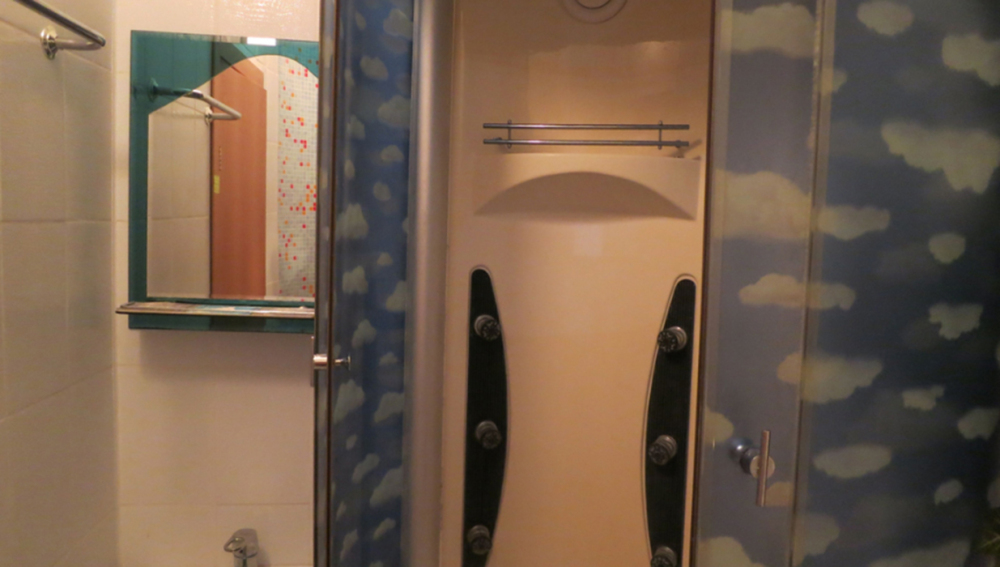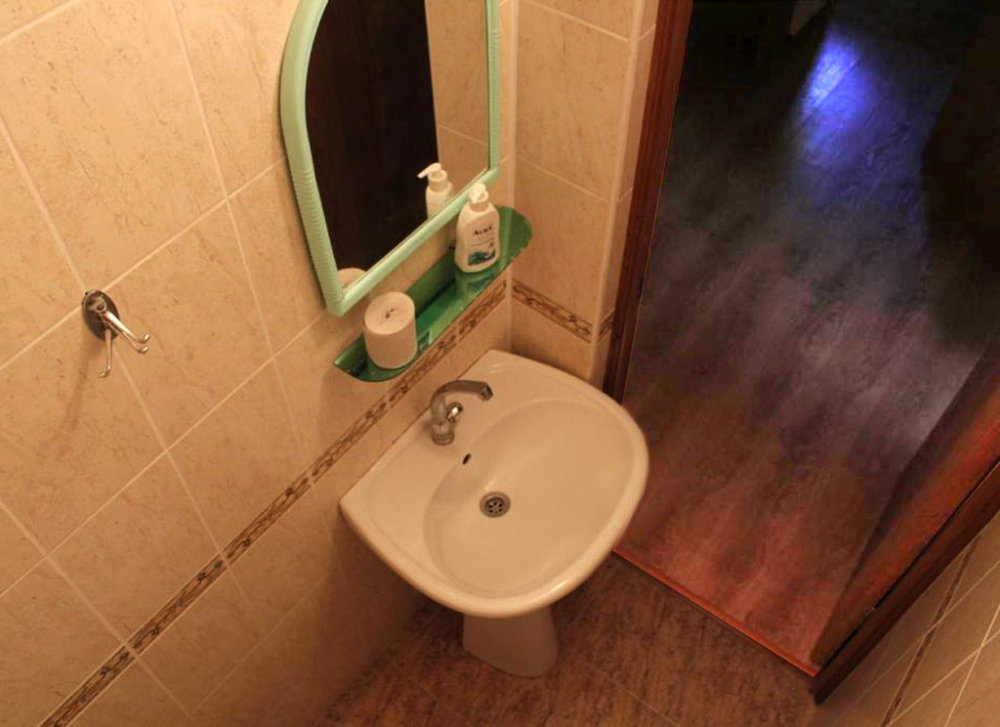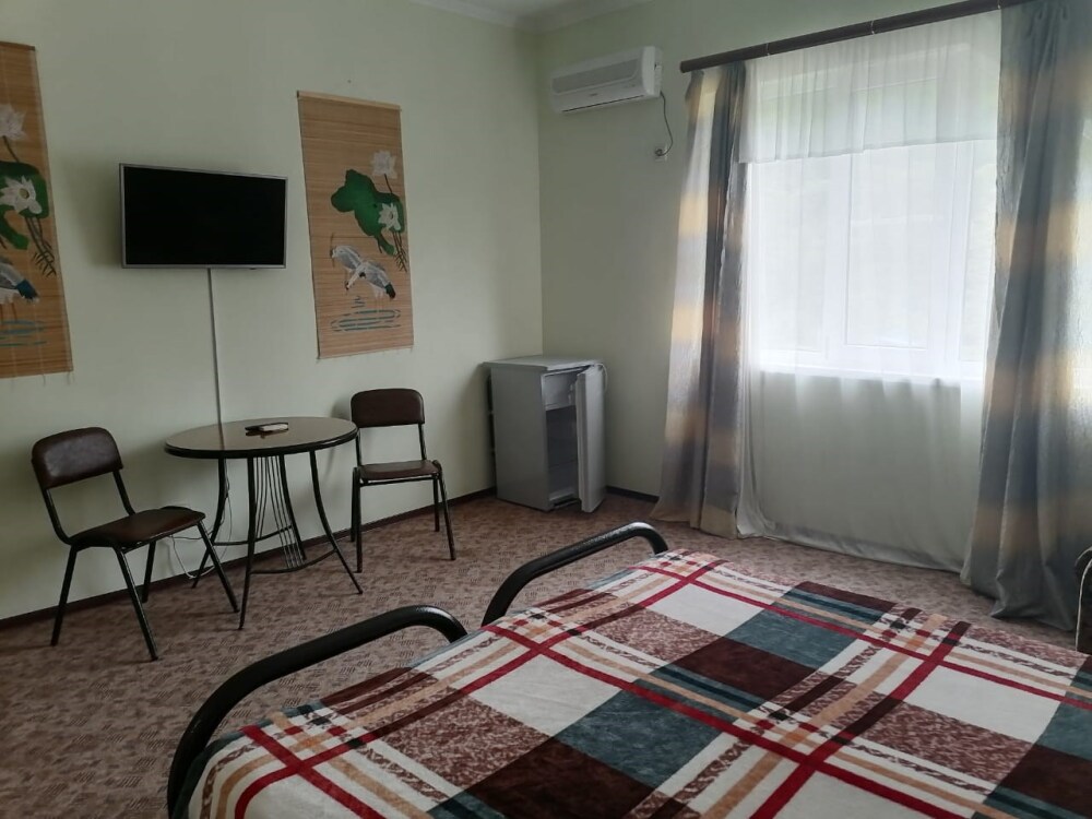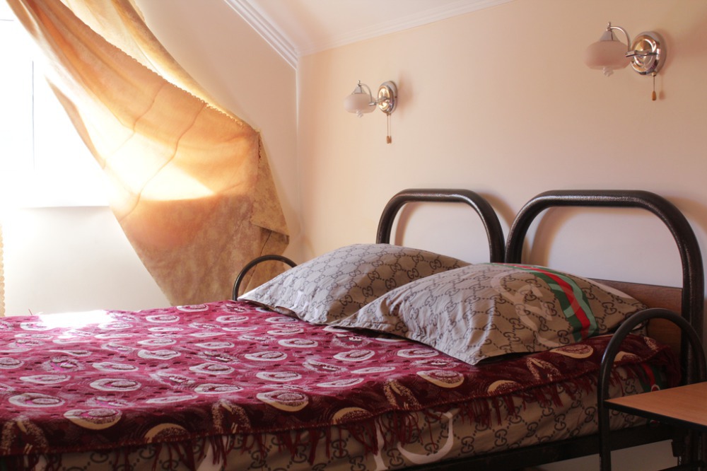 Жилая комната оборудована всем необходимым для проживания: двуспальная кровать, прикроватные тумбочки, телевизор, кондиционер, интернет, холодильник. Имеется шкаф для одежды. Санузел с душевой кабиной на этаже. На этаже три номера