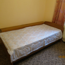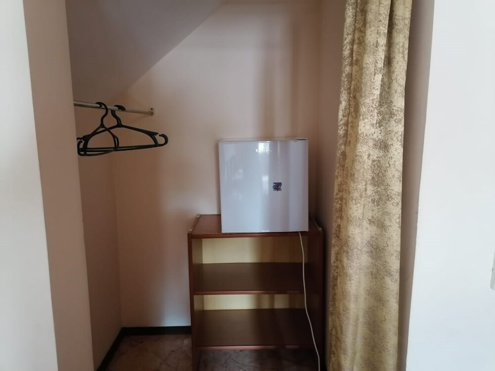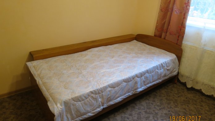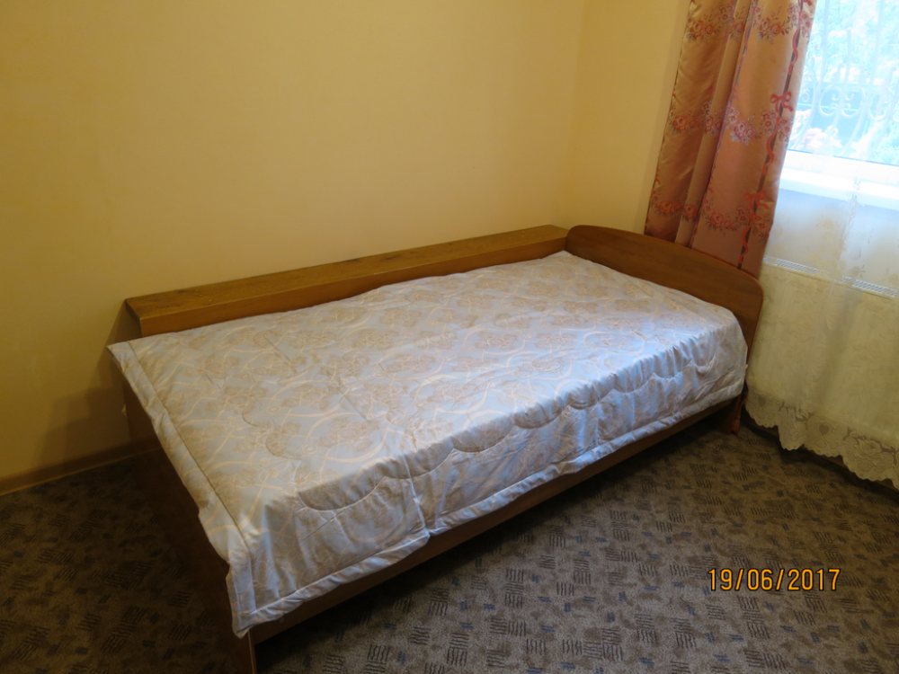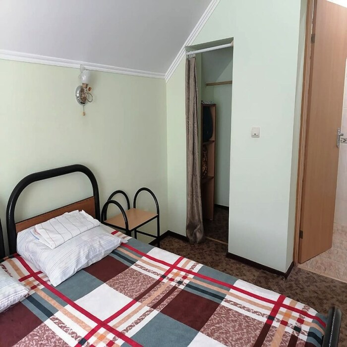 Комната с широкой односпальной кроватью. Оборудована всем необходимым для комфортного проживания: односпальная кровать, прикроватная тумбочка, телевизор, кондиционер, интернет. Имеется гардеробное помещение с вешалками для одежды и полкой для багажа и обуви. Санузел с душевой кабиной, раковиной и унитазом на этаже. Комната расположена на втором этаже. На этаже 3 комнаты.