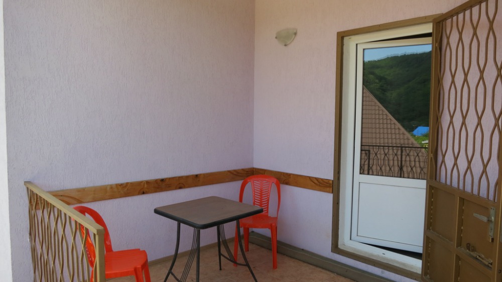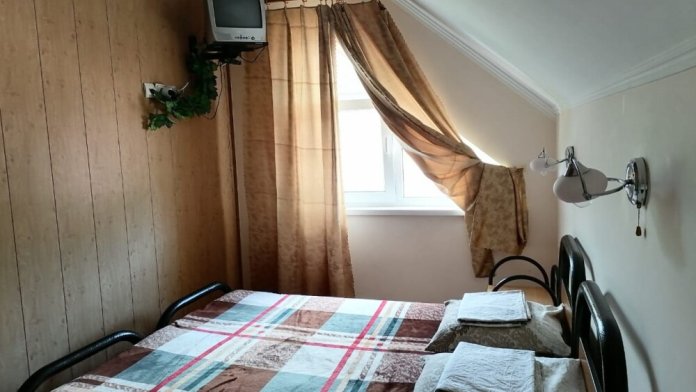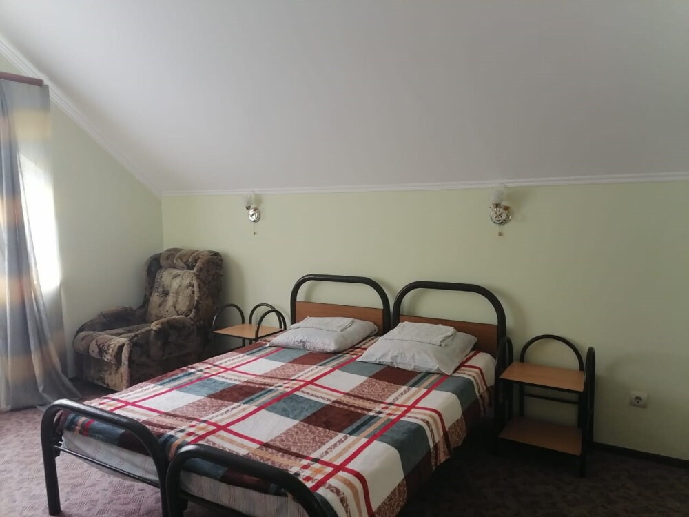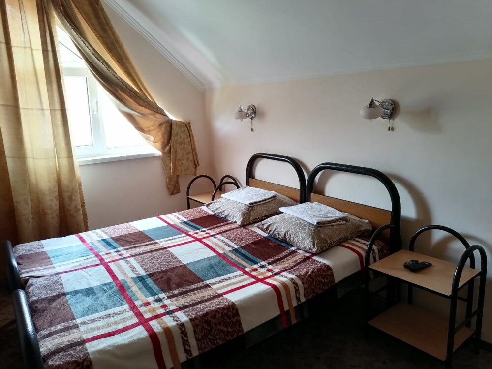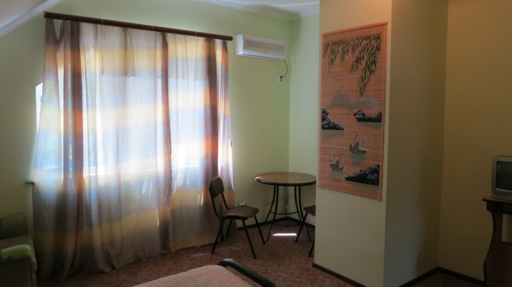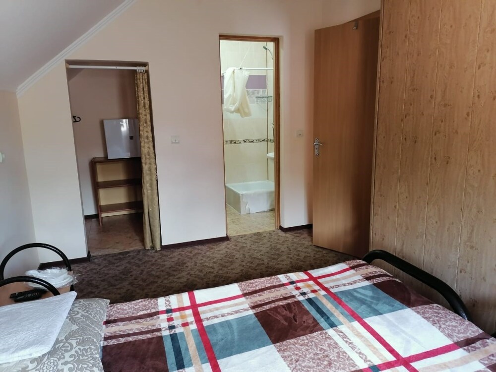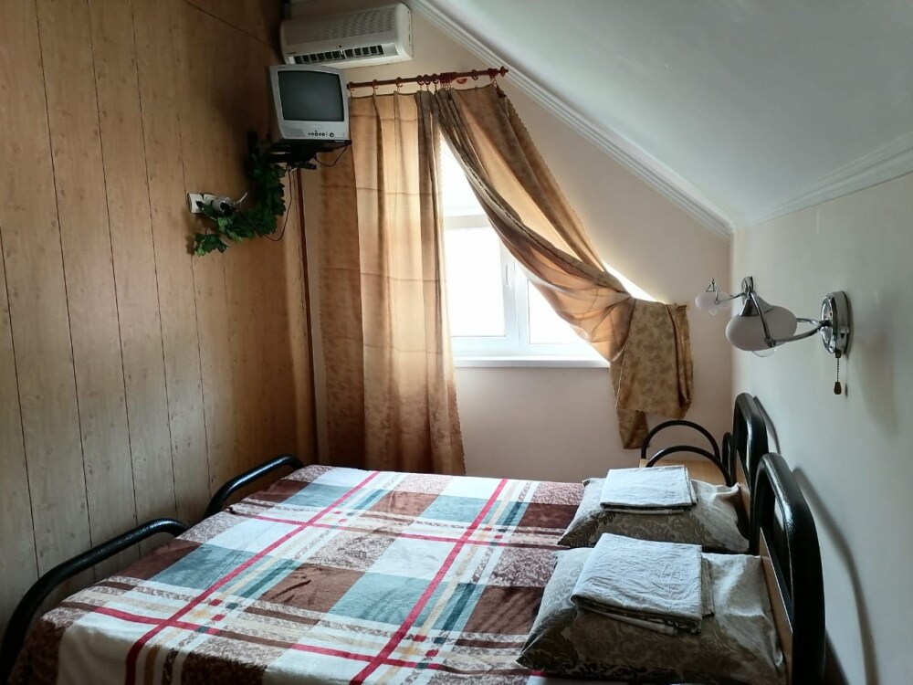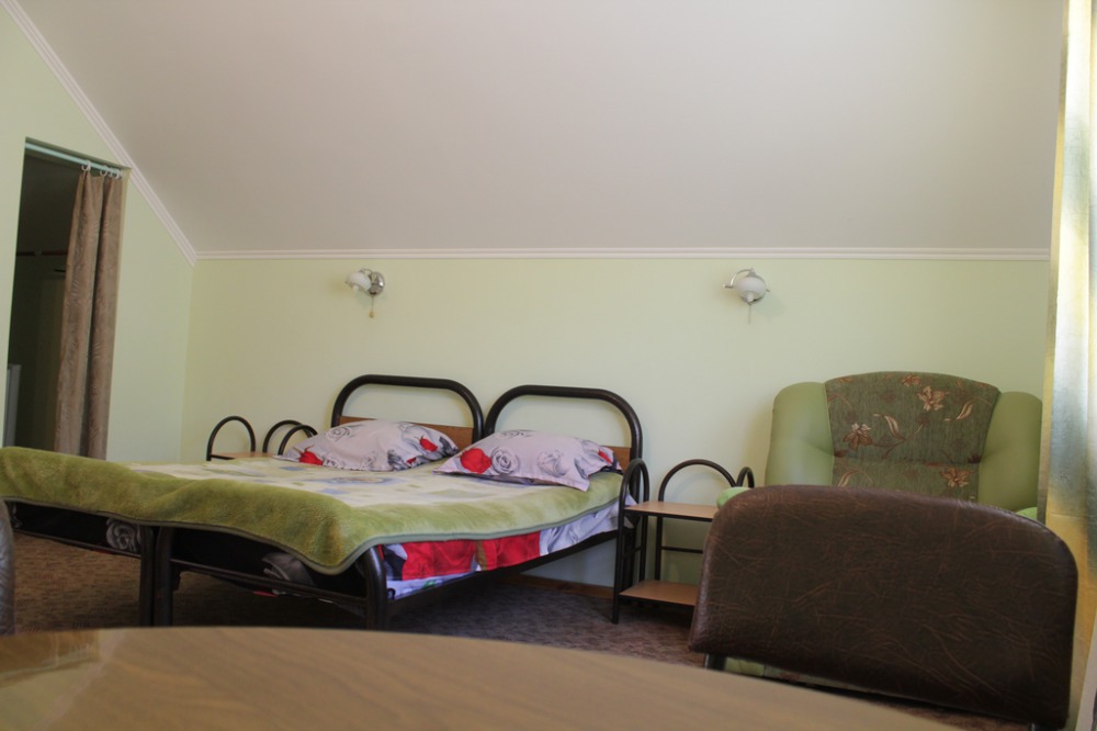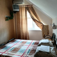 Комната для 3-х человек оборудована всем необходимым для комфортного проживания: двуспальная кровать, кресло-кровать, прикроватные тумбочки, телевизор, кондиционер, интернет, холодильник. Имеется гардеробное помещение с вешалками для одежды и полкой для багажа и обуви. В номере душ и санузел. По желанию, можно разместить дополнительное спальное место. Расположена на втором этаже. Есть балкон на мансарде. Прекрасный вид на кавказские горы.