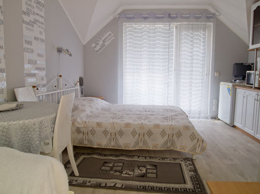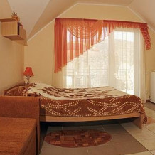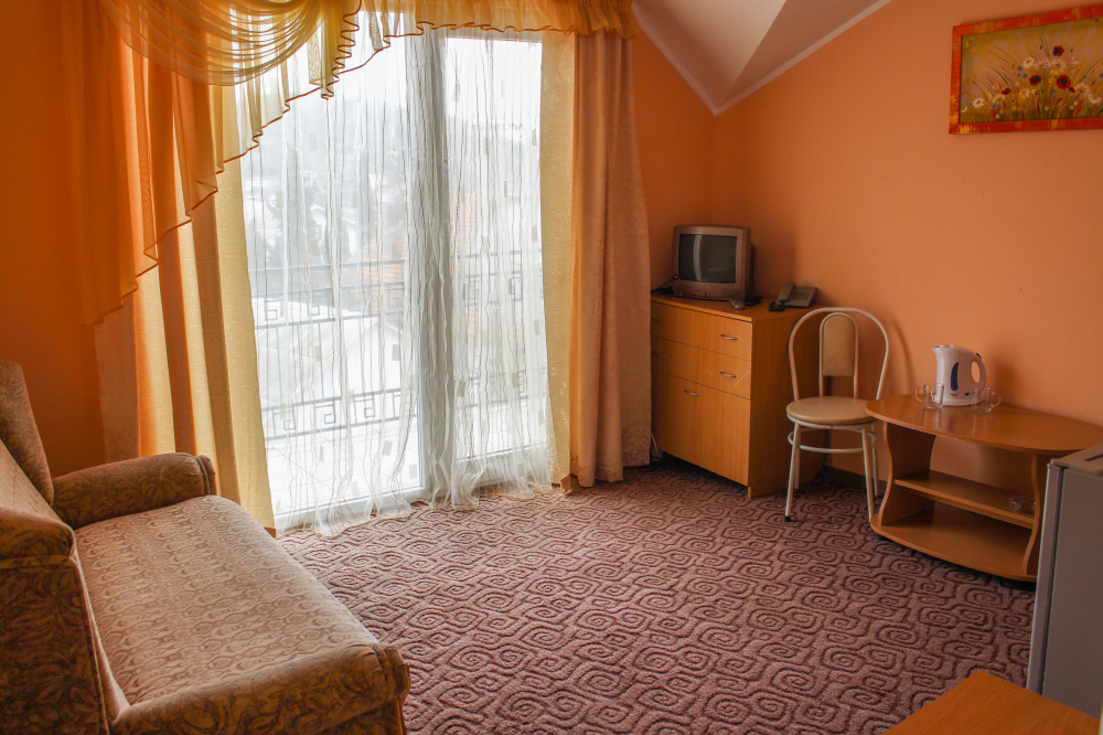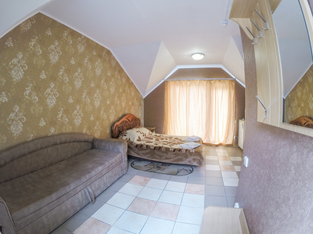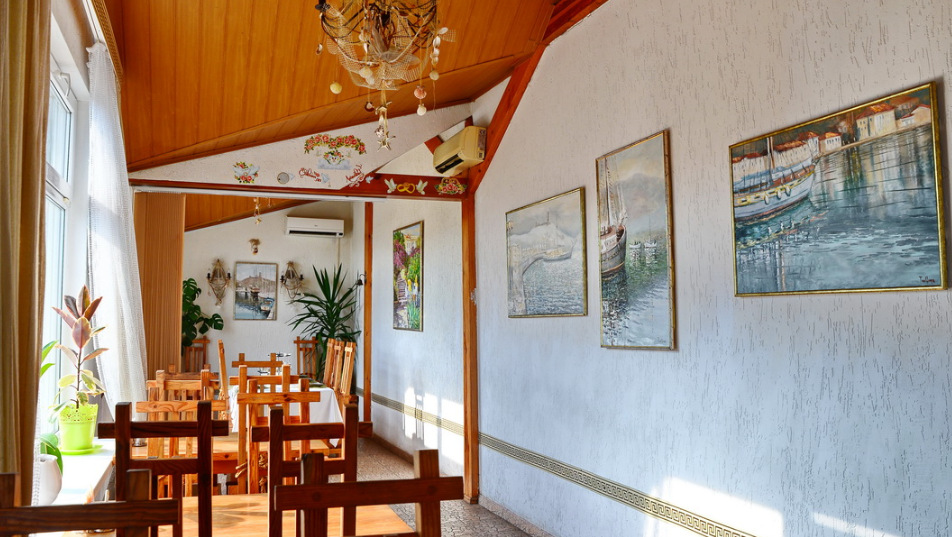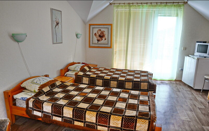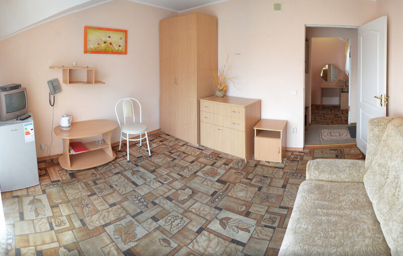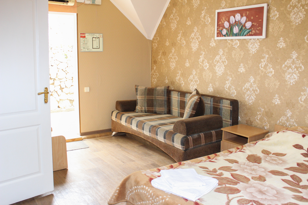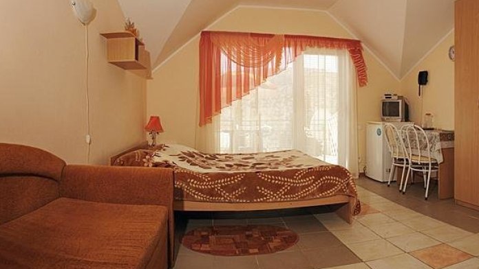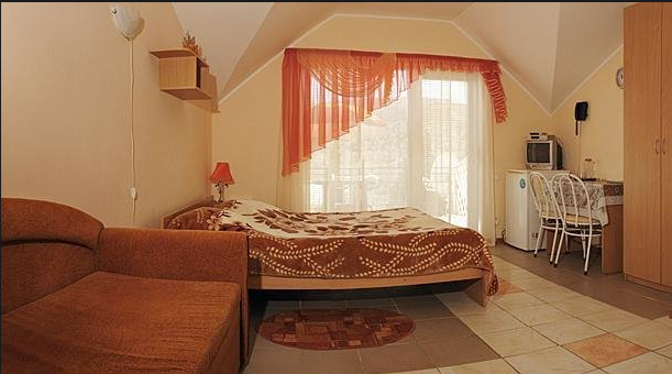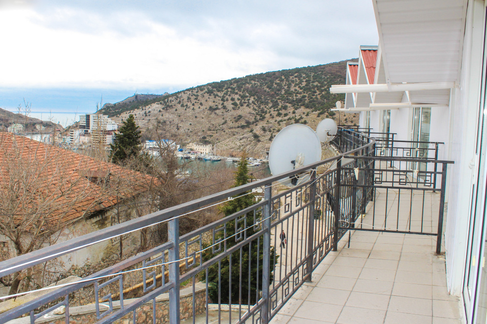 Отдельные однокомнатные домики площадью 18-20 кв.м. на 2-3 человека со всеми удобствами (душ, туалет, телевизор, холодильник, кондиционер, чайник). Перед каждым домиком своя огороженная терраса площадью от 16 до 18 кв.м. с видом на Балаклавскую бухту. Спальные места: две односпальные кровати и раскладной диван. В некоторых номерах два раскладных двухместных дивана. Горячая и холодная вода круглосуточно.