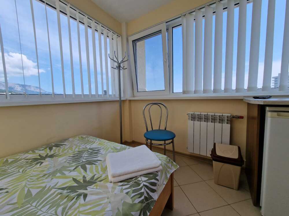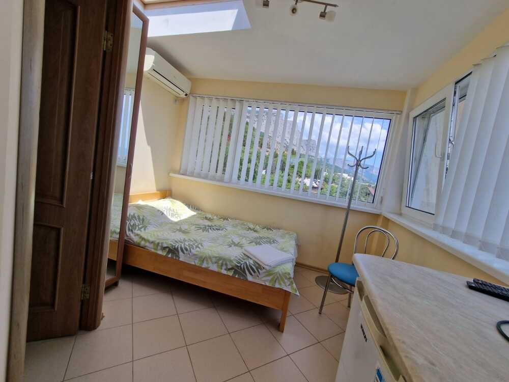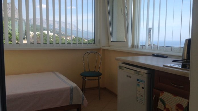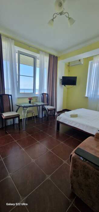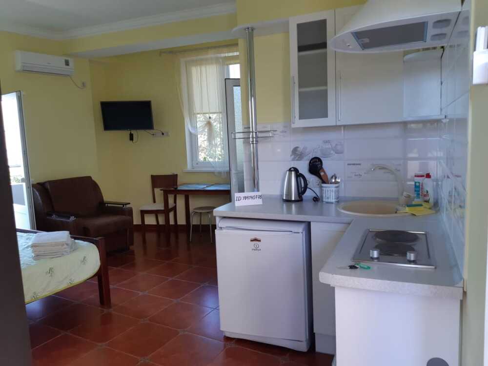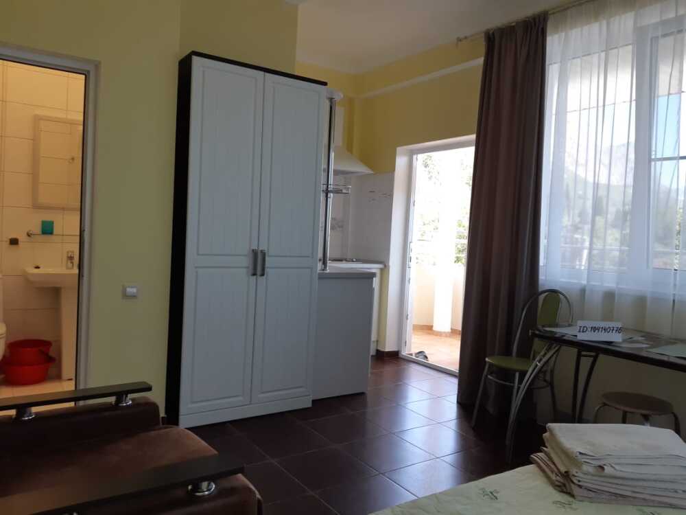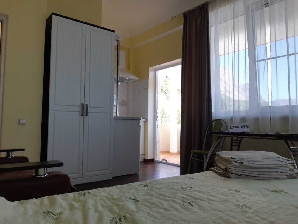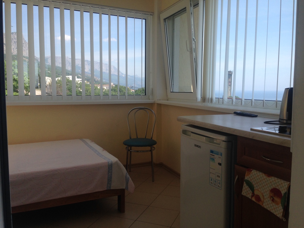 Номер студия расположен на третьем этаже. Вид на море и горы. В номере могут разместиться до трёх человек. В номере есть кухня со всеми необходимыми кухонными принадлежностями.
