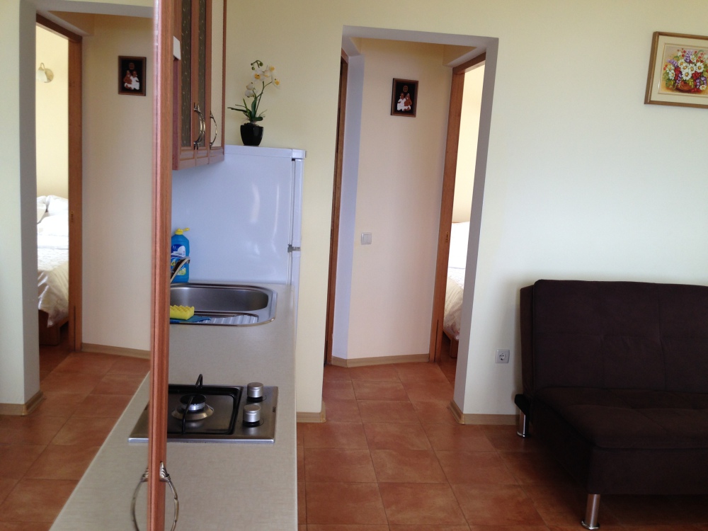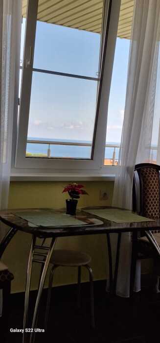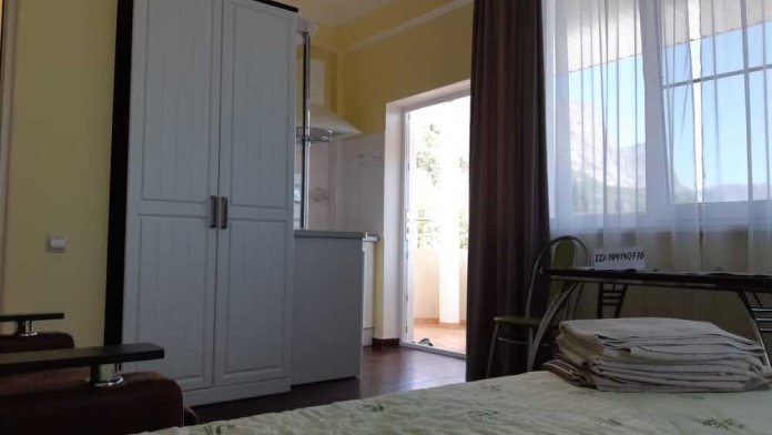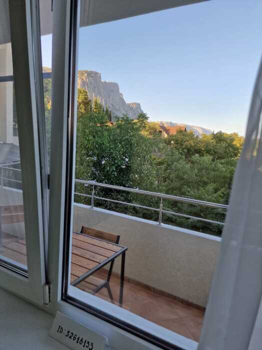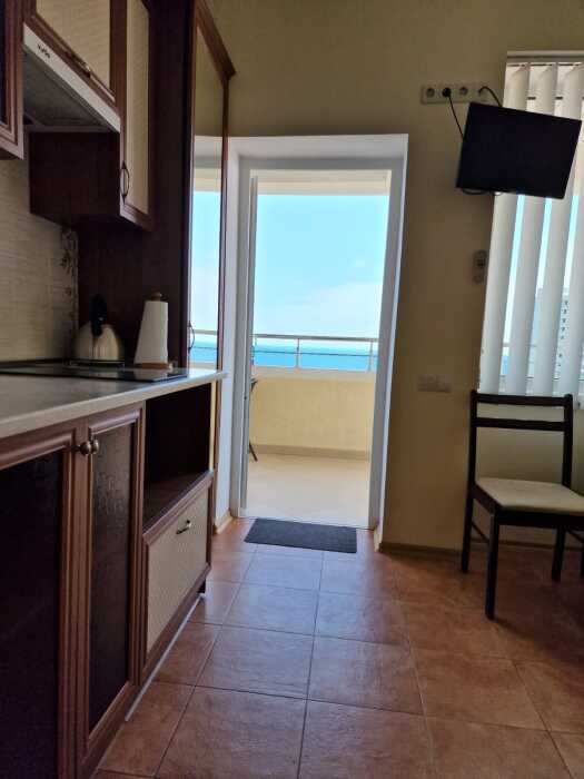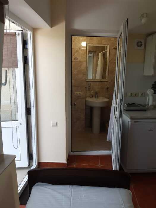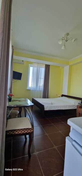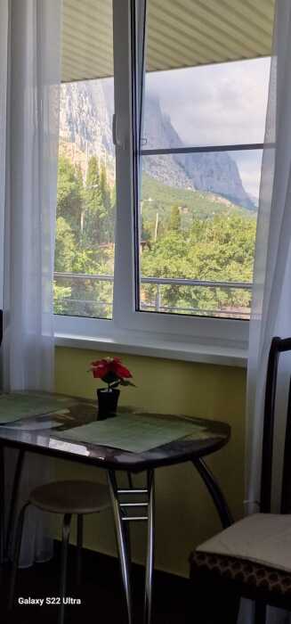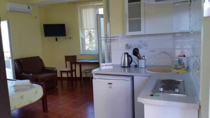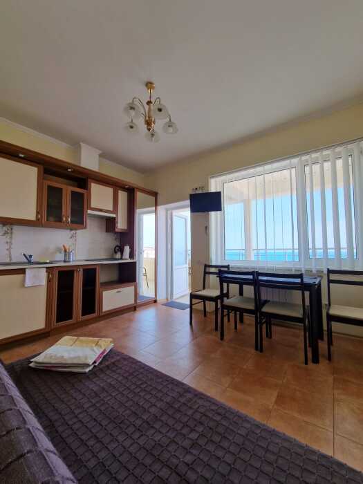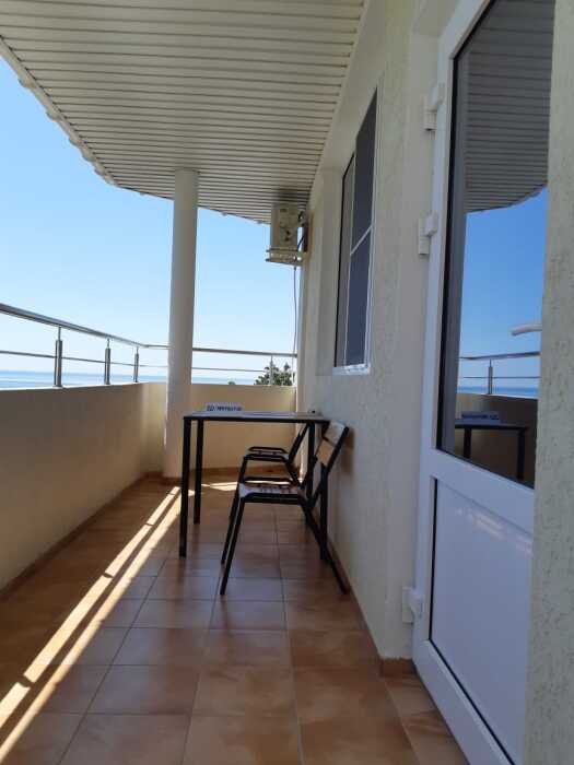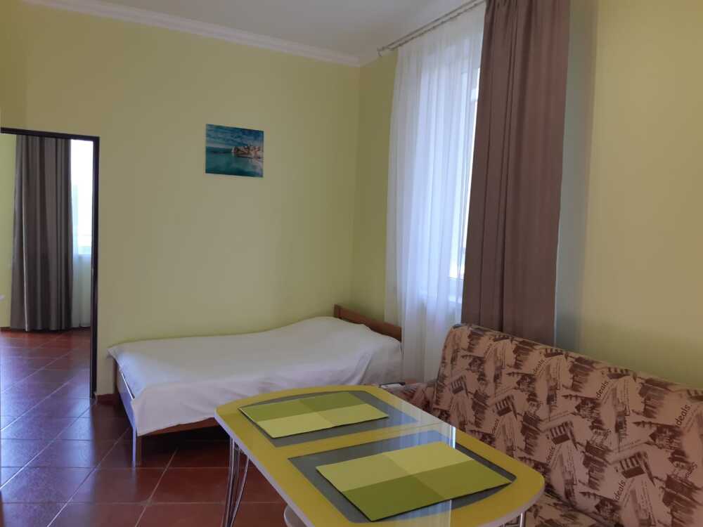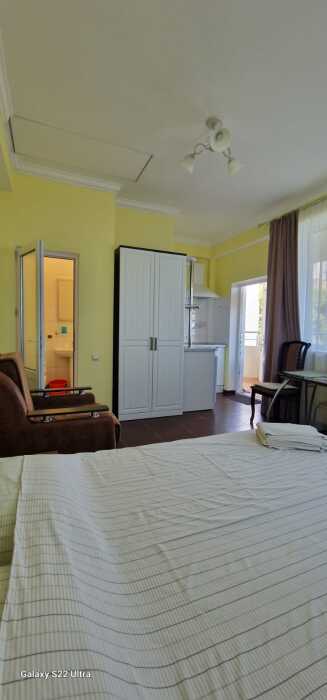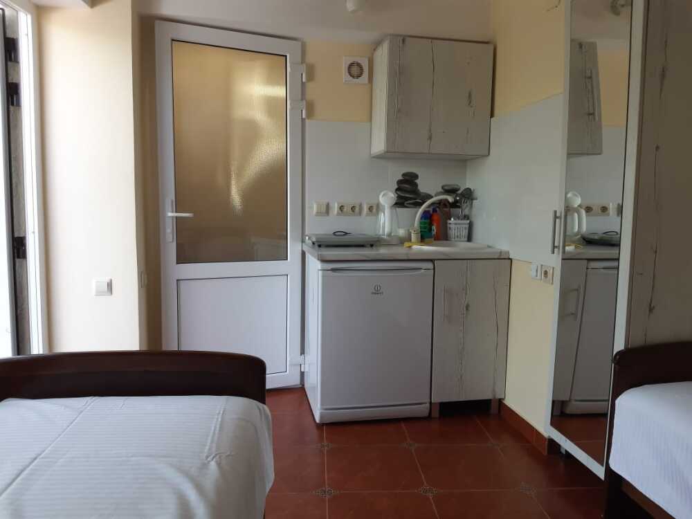 Номер студия расположен на третьем этаже. Вид на море и горы. В номере могут разместиться до трёх человек. В номере есть кухня со всеми необходимыми кухонными принадлежностями.