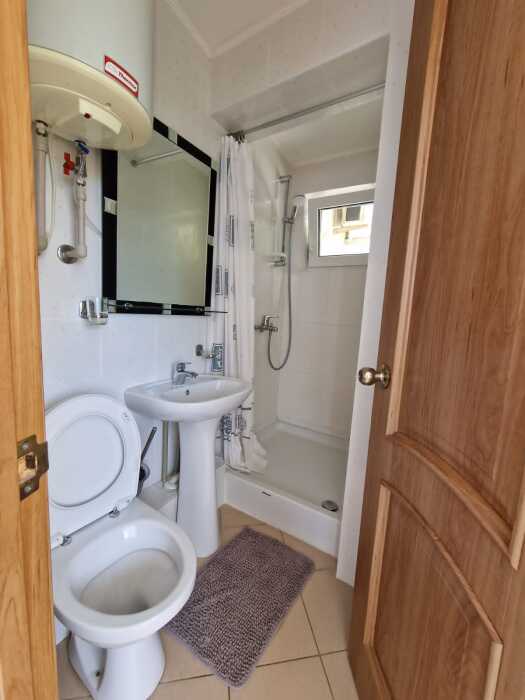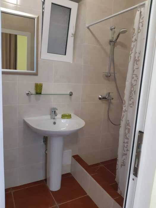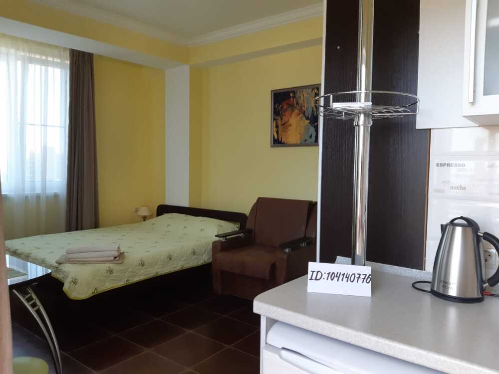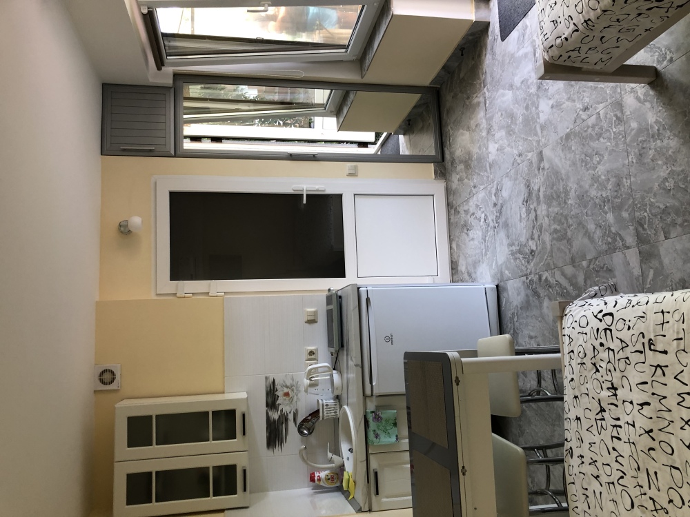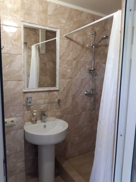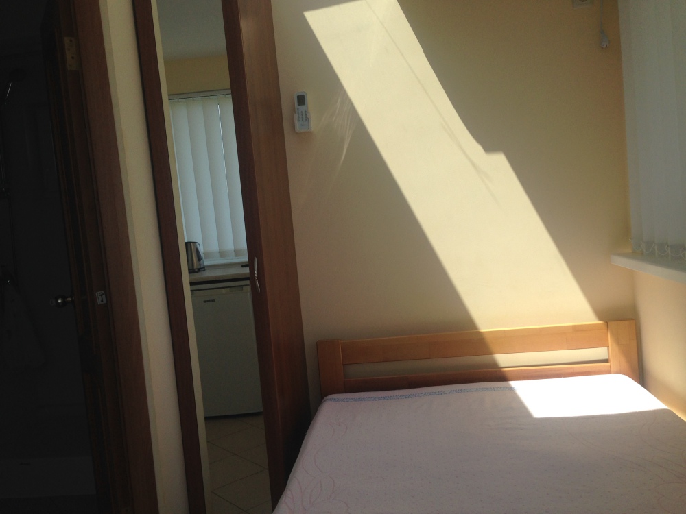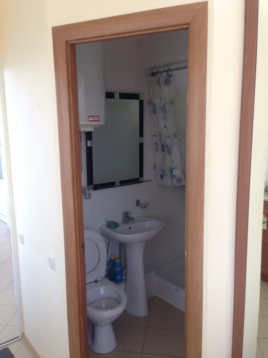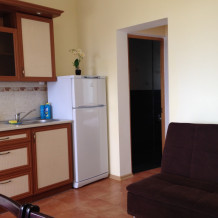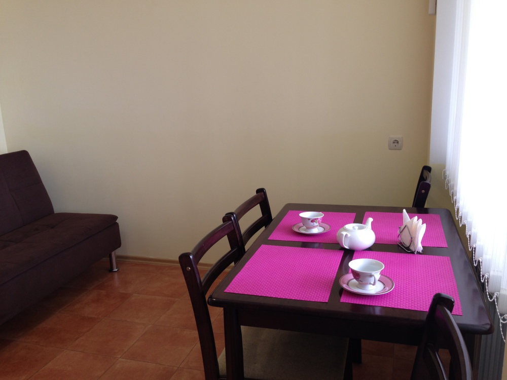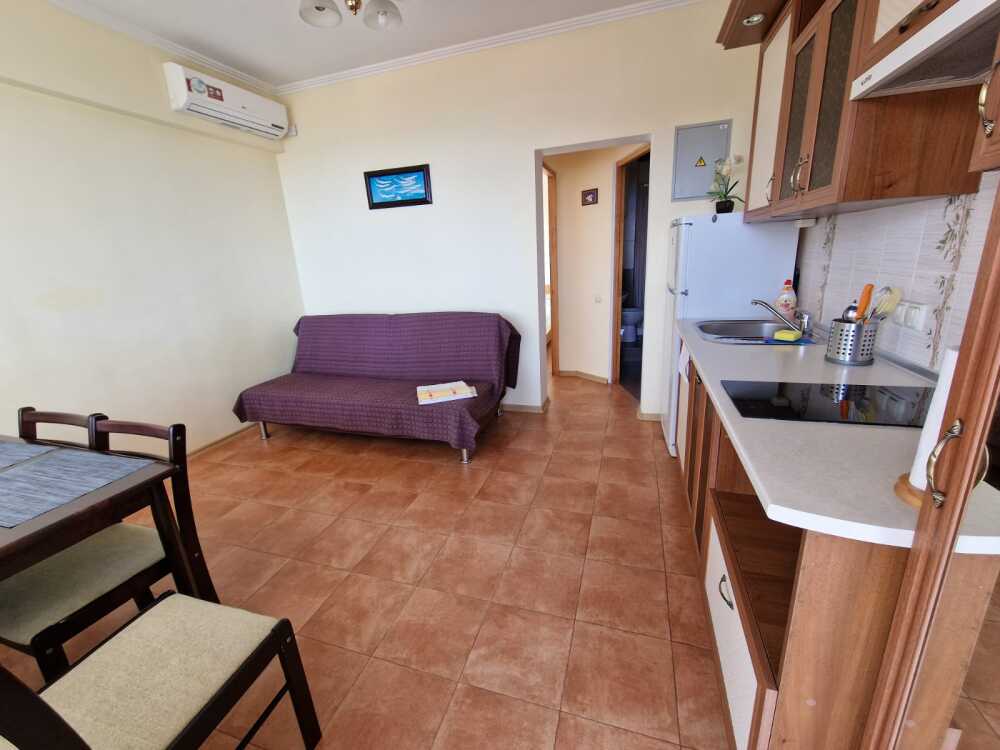 Номер студия расположен на третьем этаже. Вид на море и горы. В номере могут разместиться до трёх человек. В номере есть кухня со всеми необходимыми кухонными принадлежностями.