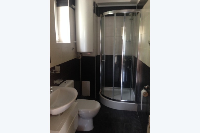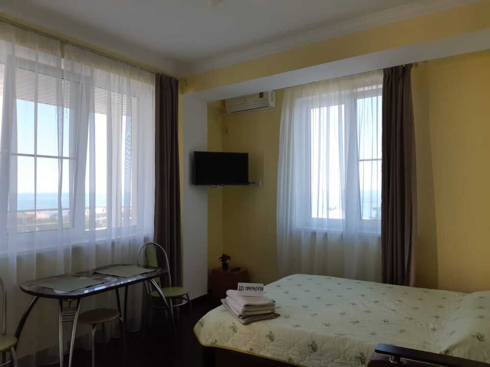 Номер студия расположен на третьем этаже. В номере двухспальная кровать и кресло-кровать, кухня со всеми необходимыми принадлежностями, санузел, телевизор, кондиционер, балкон, вид на море и горы.