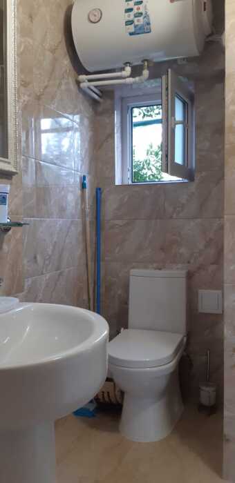 Номер расположен на втором этаже, отдельный вход, балкон. В номере две двухспальные кровати и диван, могут расположиться до пяти человек. Санузел, кухня со всеми необходимыми кухонными принадлежностями.