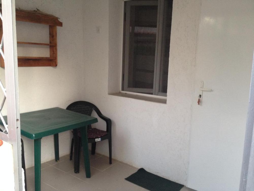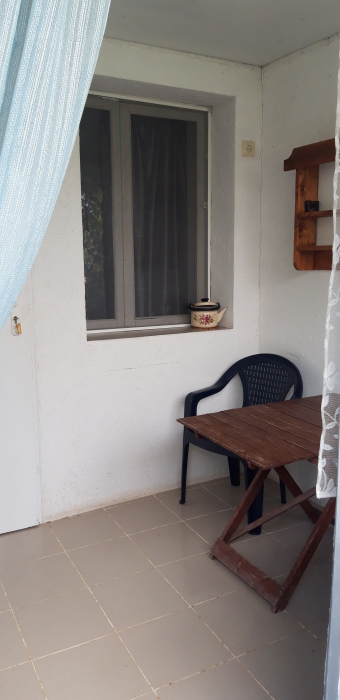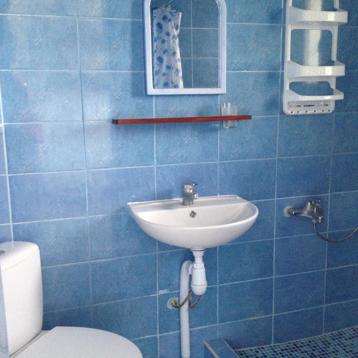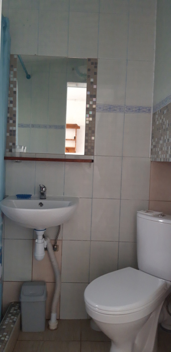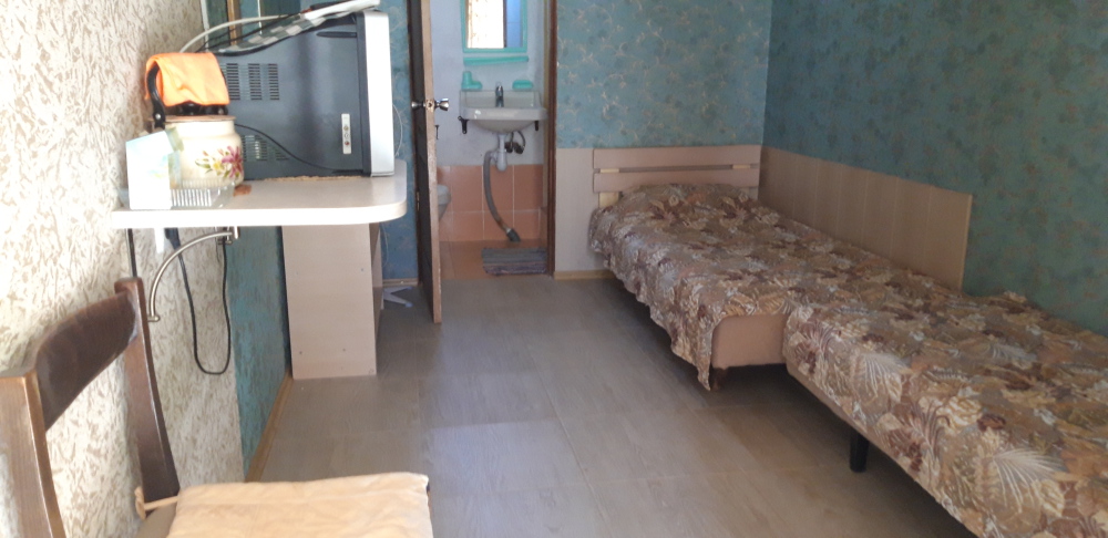 В номере: санузел, телевизор, вентилятор, у номера личный столик со стульями.
