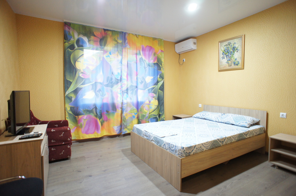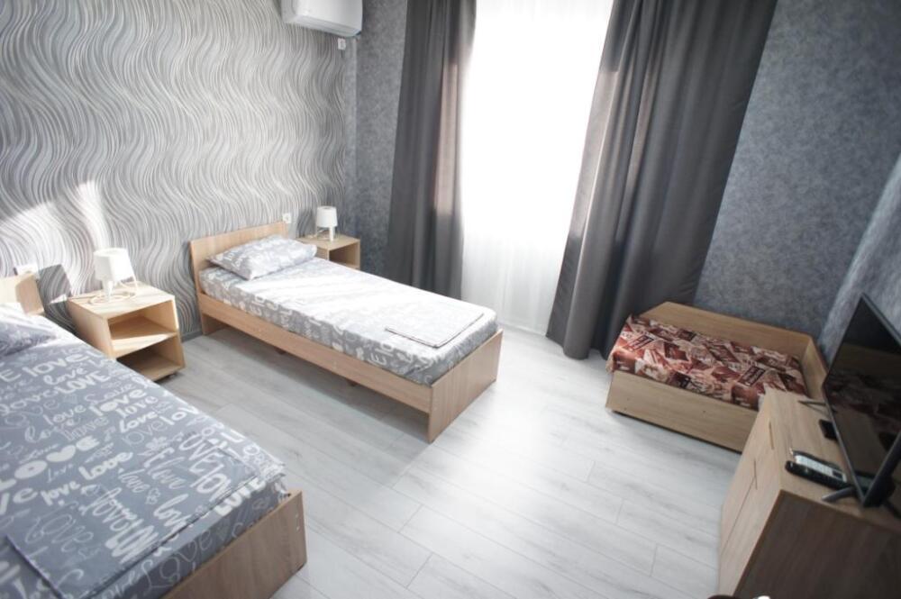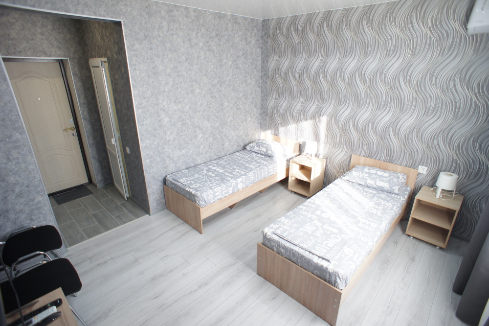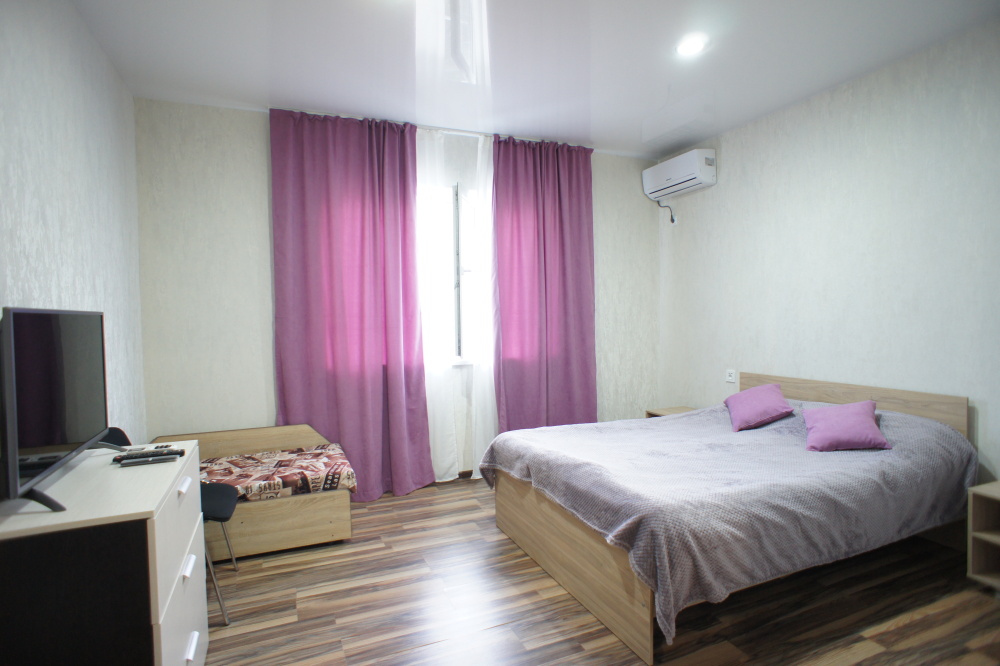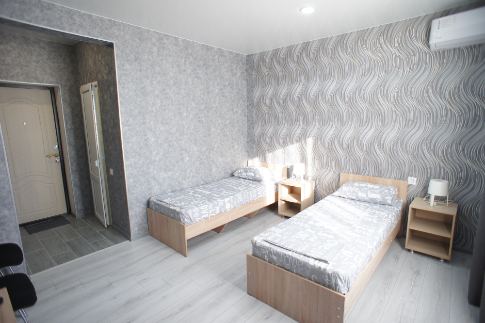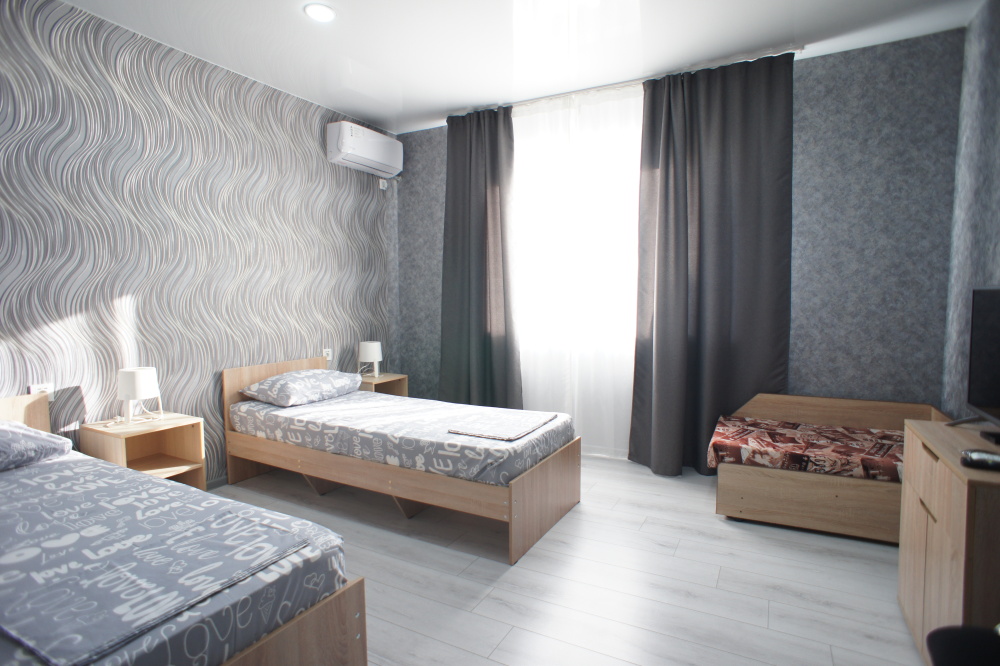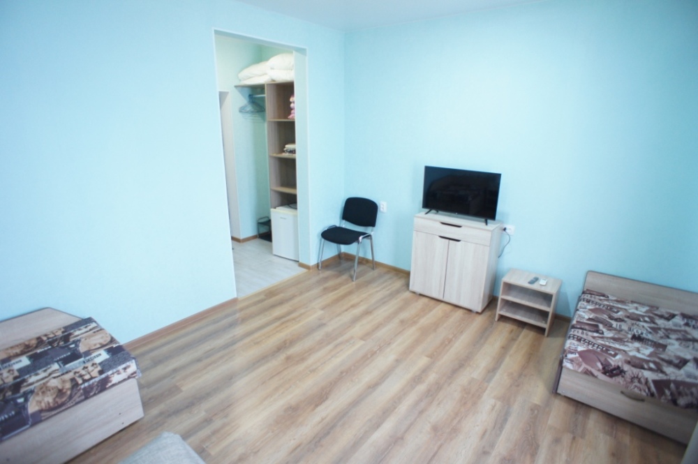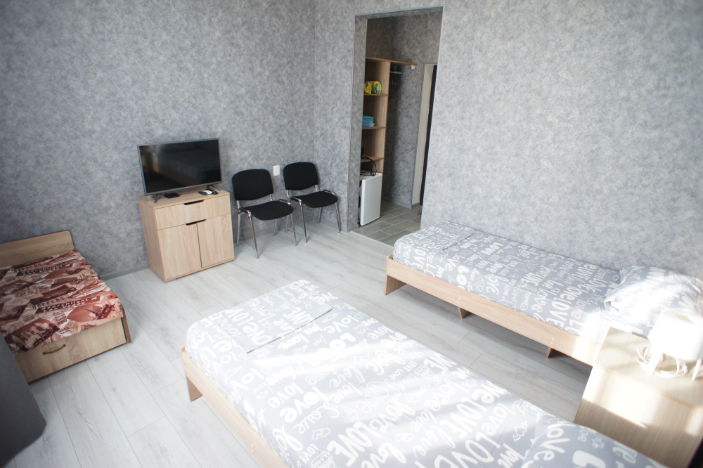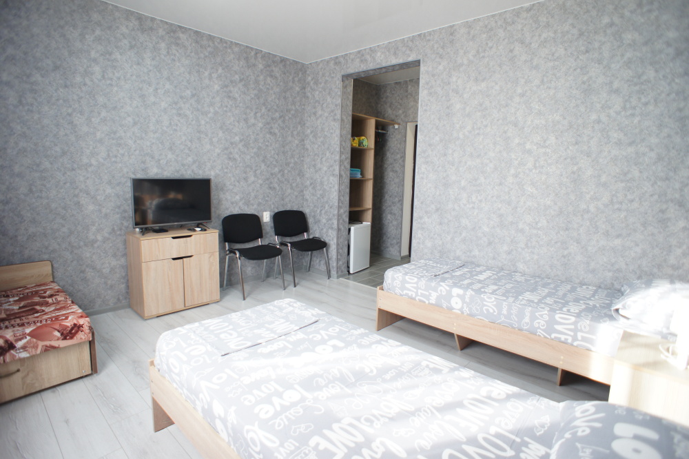 4-х местный Семейный номер 20 кв.м. -двуспальная кровать, и 2 односпальных , шкаф-купе, тумба под тв , 2 тумбочки, телевизор, кондиционер, спутниковое тв, санузел (душ, унитаз, раковина).