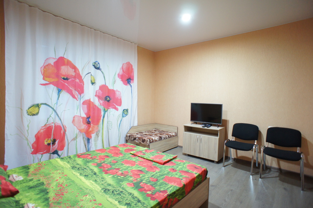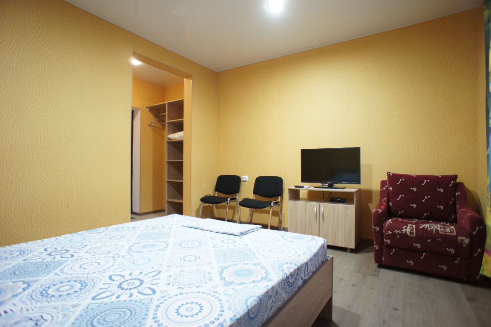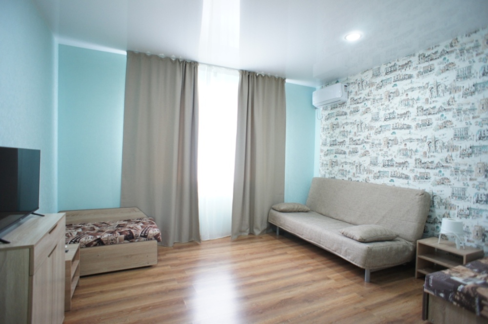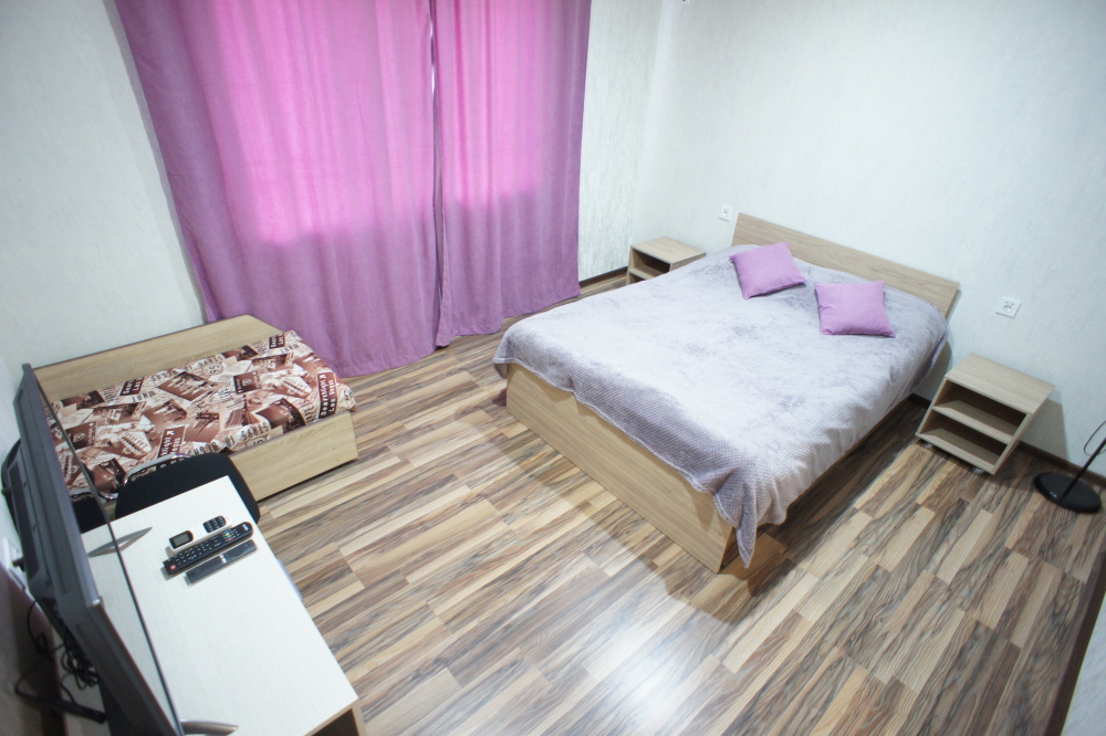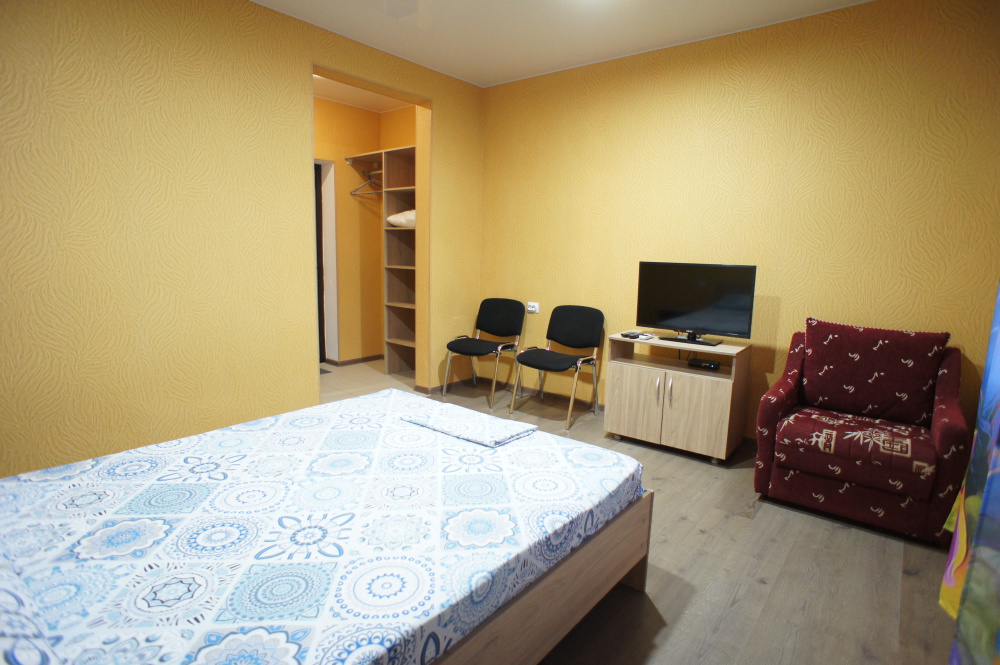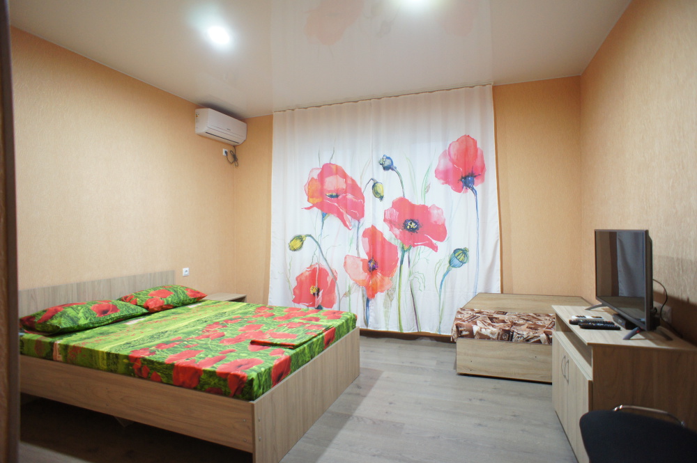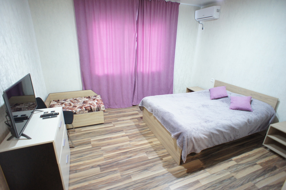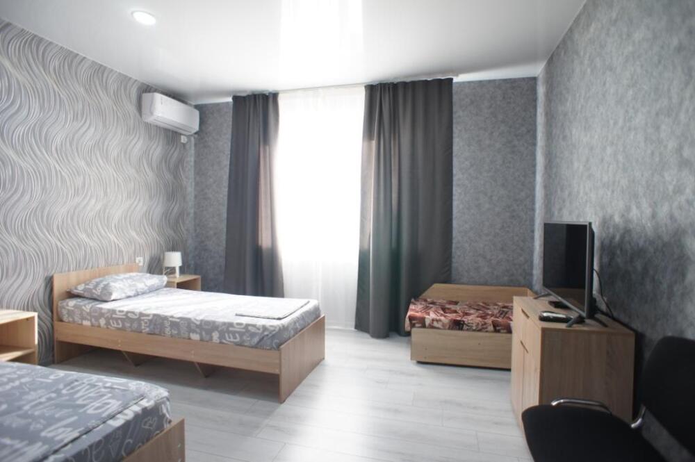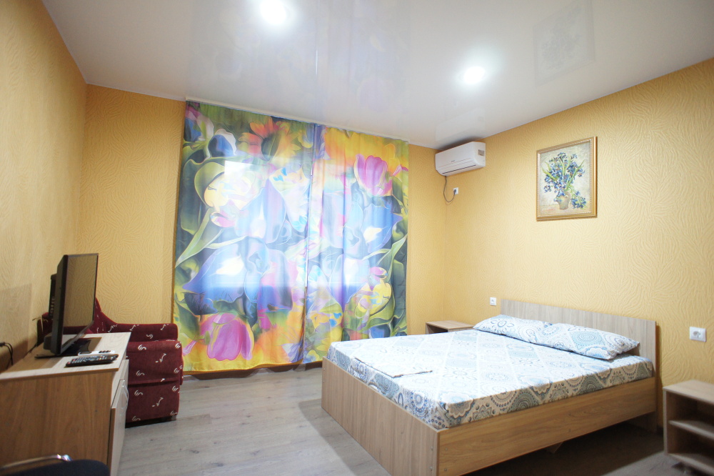 4-х местный Семейный номер 20 кв.м. -двуспальная кровать, и 2 односпальных , шкаф-купе, тумба под тв , 2 тумбочки, телевизор, кондиционер, спутниковое тв, санузел (душ, унитаз, раковина).