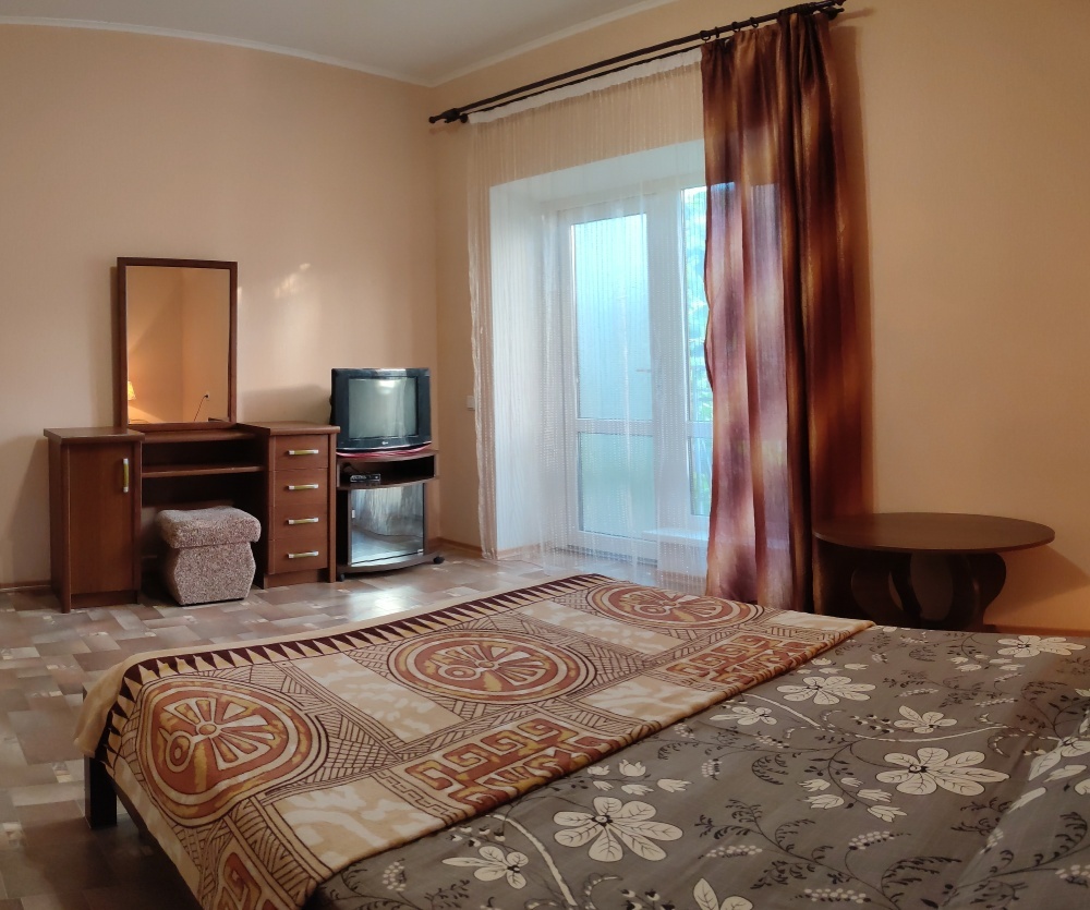 Номер с общим балконом (пластиковая мебель), гардеробная, большая 2-спальная кровать + доп. место (односпальная) оснащен современной мебелью, спутниковым телевидением, кондиционером, холодильником, электрочайником.