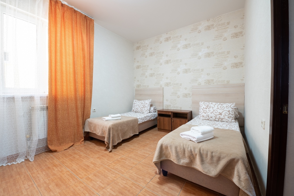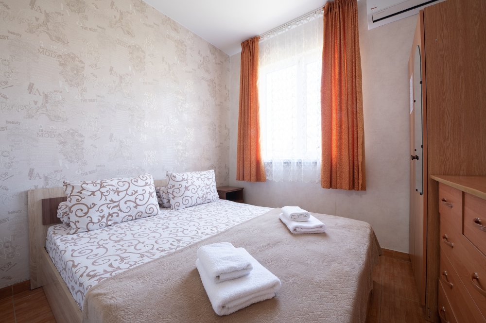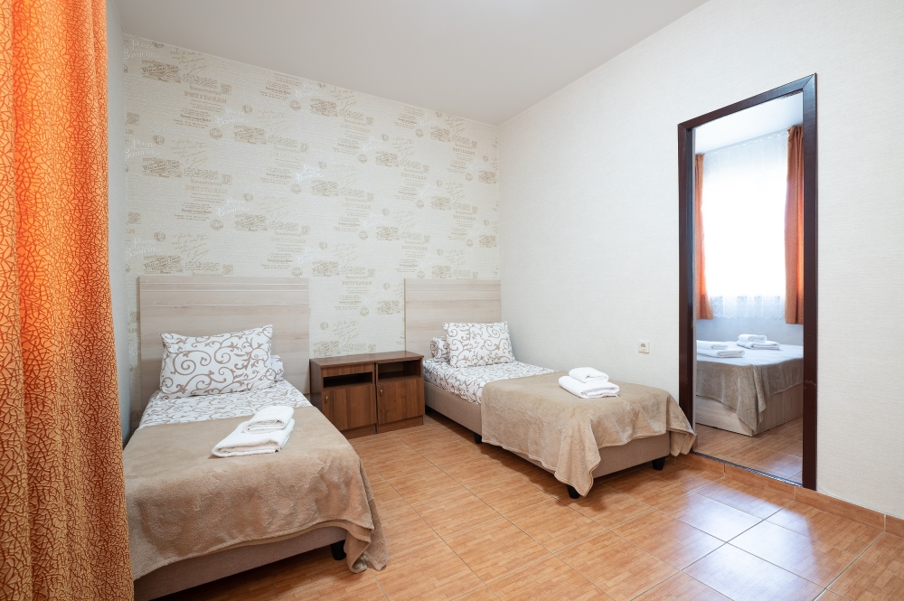 В одной комнате расположена мягкая двуспальная кровать, во второй — две односпальные кровати, что позволяет удобно разместиться гостям.