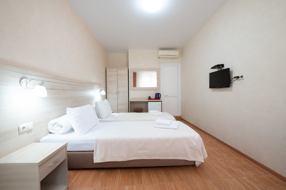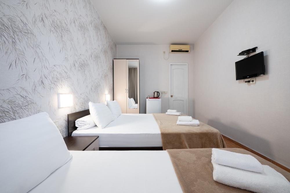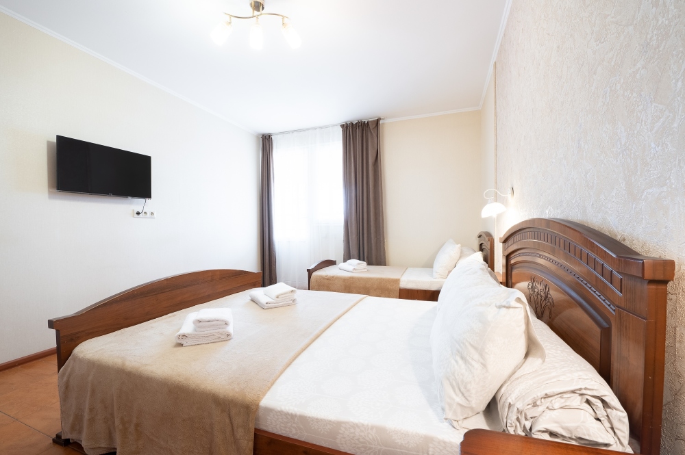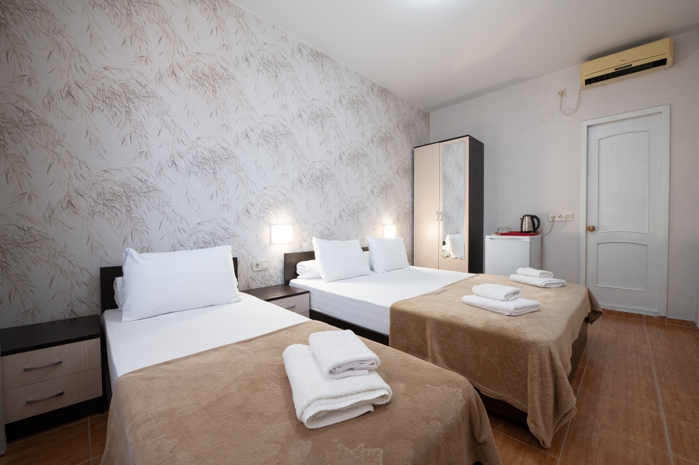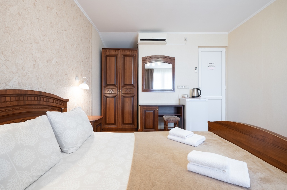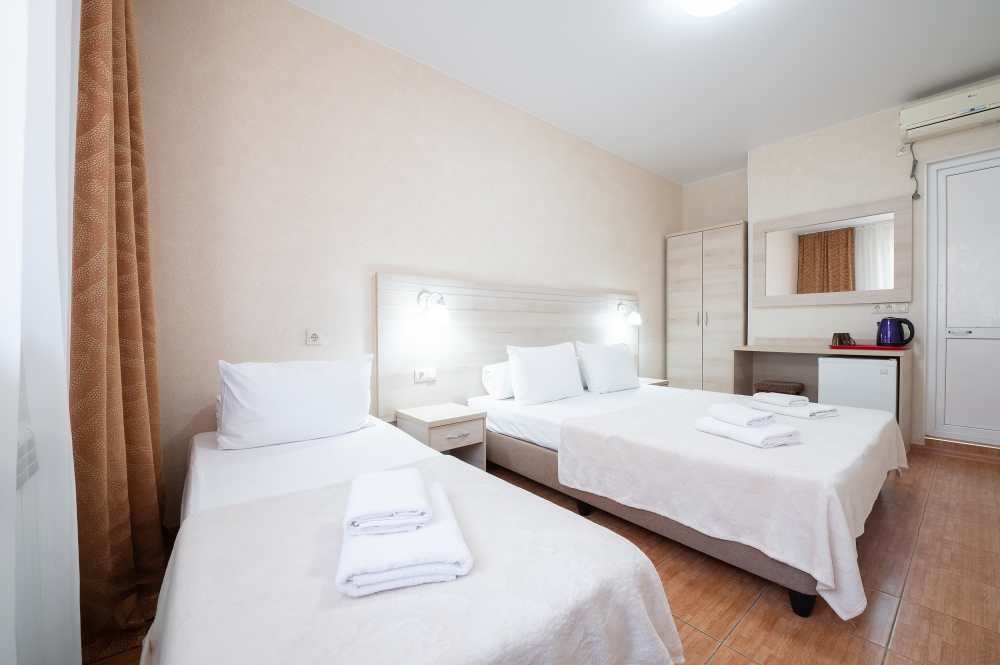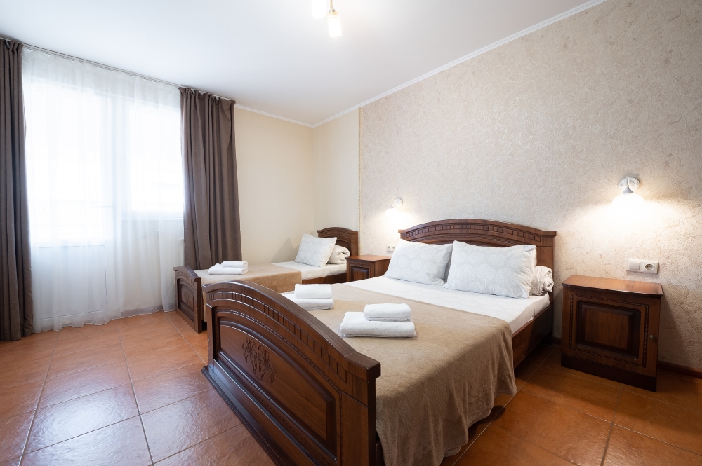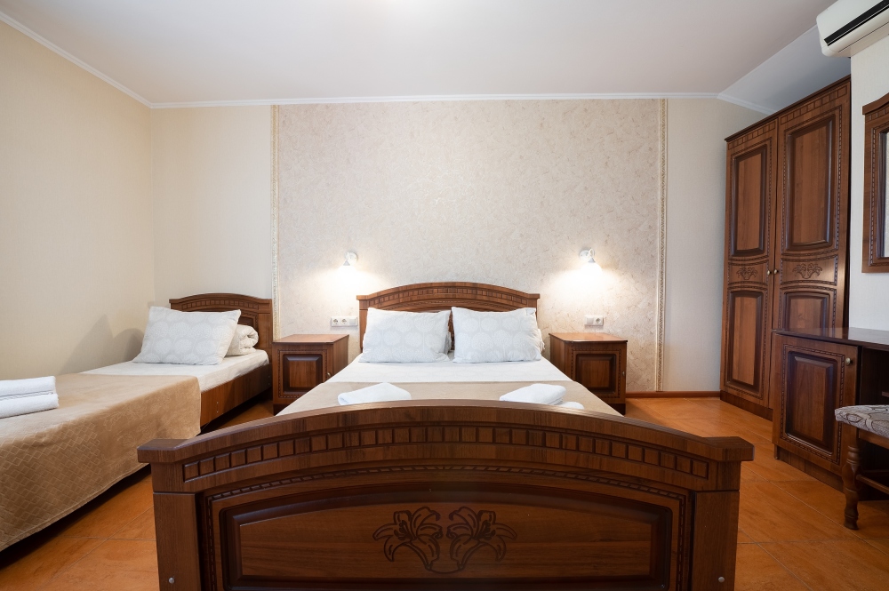Идеальный вариант для комфортного размещения троих гостей. В номере мягкая двуспальная кровать и односпальная кровать, шкаф для одежды, стол, тумба и большое зеркало.