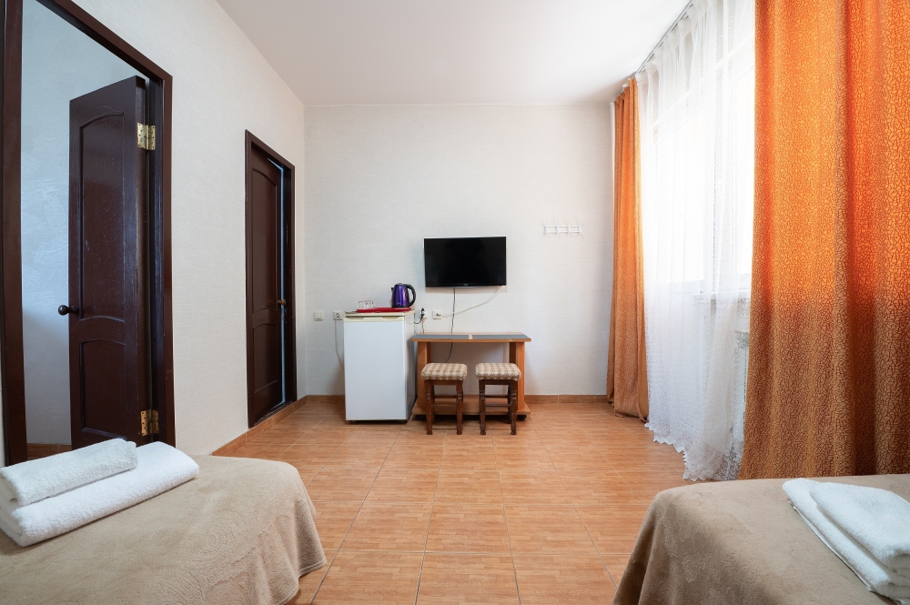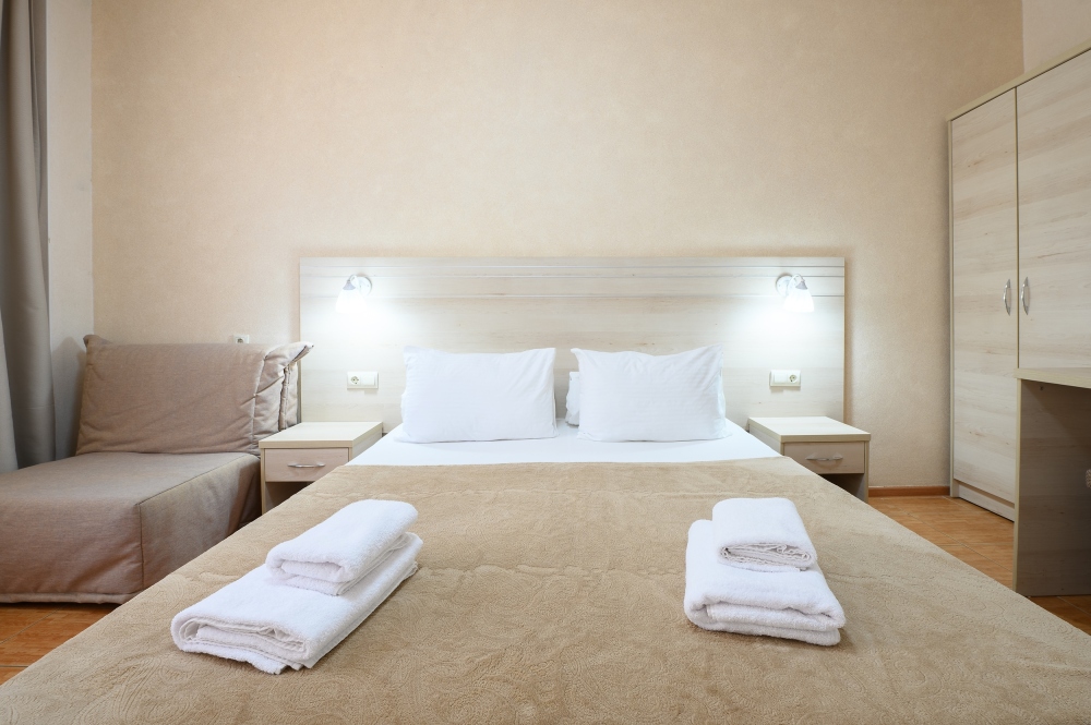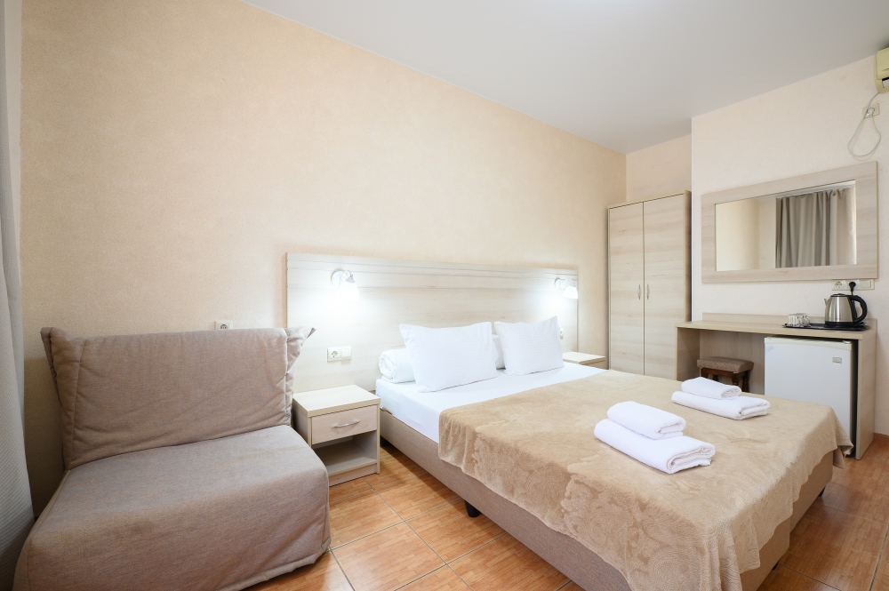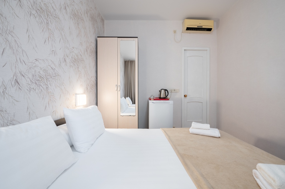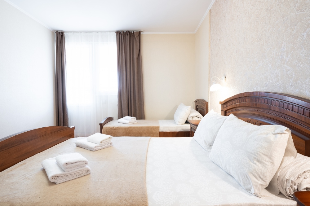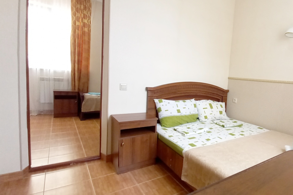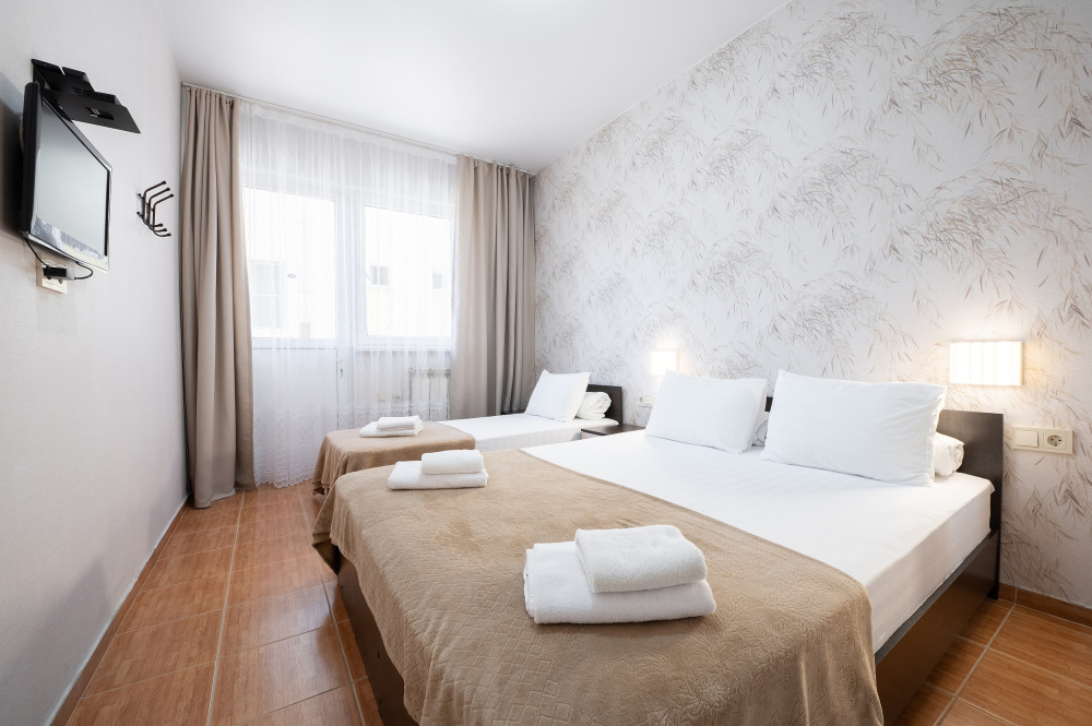 Идеальный вариант для комфортного размещения троих гостей. В номере мягкая двуспальная кровать и односпальная кровать, шкаф для одежды, стол, тумба и большое зеркало.