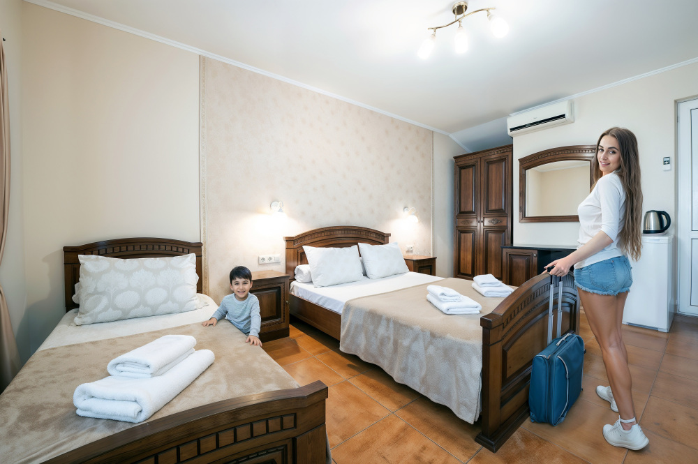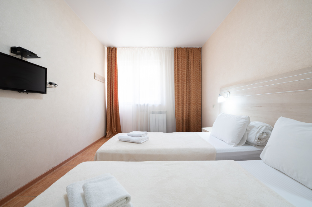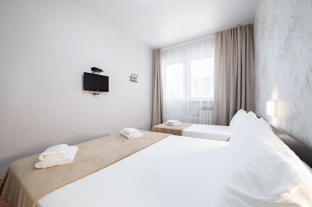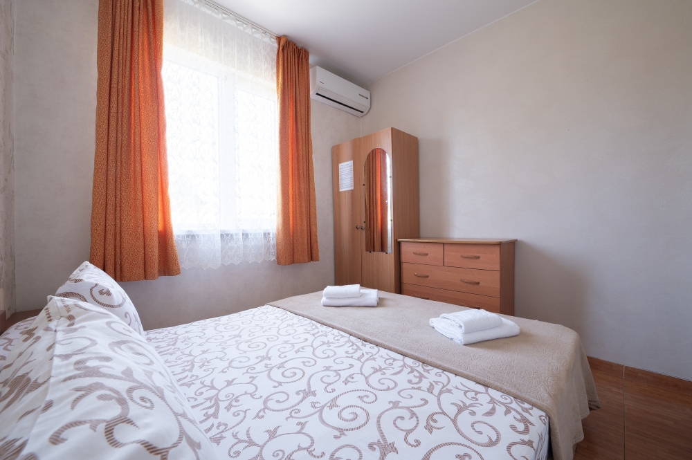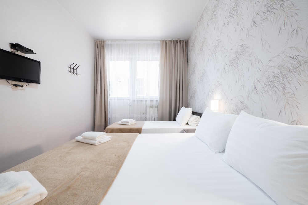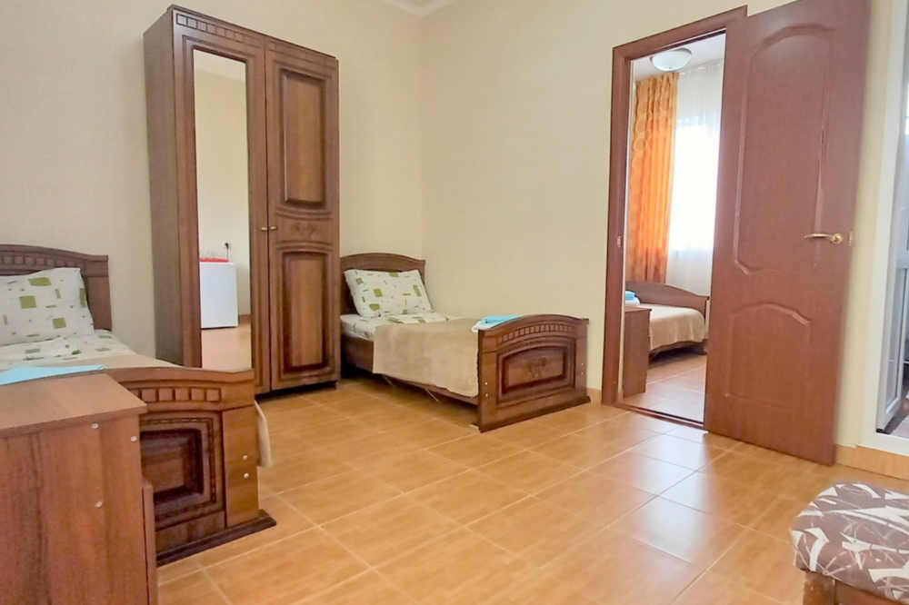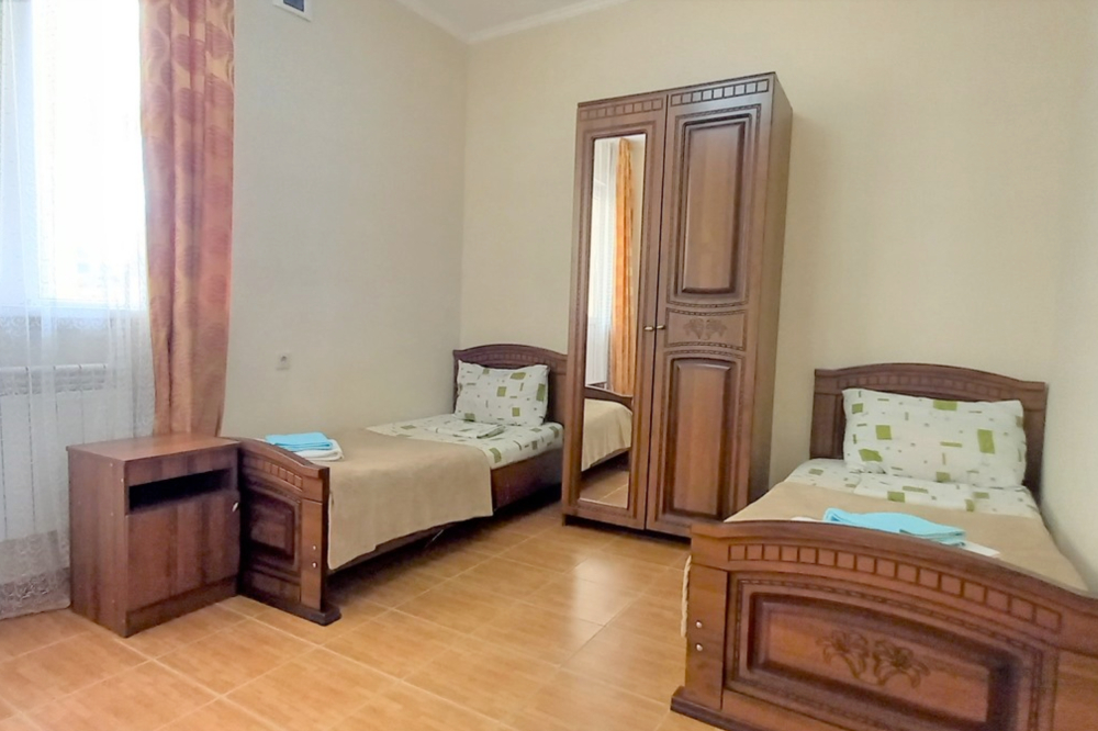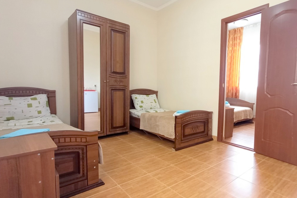 Идеальный вариант для комфортного размещения троих гостей. В номере мягкая двуспальная кровать и односпальная кровать, шкаф для одежды, стол, тумба и большое зеркало.