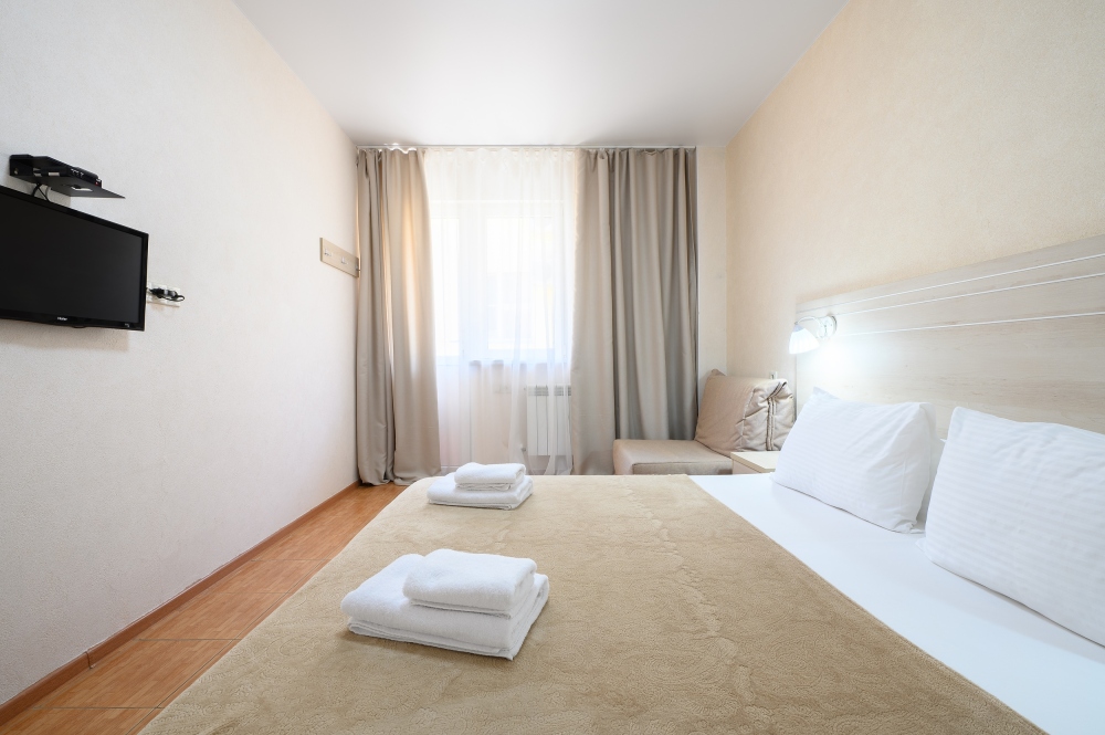 В номере удобная двуспальная кровать или две односпальные кровати, кресло, шкаф для одежды, стол, тумба и большое зеркало.
