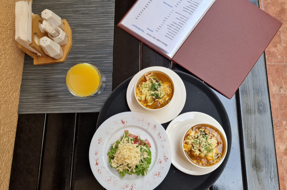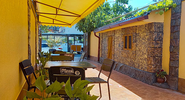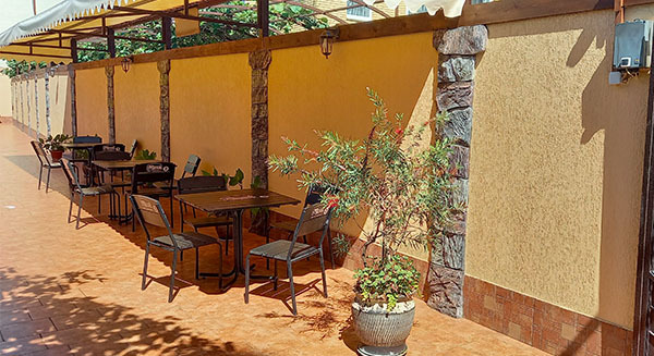 В гостевом доме работает вкусное кафе, с очень доступными ценами. В уютном дворике отеля установлены столики, где Вы сможете отдохнуть вечером от дневной суеты, пожарить шашлык или заказать ужин в нашем кафе, попить вина.