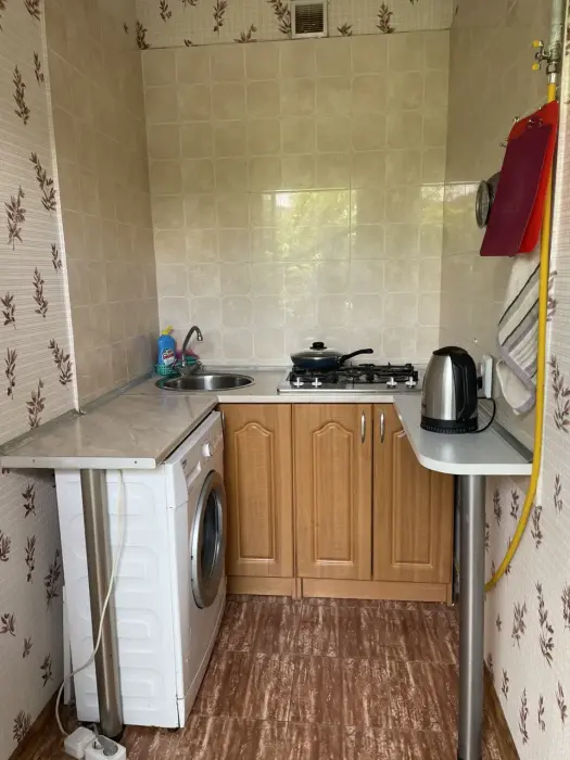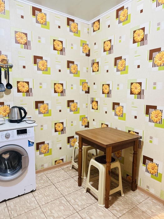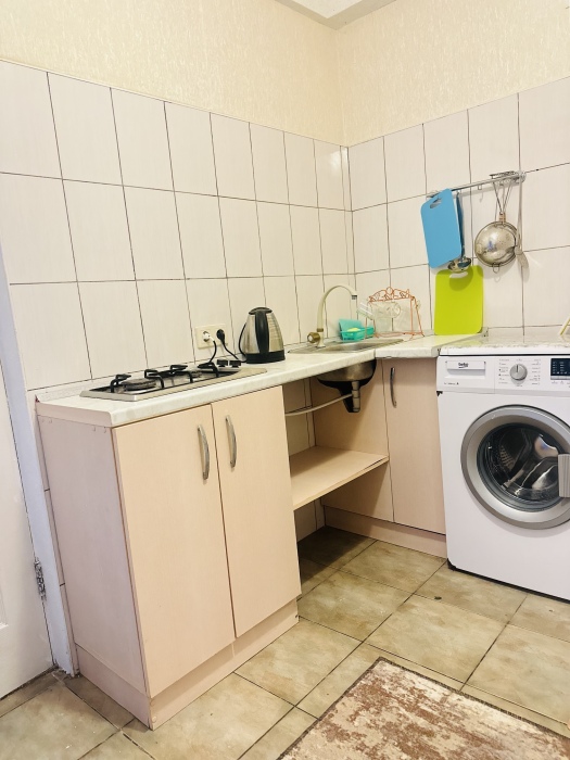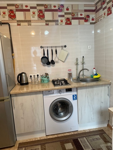 В номере отдельная комфортабельная кухня в которой есть холодильник,кухонный гарнитур,газовая плита,стиральная машина,раковина,столовая посуда, обеденный стол и стулья