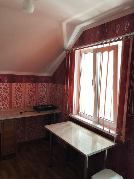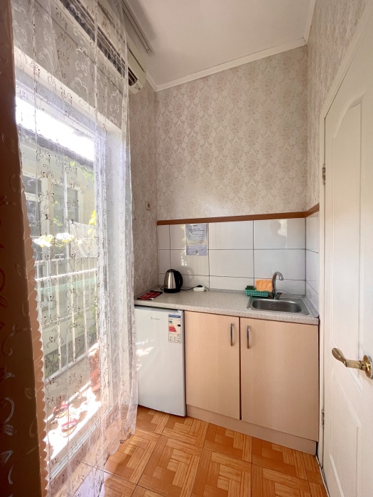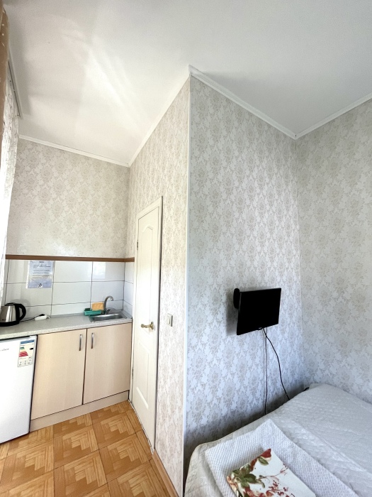 В номере комфортабельная кухня в которой есть холодильник,кухонный гарнитур,газовая плита,раковина,столовая посуда, обеденный стол и стулья.В каждом номере обязательно есть: кондиционер, телевизор, шкаф, комод, зеркало, душевая кабина,умывальник, туалет.