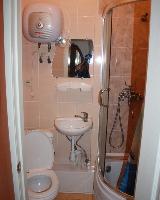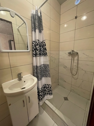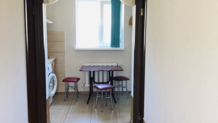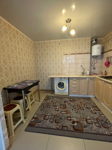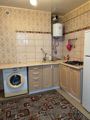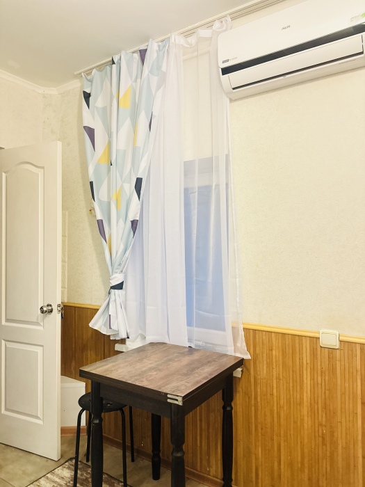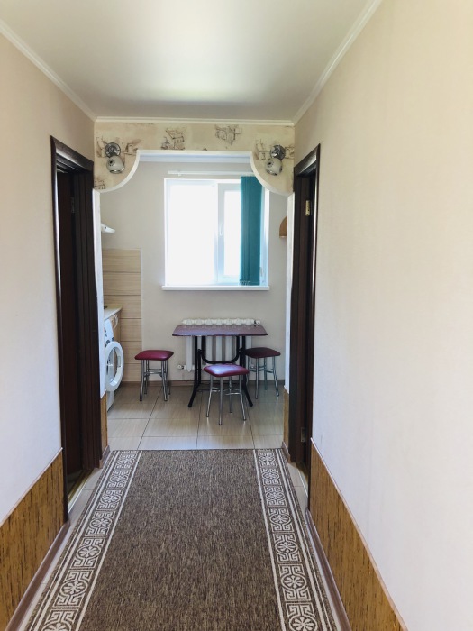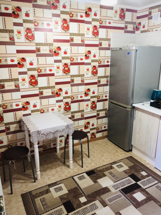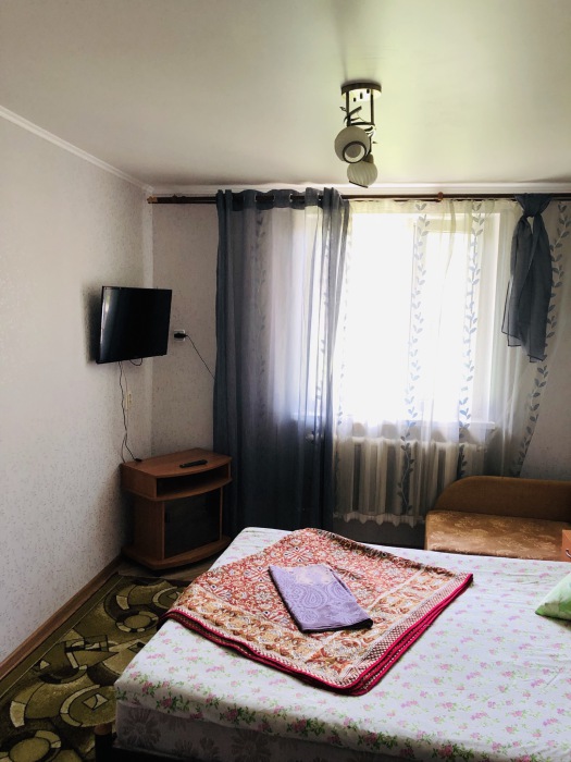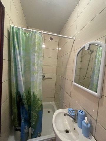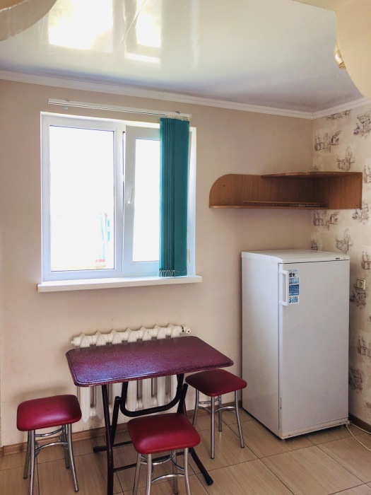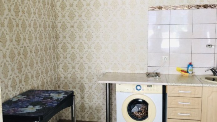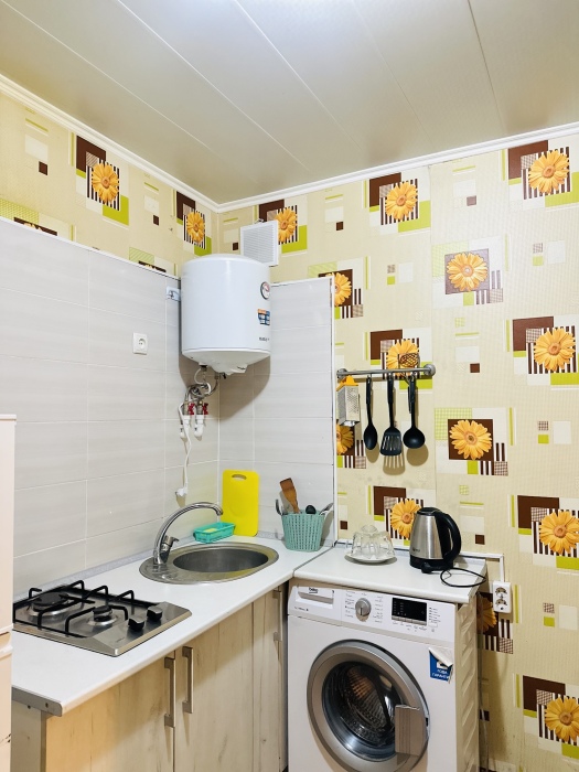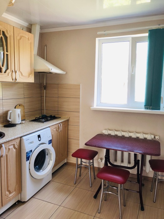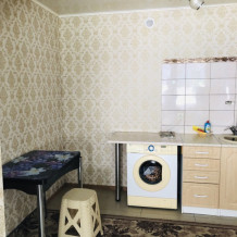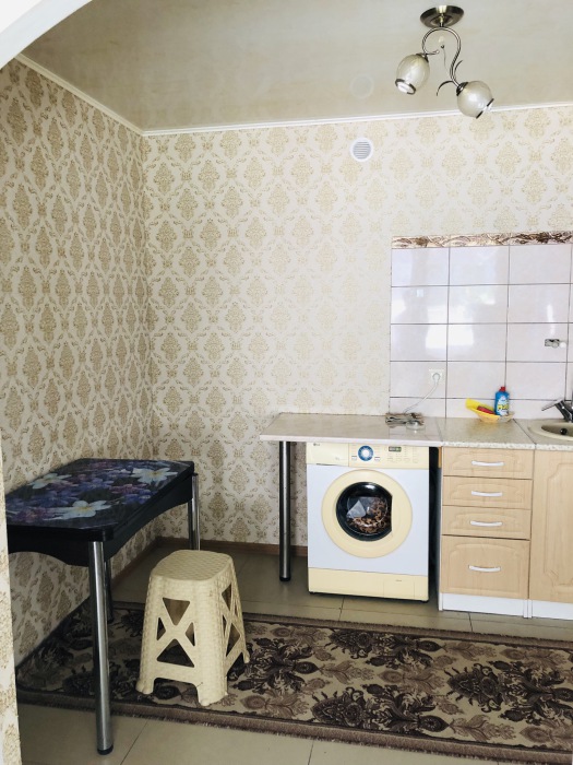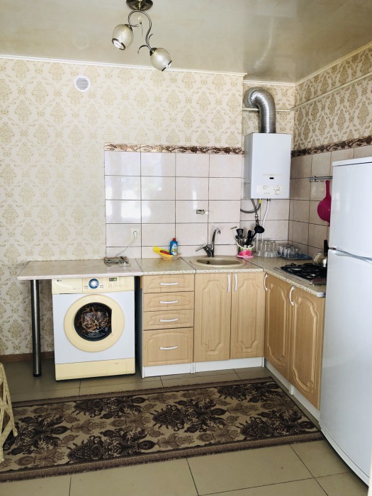 В номере комфортабельная кухня в которой есть холодильник,кухонный гарнитур,стиральная машинка ,газовая плита,раковина,столовая посуда, обеденный стол и стулья.В номере есть: кондиционер, телевизор, шкаф, зеркало, душевая кабина,умывальник, туалет.