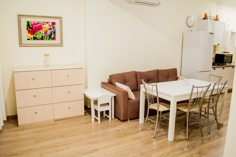 У нас Вам окажут радушный прием, предложат относительно бюджетный вариант отдыха на берегу Черного моря. Номера рассчитаны на семьи с детьми и дружеские компании, предпочитающие спокойный и размеренный отдых. А так же в 15 минутах от апартаментов находится набережная с кафе, ресторанами, живой музыкой, детской развлекательной комнатой, SPA-комплексом, водными аттракционами, ночным клубом «Маяк».