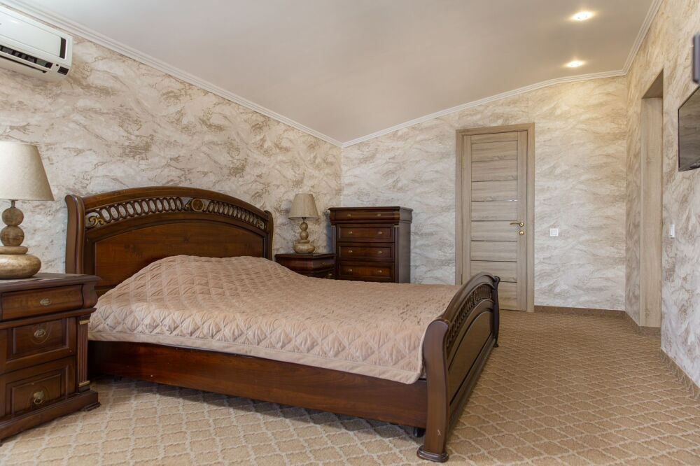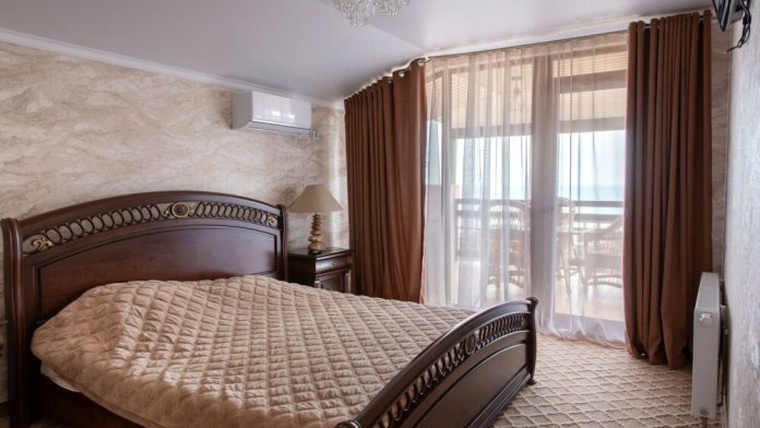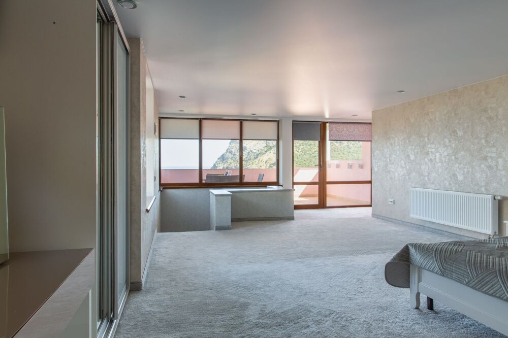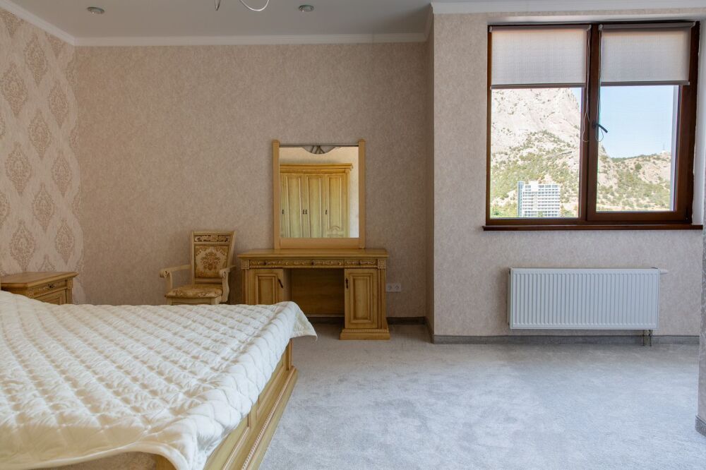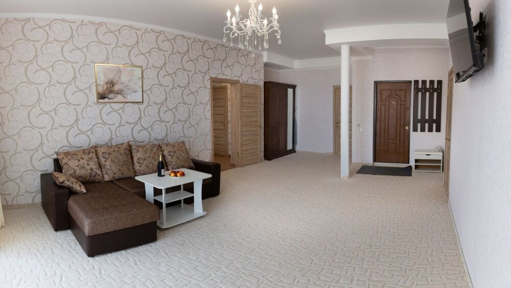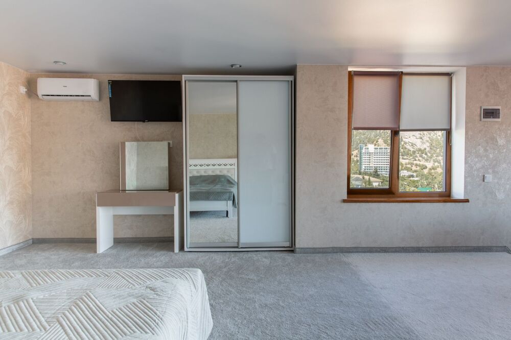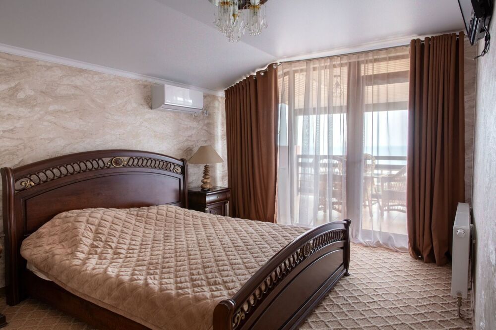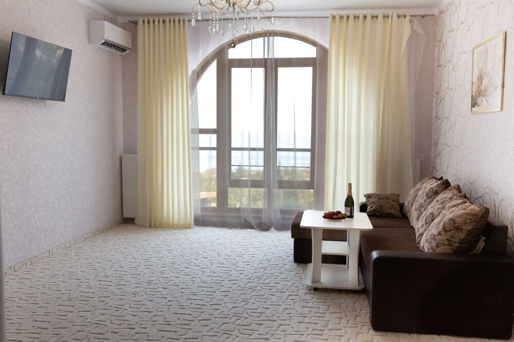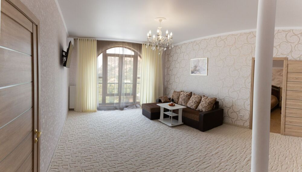 Номер предлагает изысканную мебель, панорамные окна в высоту комнаты, обилие света, ощущение легкости, изящества. План апартаментов уникален: две роскошные спальни, просторная гостиная - сочетает отдельную площадь , отдыха; две ванные комнаты, две живописные террасы располагают местом для отдыха под открытым небом и открывают завораживающие виды на море, бухту Зеленую, Судак, мыс Меганом, Алчак.