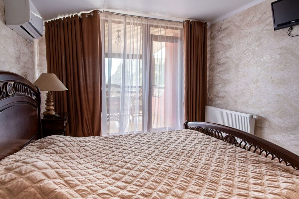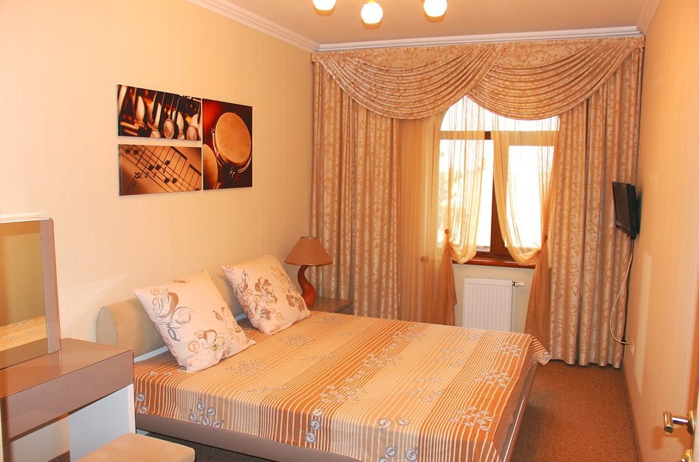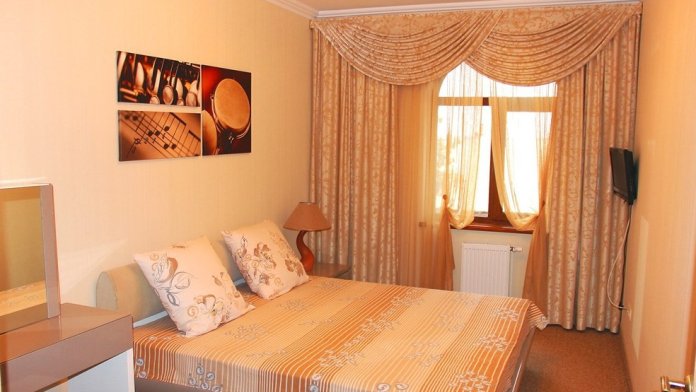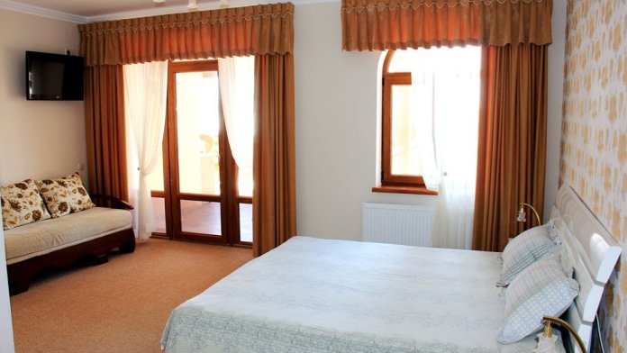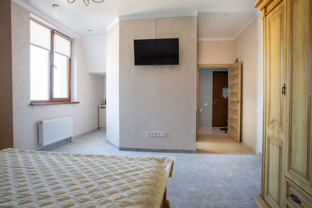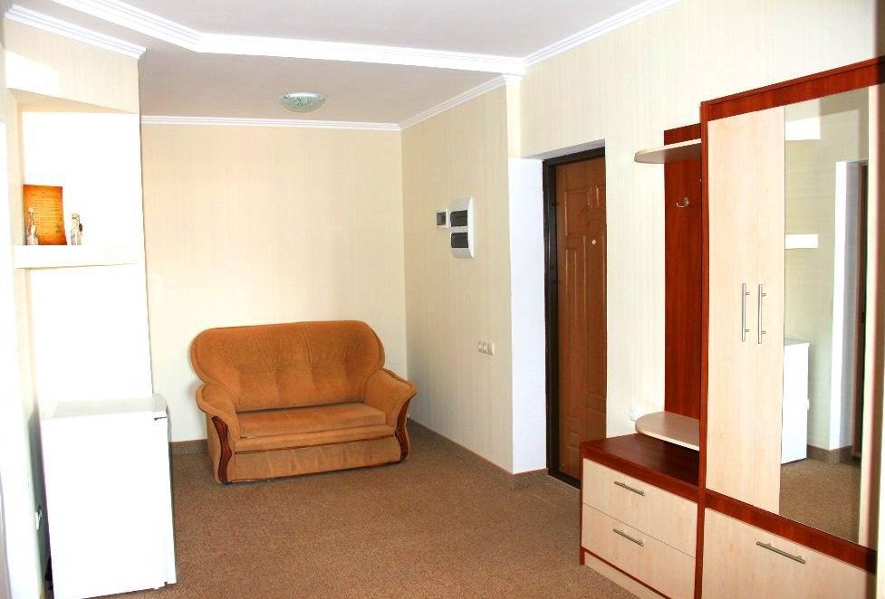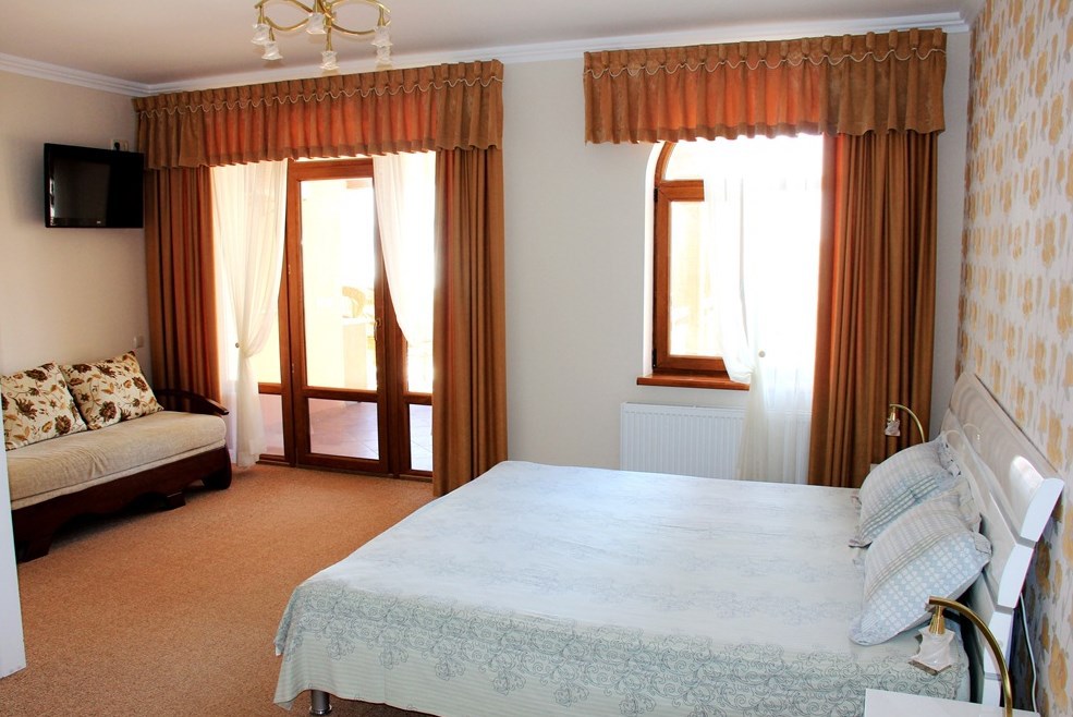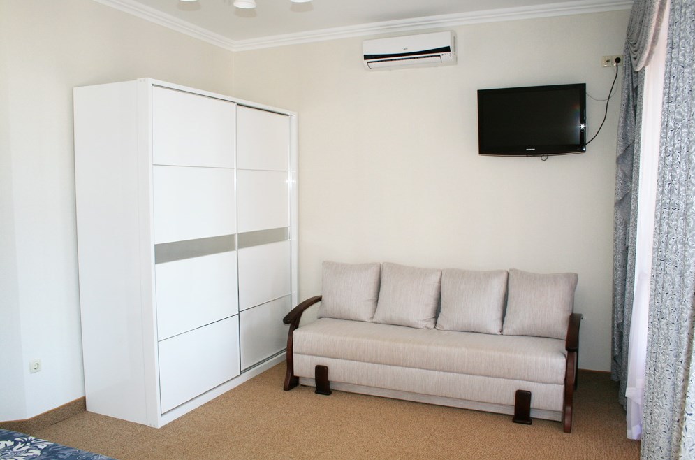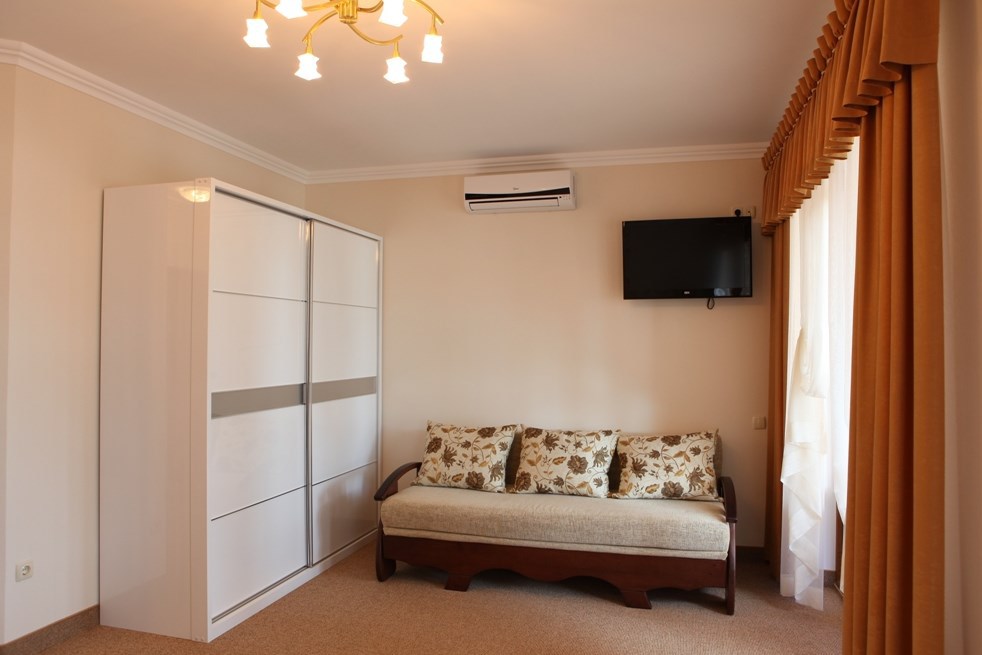 Номер комфорт выполнен в современном стиле. В номере есть санузел с душем, 2 спальная кровать, диван-кровать, шкаф купе, трюмо, холодильник, чайник, телевизор, Wi-Fi в номере. Вид из окна во двор, на территории отеля есть двор с садовой мебелью для отдыха.