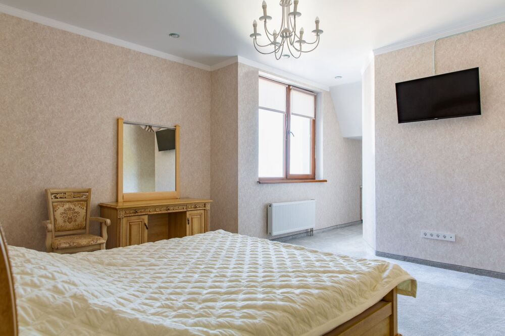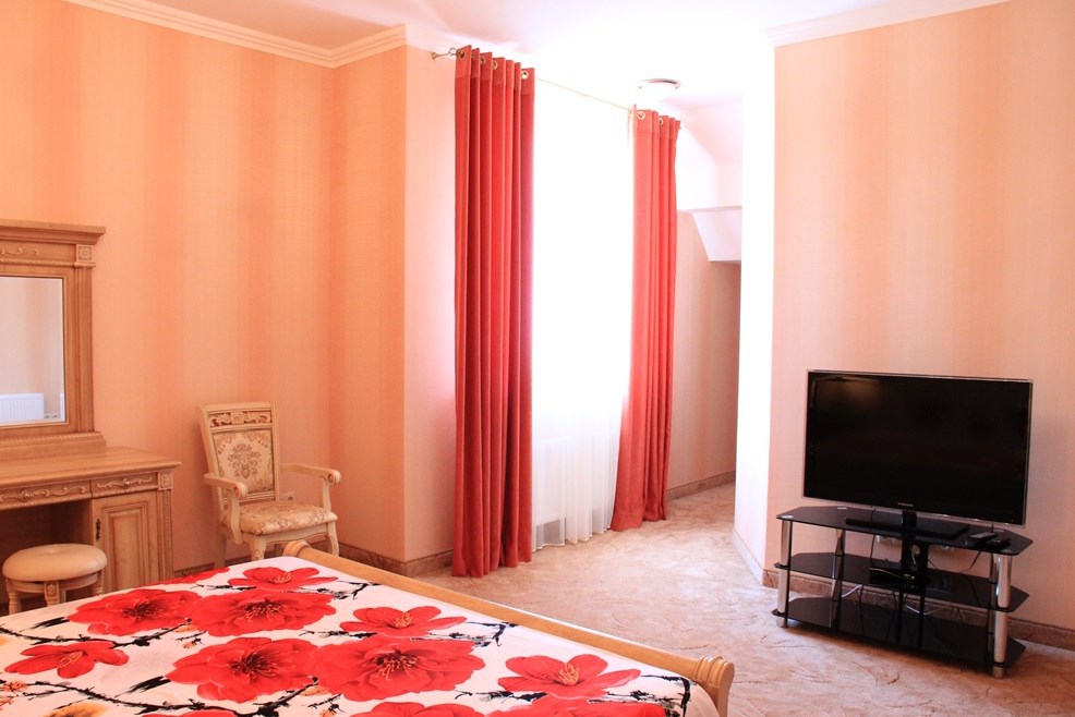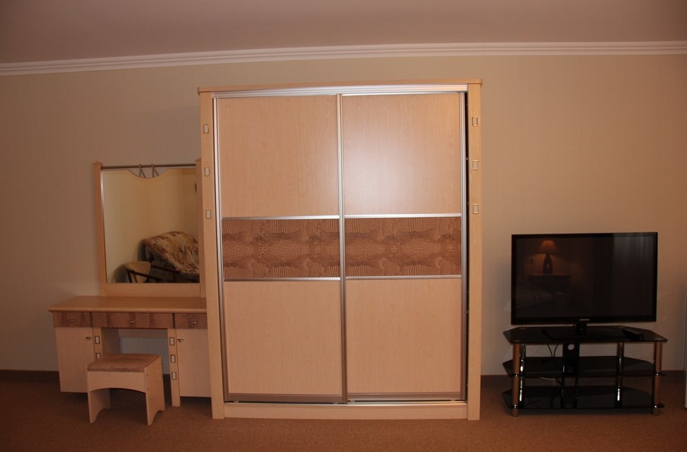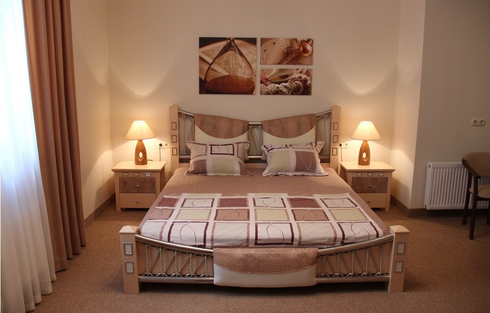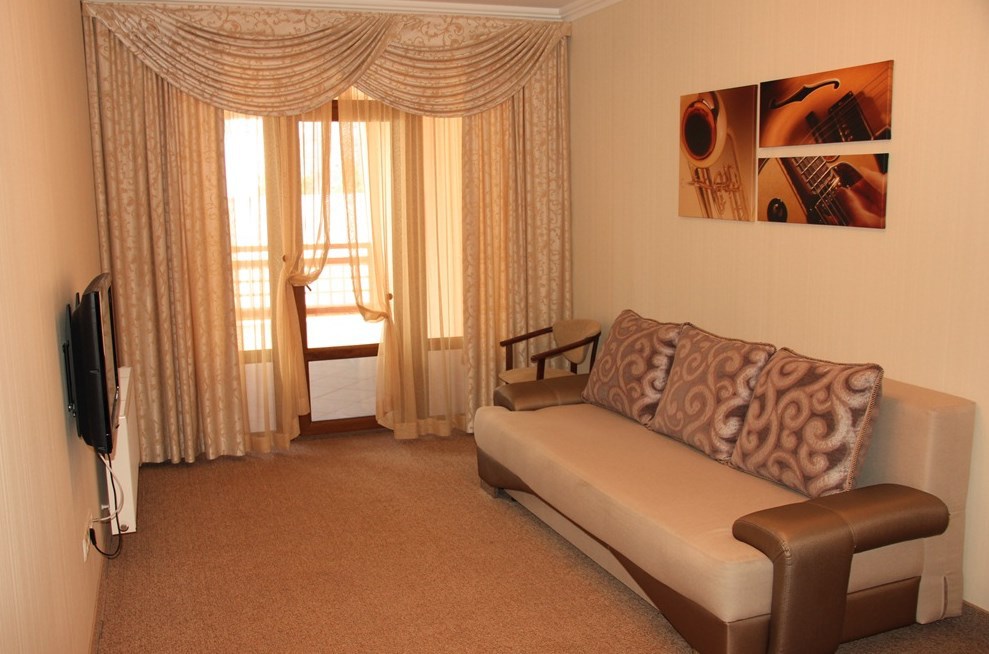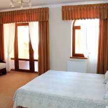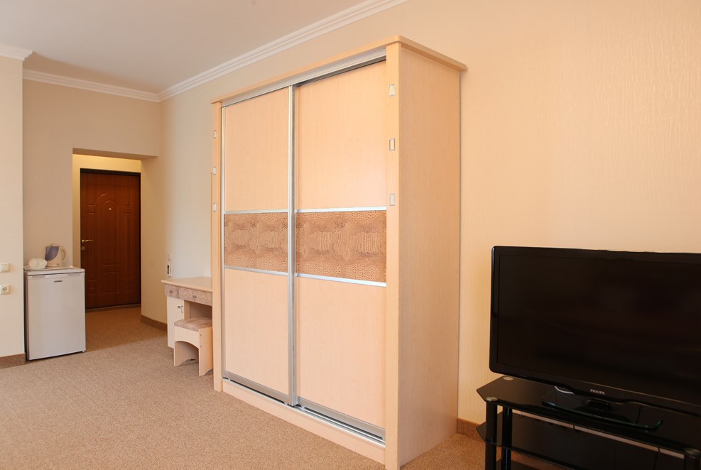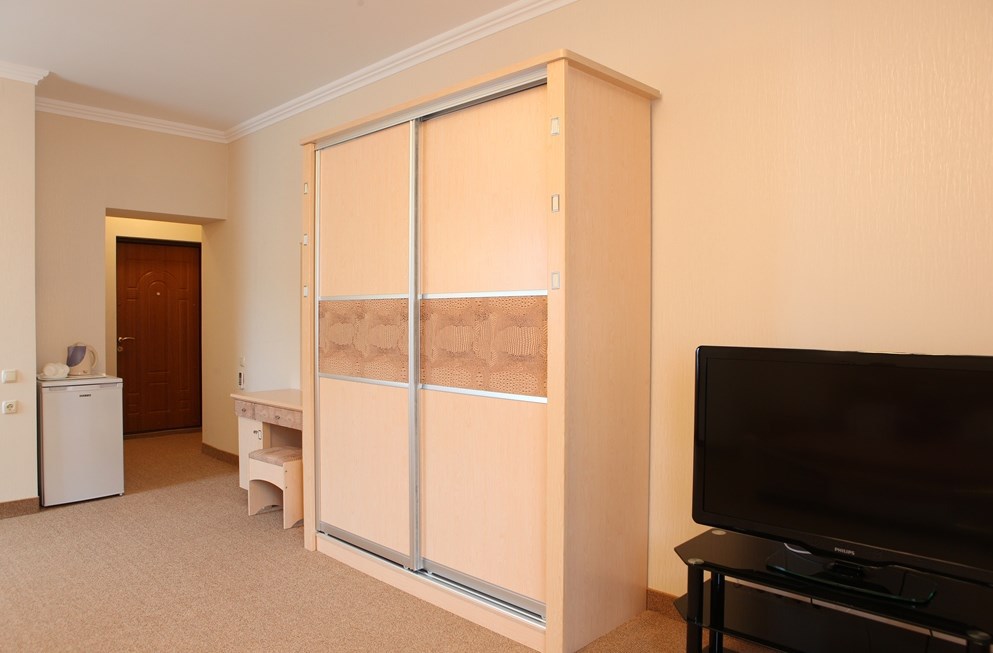 Номер комфорт выполнен в современном стиле. В номере есть санузел с душем, 2 спальная кровать, диван-кровать, шкаф купе, трюмо, холодильник, чайник, телевизор, Wi-Fi в номере. Вид из окна во двор, на территории отеля есть двор с садовой мебелью для отдыха.