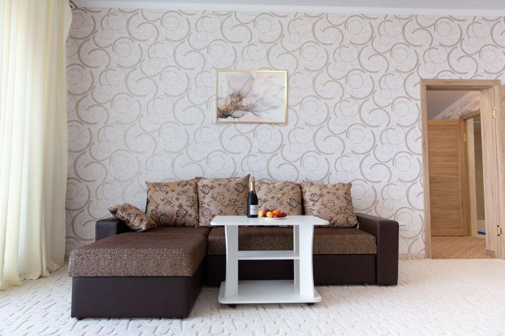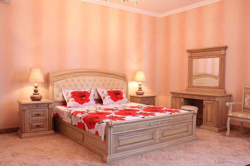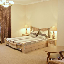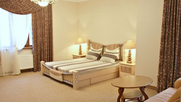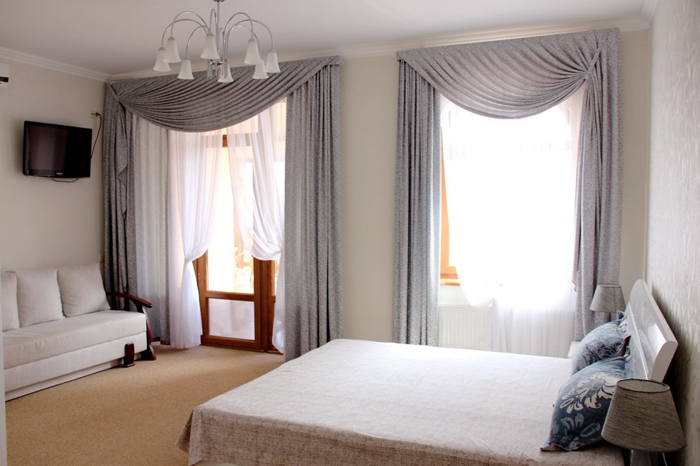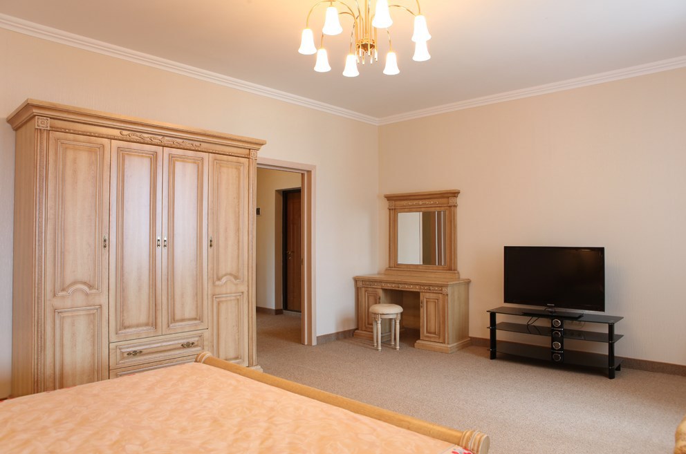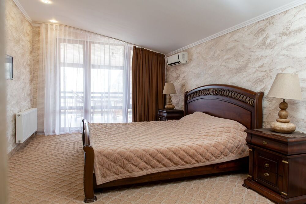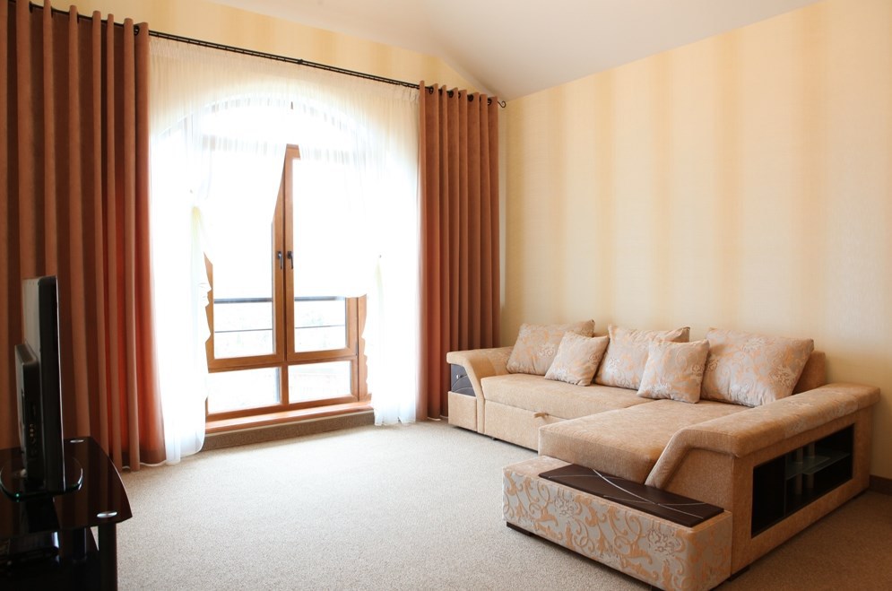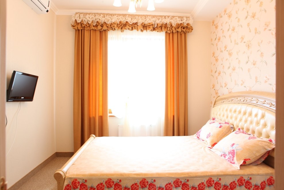 Номер комфорт выполнен в современном стиле. В номере есть санузел с душем, 2 спальная кровать, диван-кровать, шкаф купе, трюмо, холодильник, чайник, телевизор, Wi-Fi в номере. Вид из окна во двор, на территории отеля есть двор с садовой мебелью для отдыха.