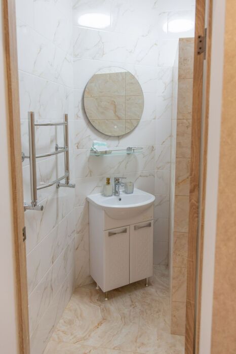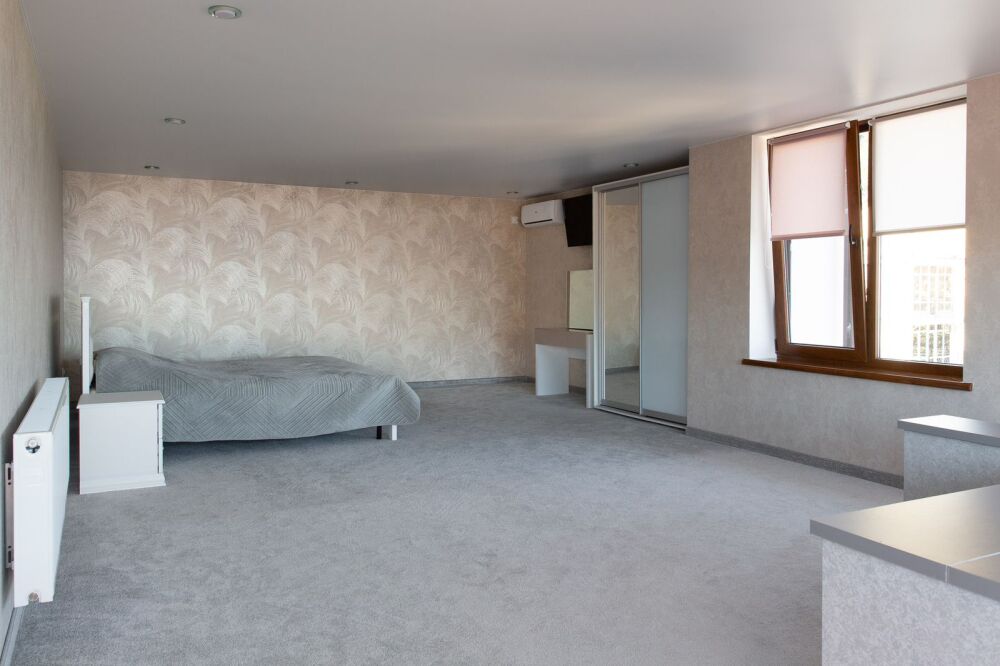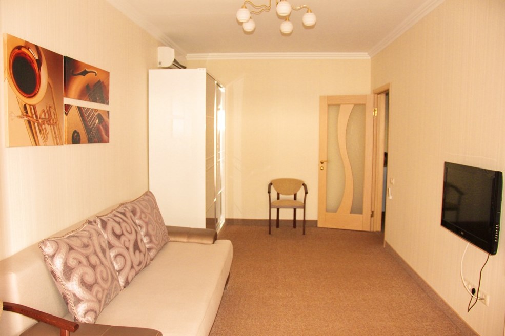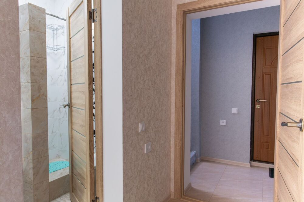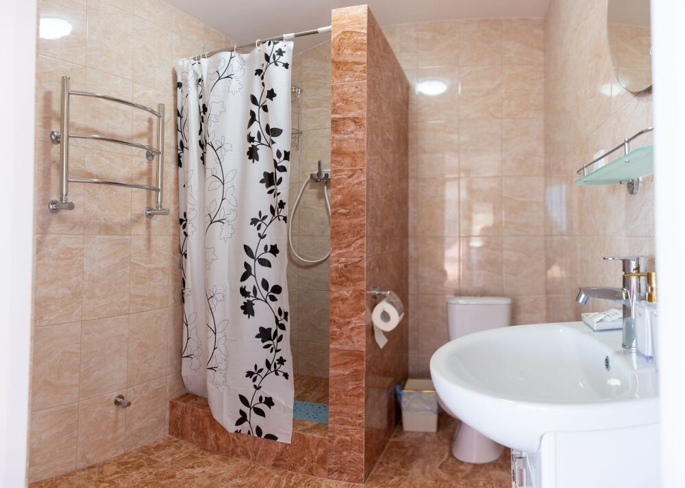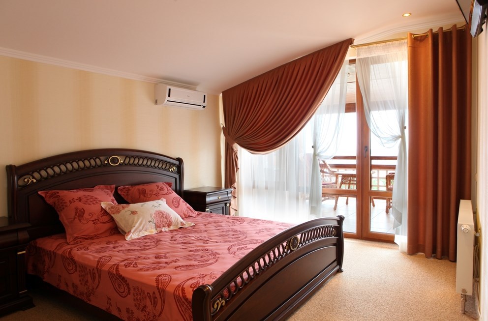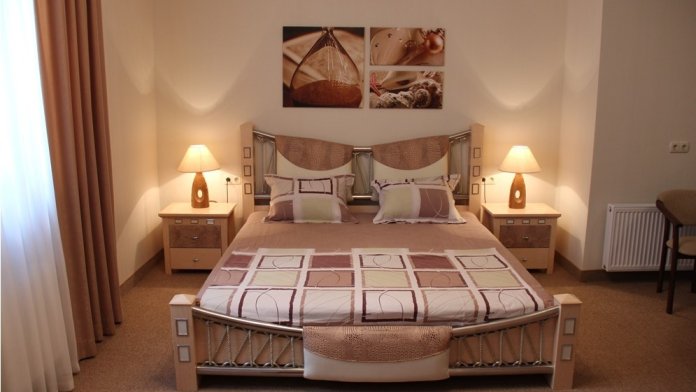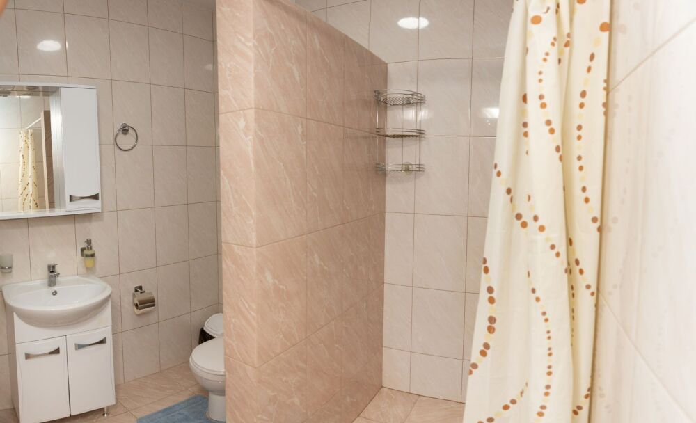 Номер комфорт выполнен в современном стиле. В номере есть санузел с душем, 2 спальная кровать, диван-кровать, шкаф купе, трюмо, холодильник, чайник, телевизор, Wi-Fi в номере. Вид из окна во двор, на территории отеля есть двор с садовой мебелью для отдыха.