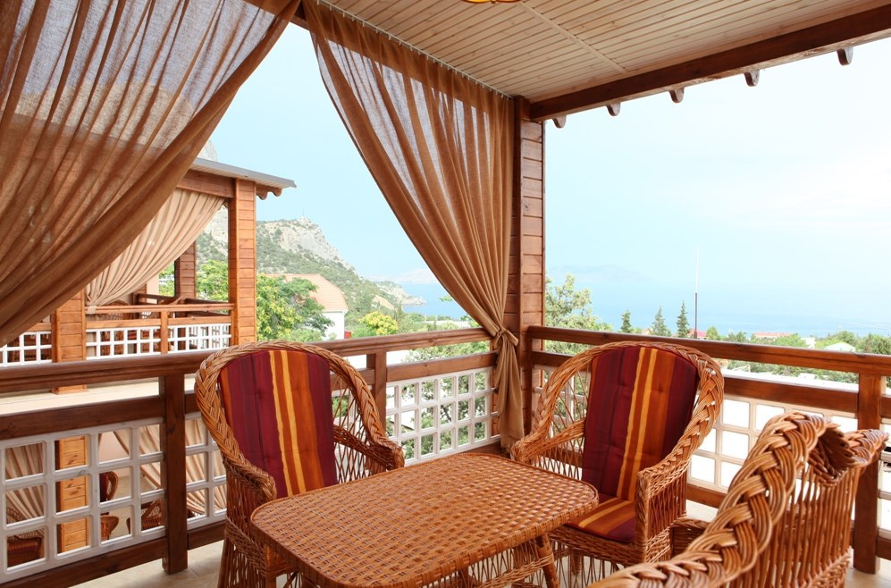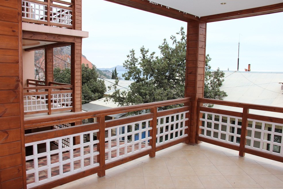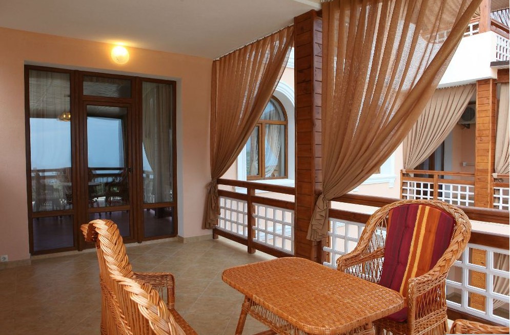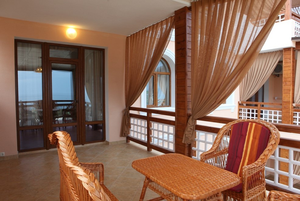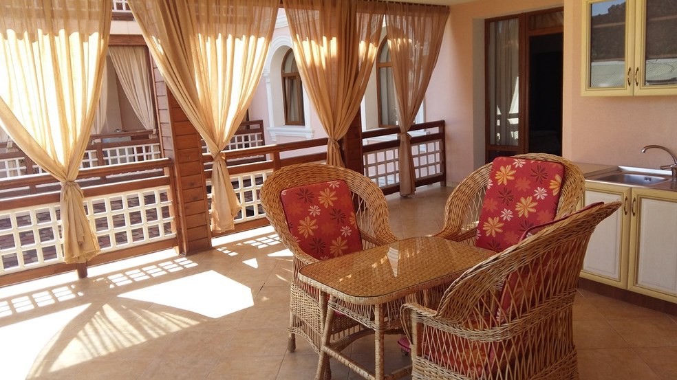 Номер люкс №3, семейный.Просторная терраса: 22 кв.м, 2-й этаж, вид на улицу и частичный на море, мебель для отдыха на террасе.