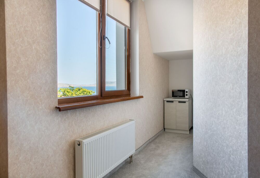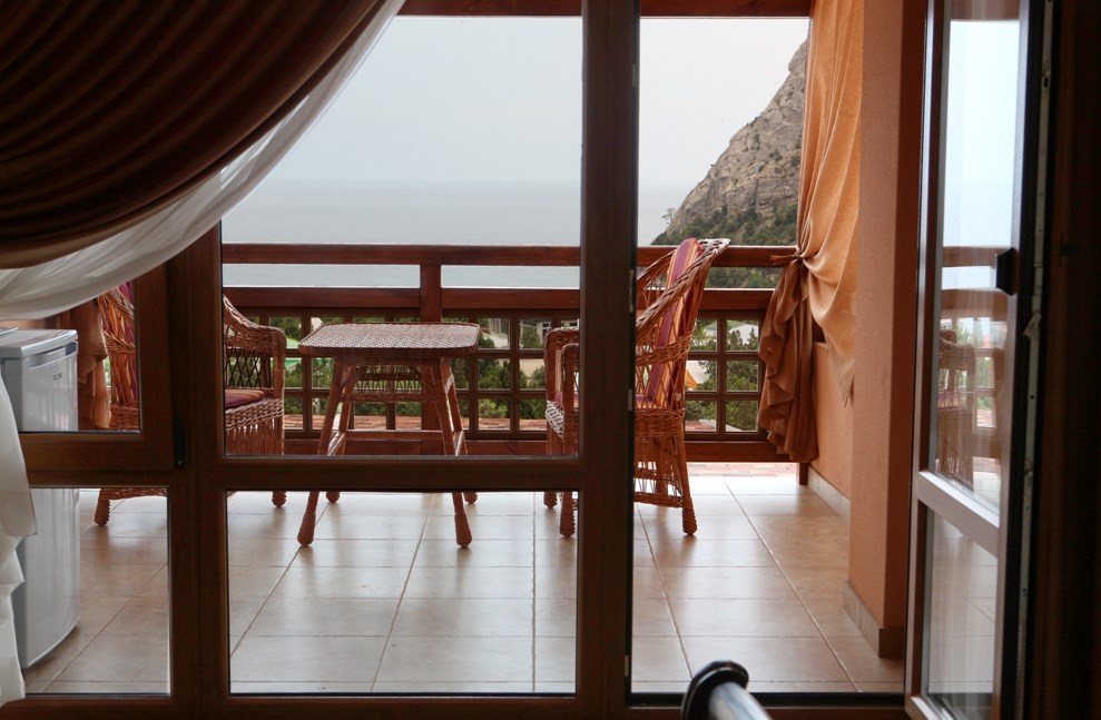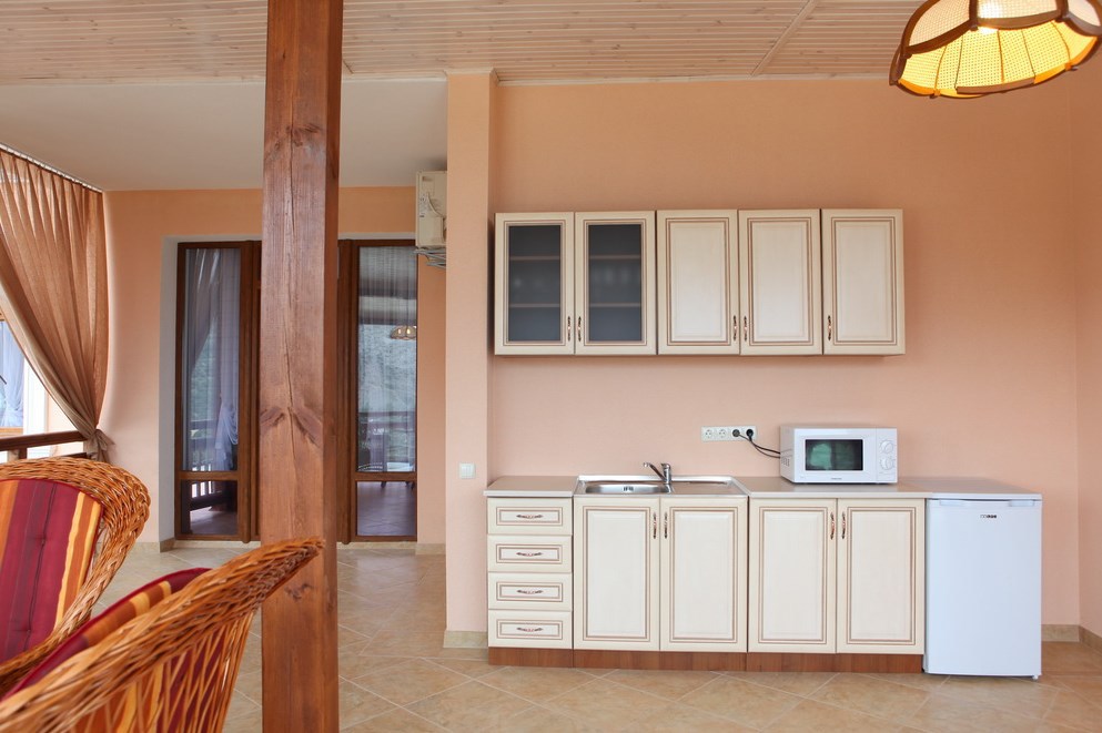 В номере просторная терраса: 38 кв.м., 3 этаж, панорамный вид на море и поселок. На террасе есть мини-кухня, микроволновая печь, чайник, холодильник.