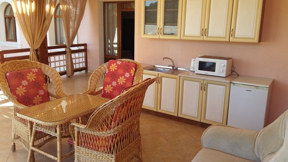 Номер люкс с большой террасой №2. Индивидуальная терраса: 37 кв.м, 2-й этаж, частичный вид на море. На террасе есть мини-кухня, микроволновая печь, чайник, летняя мебель.