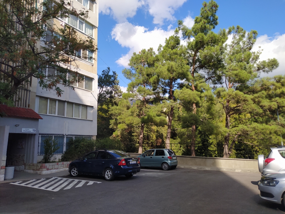 Рядом находится лесная зона и озеро. К дому имеется не большой подъем по лестнице или по альтернативной дороге по горке, т.е. дом стоит на возвышенности, благодаря чему воздух становится еще чище, чем в центре поселка в низине. Прямо под окнами растут крымские сосны, воздух в квартире получается целебный, что особенно благоприятно влияет на бронхо-легочную систему.