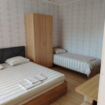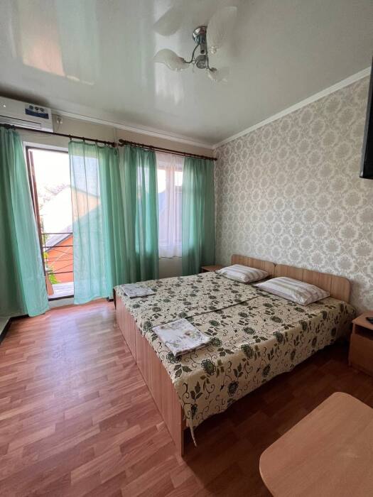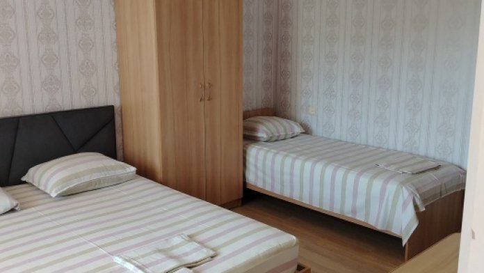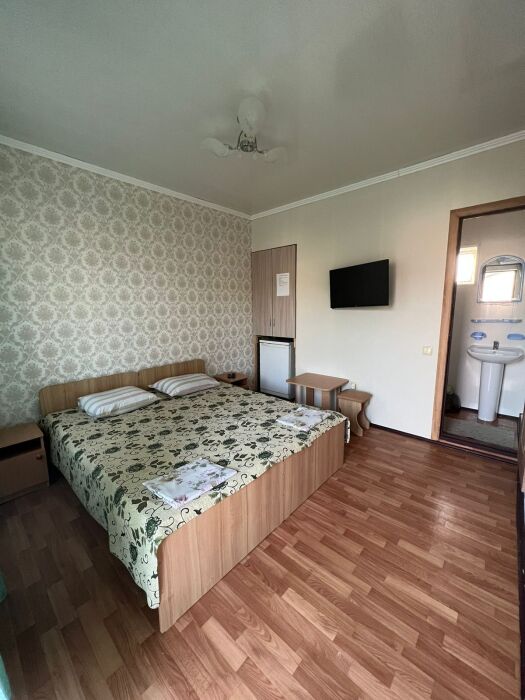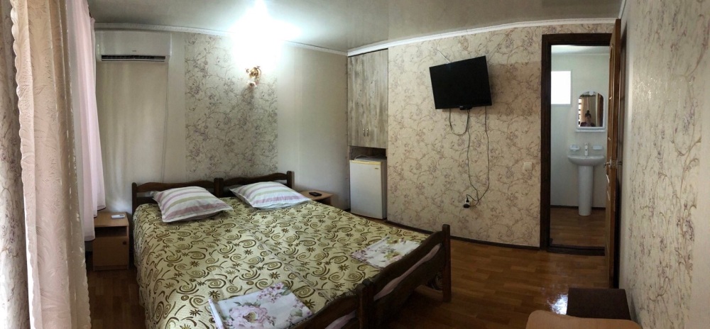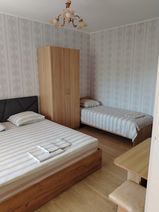 В номере находится 2-спальная кровать и одна односпальная, душ и санузел ( горячая и холодная вода круглосуточно), телевизор, холодильник, кондиционер, wi-fi. Отдыхающим предоставляем постельное белье и полотенце.