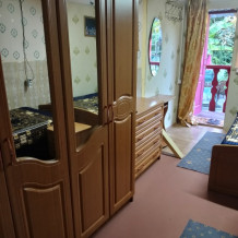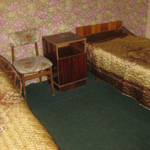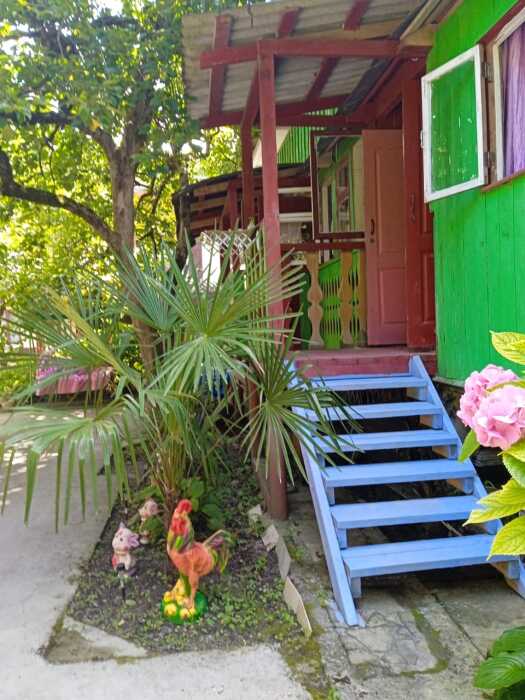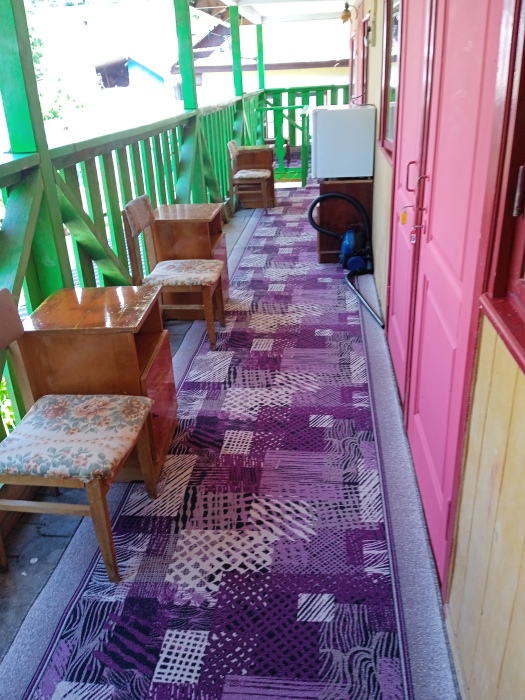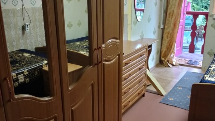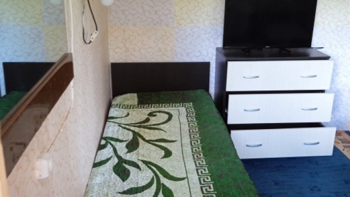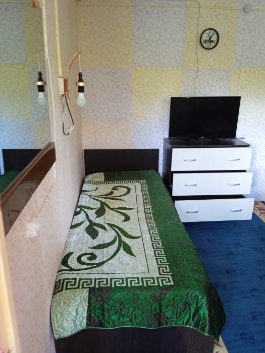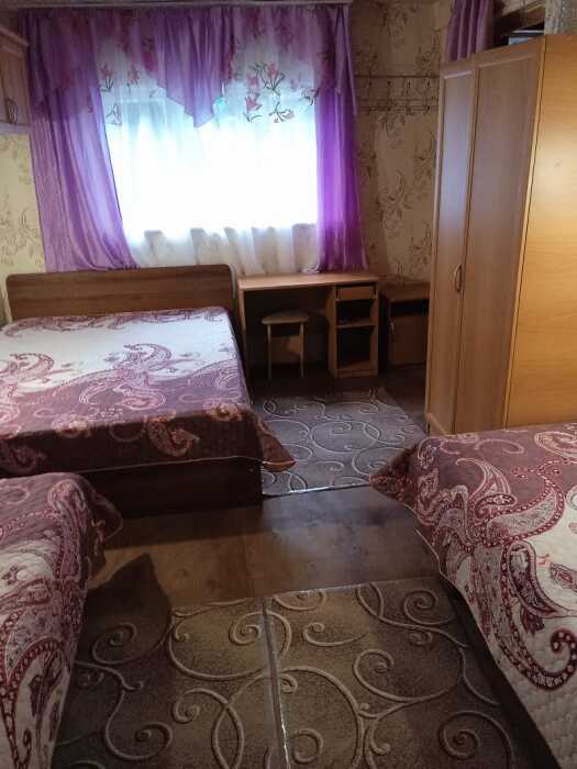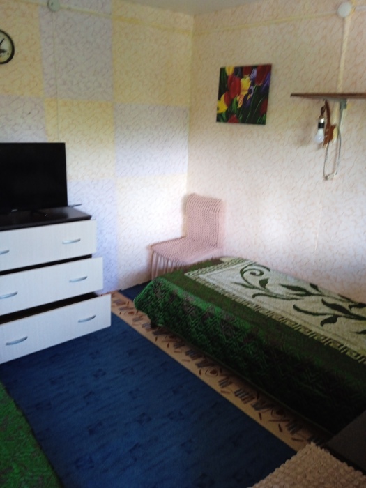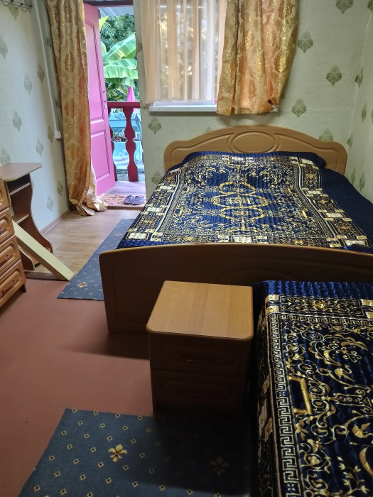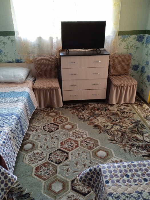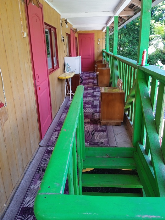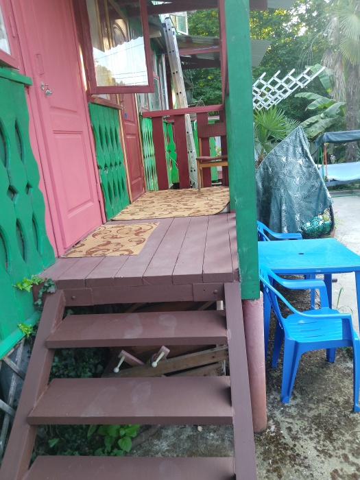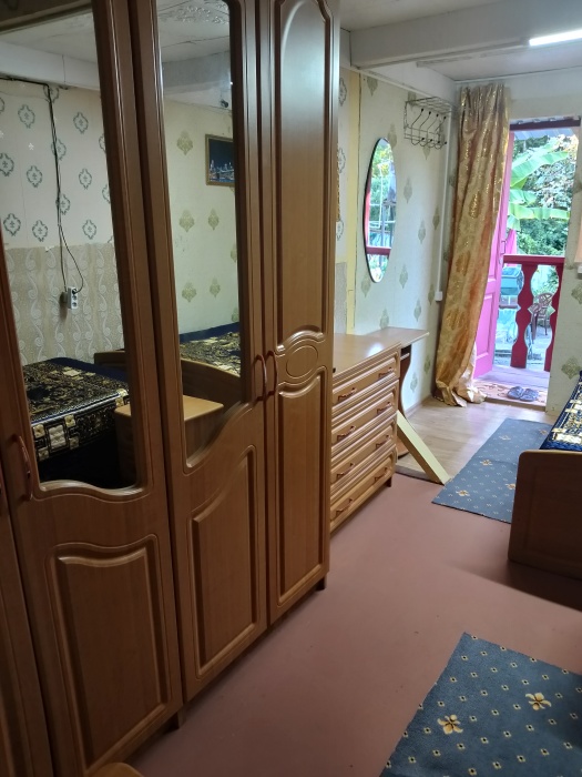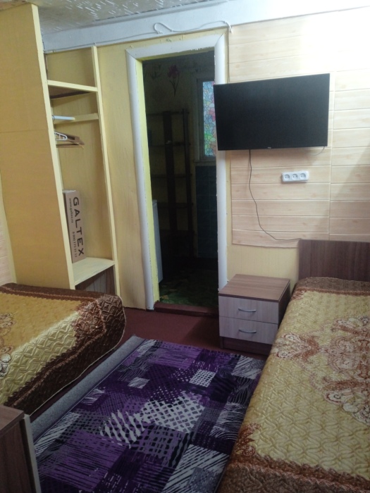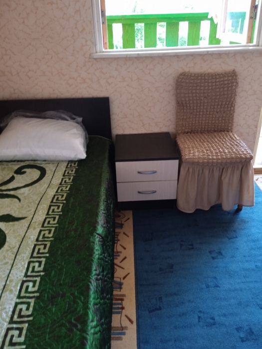 На крыльце два номера. Есть шкаф для одежды, стол, прикроватные тумбы, большое зеркало. Холодильник находится в кухонной зоне.не в жилой комнате, спокойному сну ничего не мешает. В комнате всегда прохладно без кондиционера, даже в сильную жару. Состояние мебели, матрасов, сантехники отличное. Постельное бельё, комплекты полотенец каждому гостю. Есть набор посуды. Вентилятор напольный выдается по запросу. Соблюдается распорядок дня, с 23 до 07 час режим тишины, заселение не производится. Посторонних приводить нельзя. Регистрация строго по паспорту.
