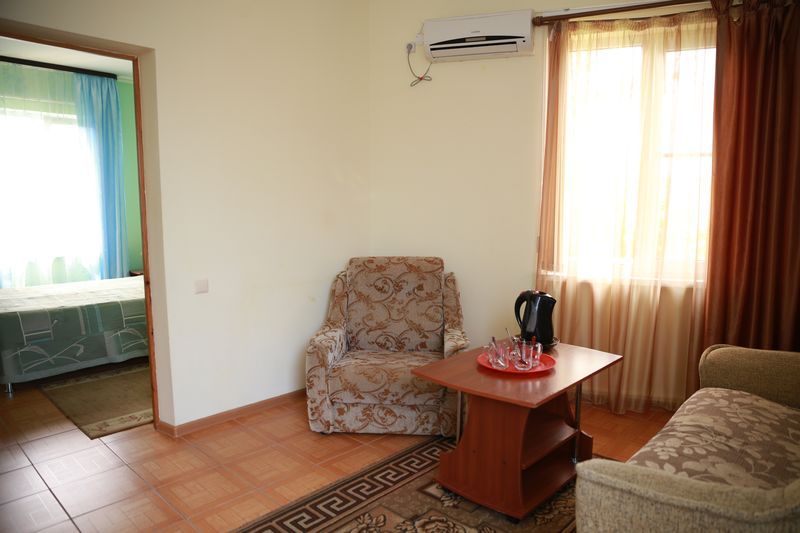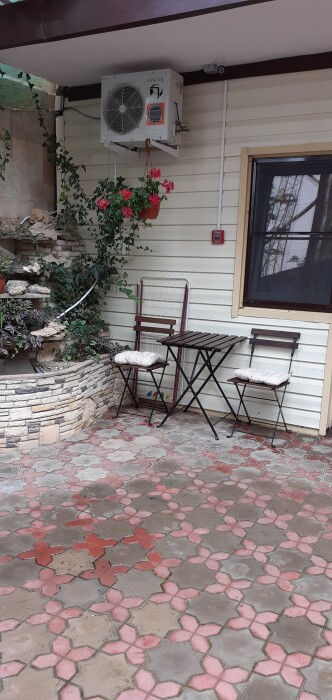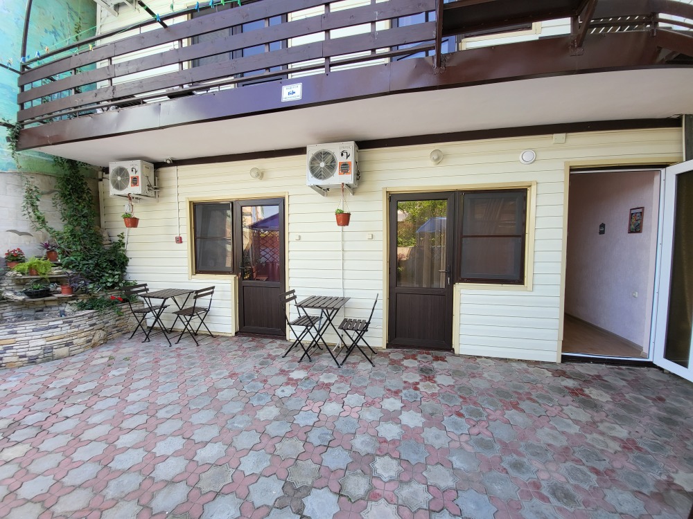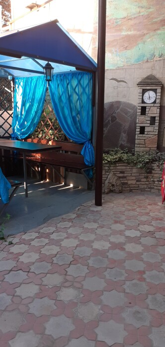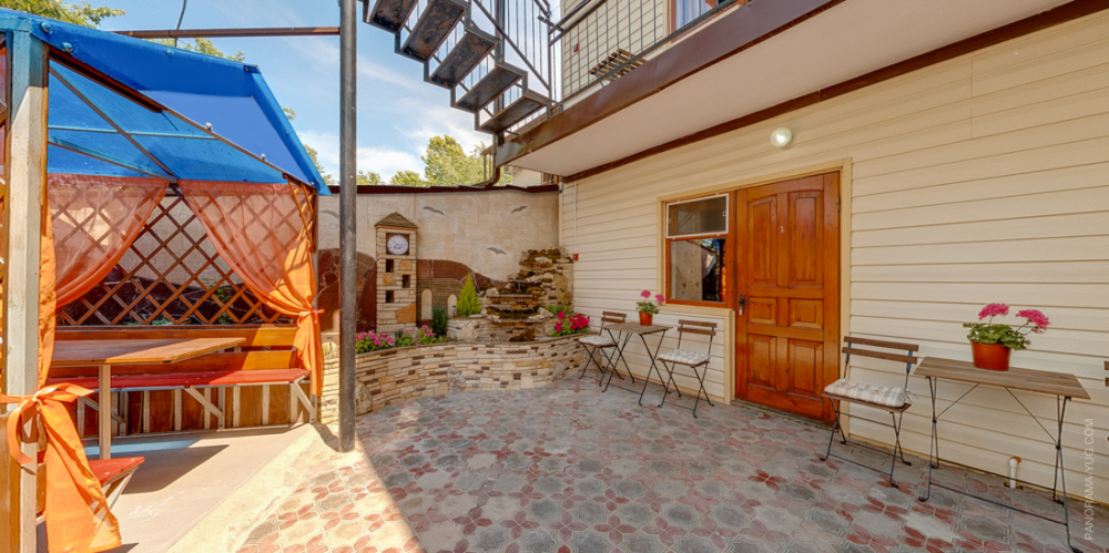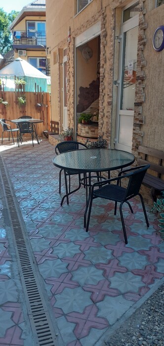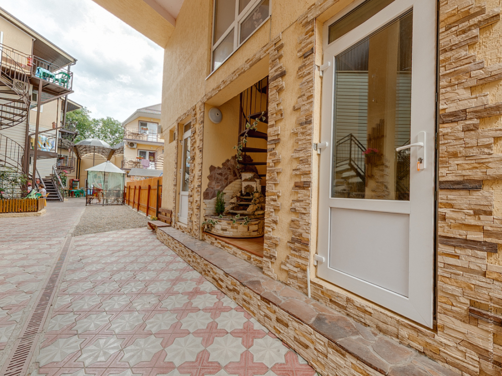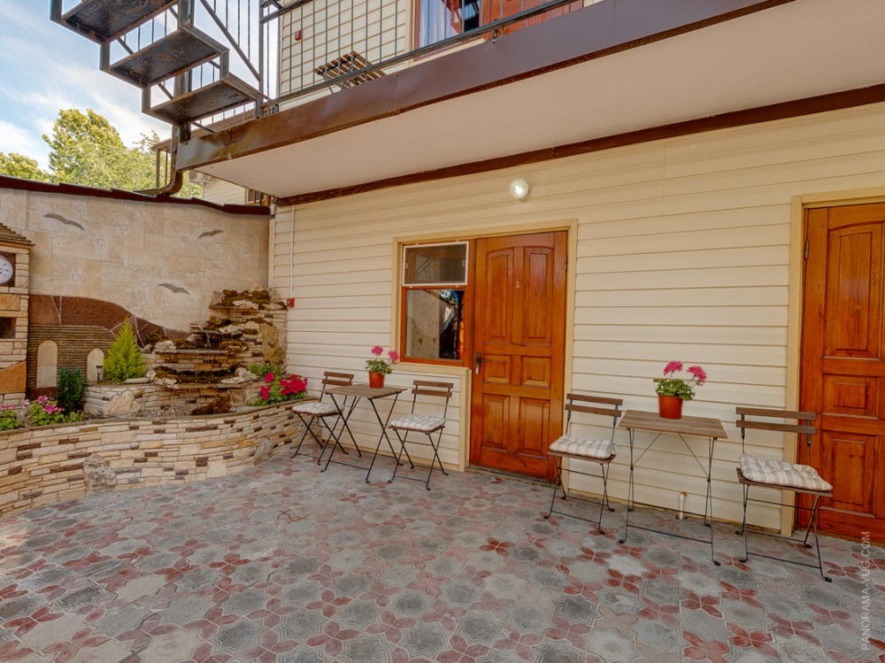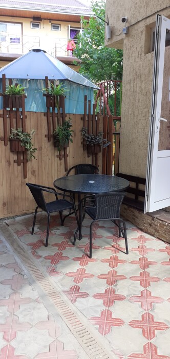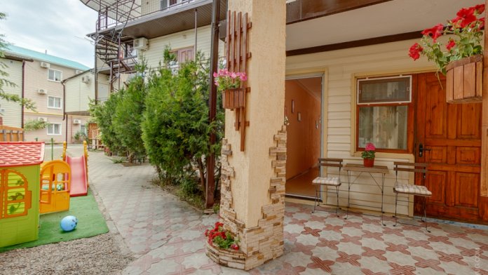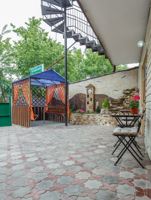 На территории гостевого дома есть детская площадка, огороженный большой двор, который еще дополнительно обеспечен круглосуточной охраной. Для взрослых – беседки и столы с креслами для отдыха на свежем морском воздухе.