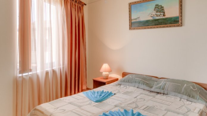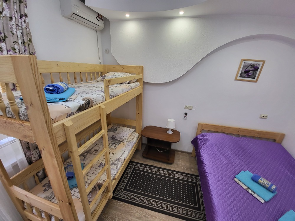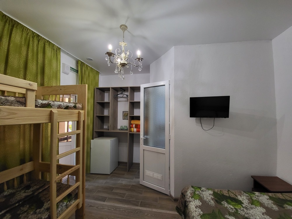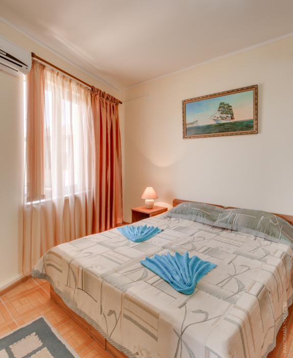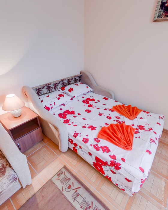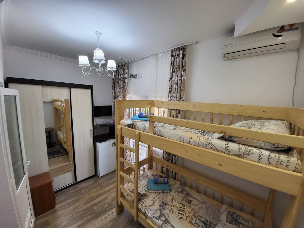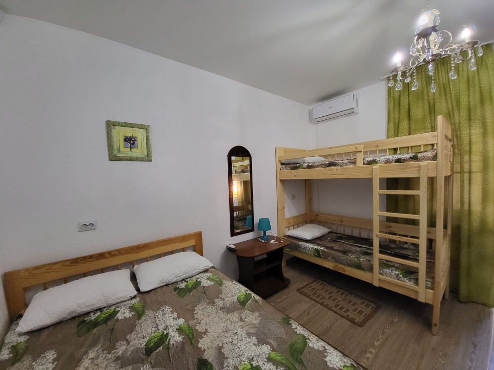 Этаж 2 или 3. Мебель: двуспальная кровать, 2-х ярусная кровать (уточняйте при заказе), шкаф , прикроватные тумбочки, столик, зеркало, москитные сетки на окнах.