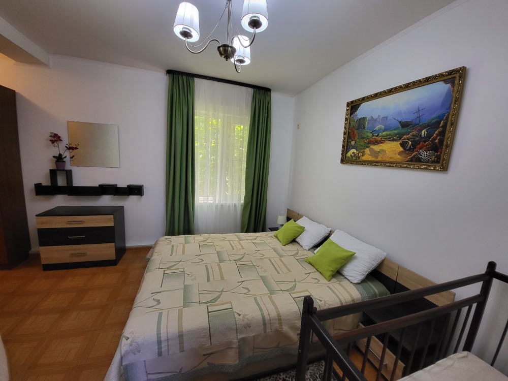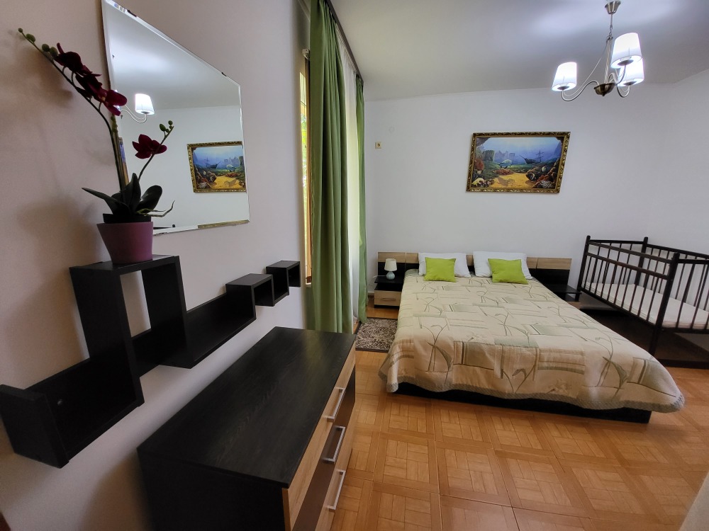 Удобства: 2-х спальная кровать , 2-х спальный диван-кровать, шкаф для белья, стулья, прикроватные тумбочки, обеденный стол и стулья, туалетный столик, зеркало