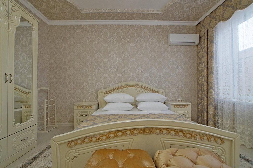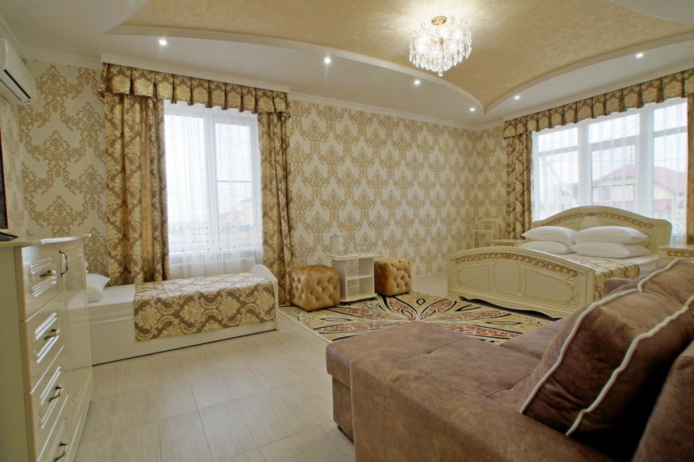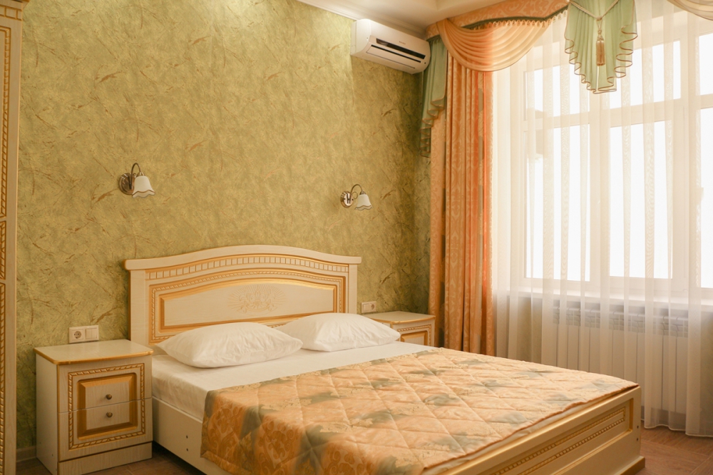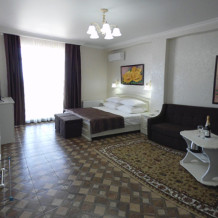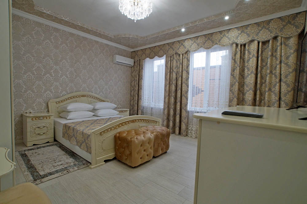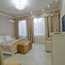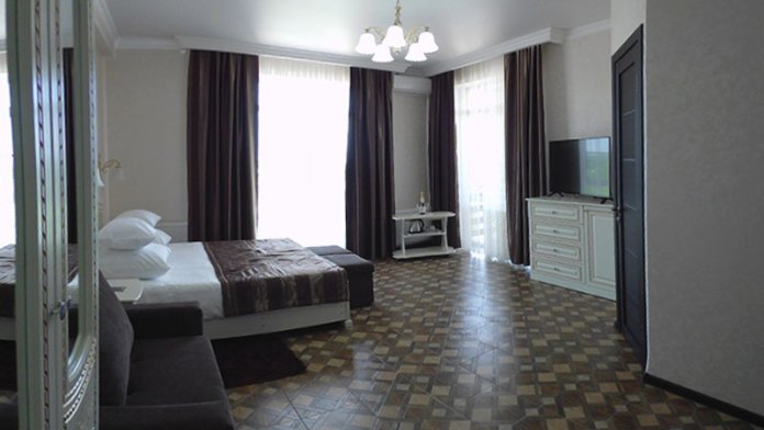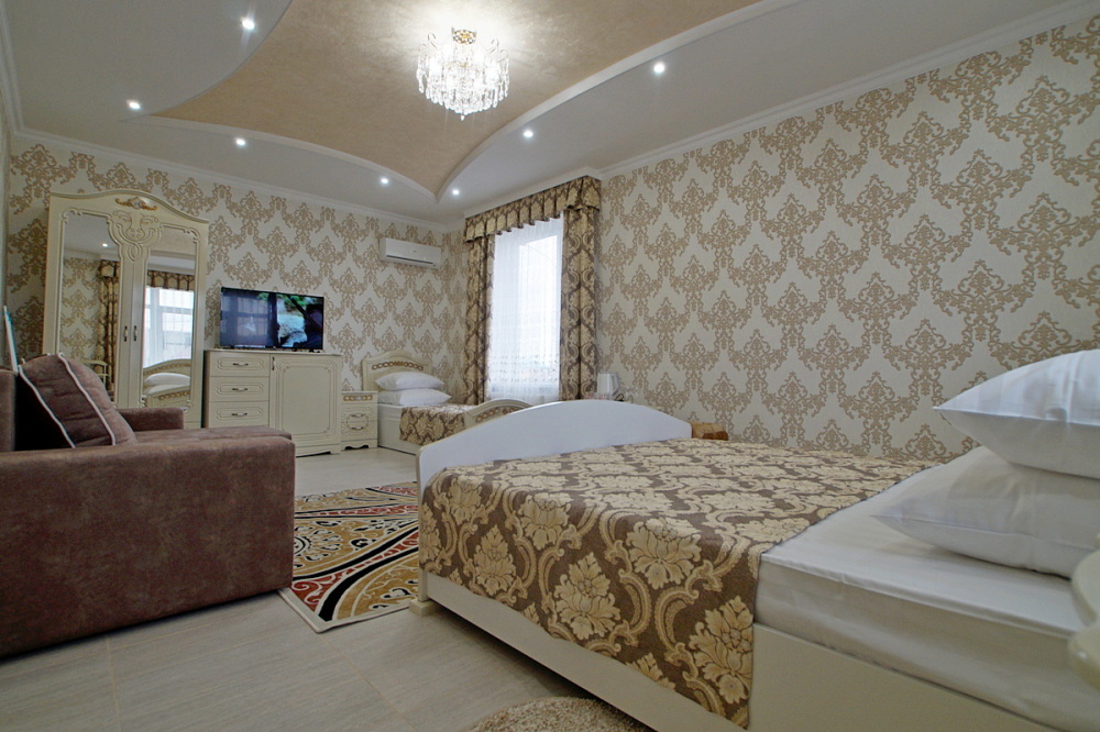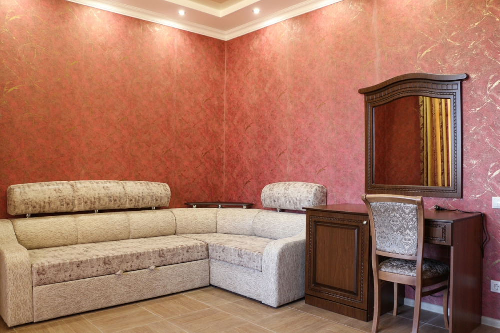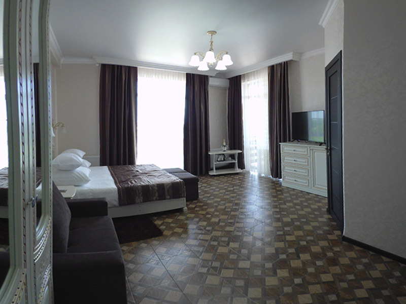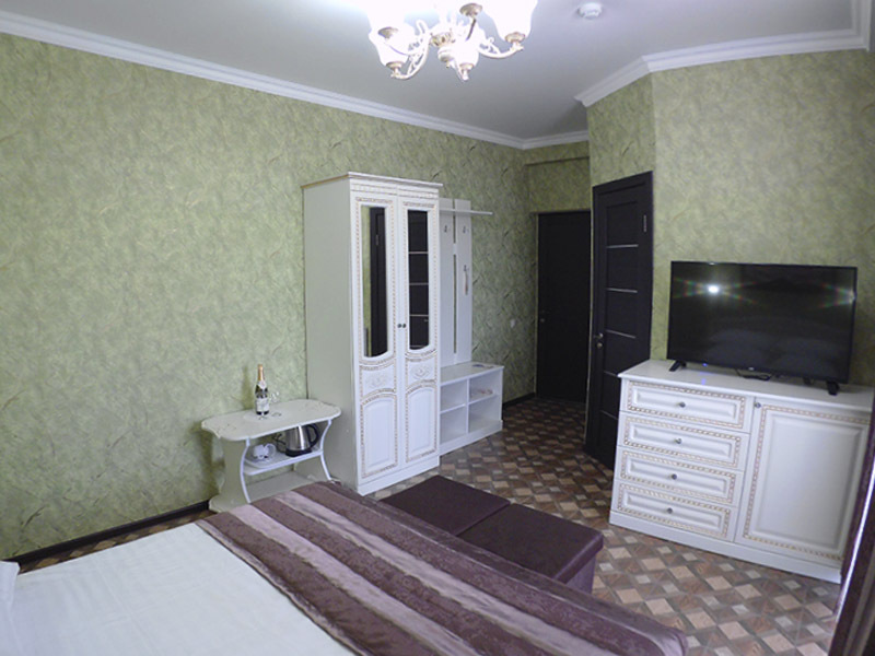 В номере: двуспальная кровать, односпальная кровать, шкаф, стулья, стол, прикроватные тумбы, туалетный столик, вешалка, зеркало, кондиционер, комод, телевизор, интернет, сейф, холодильник, фен, эл. чайник, санузел.