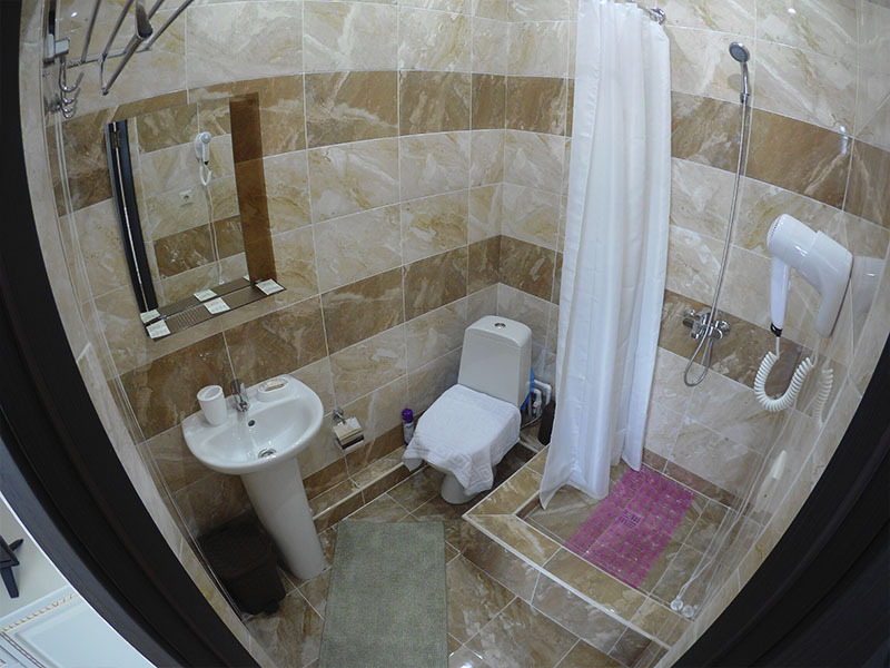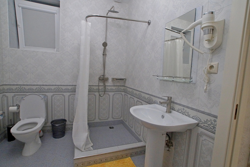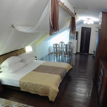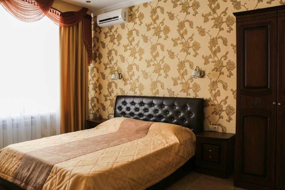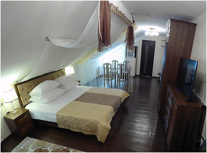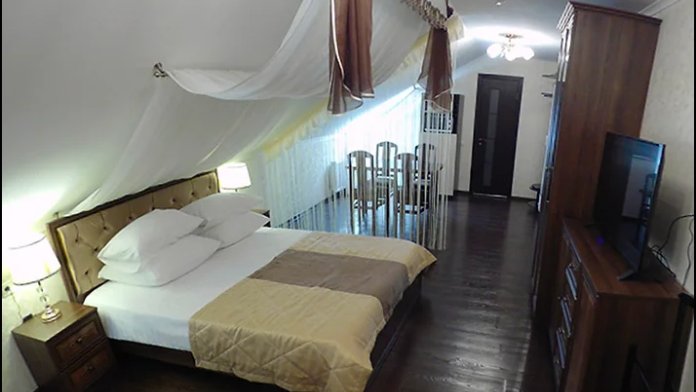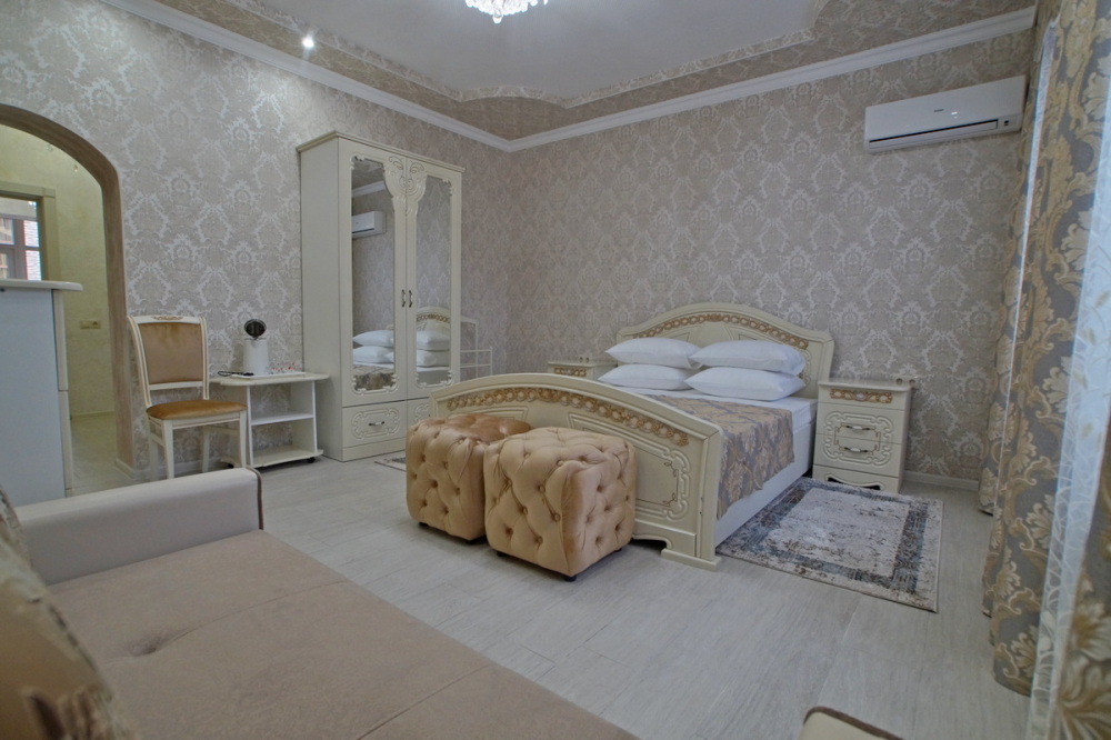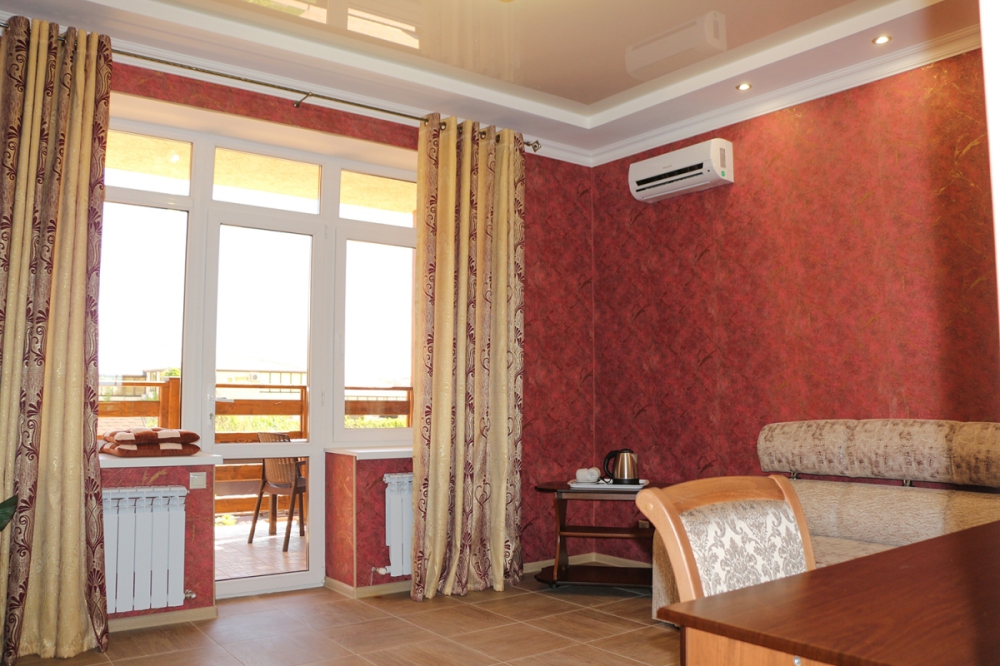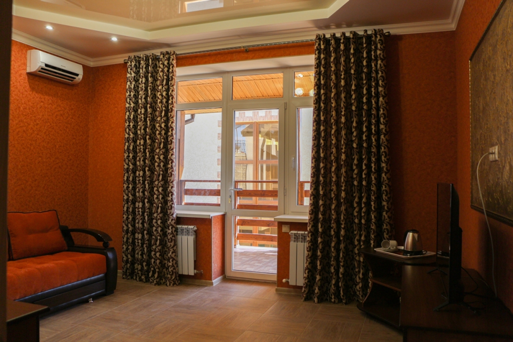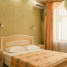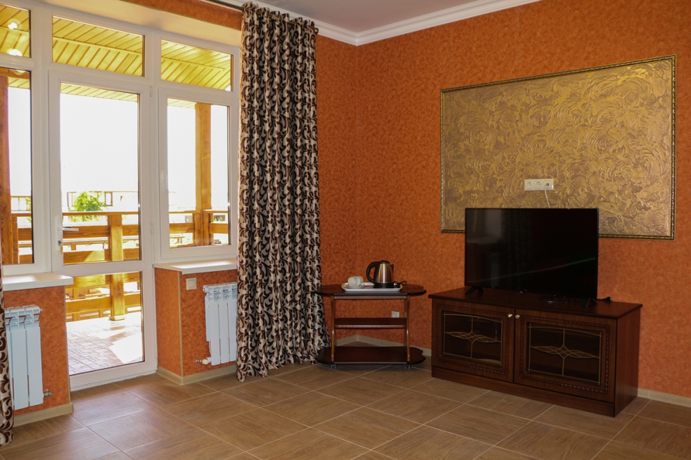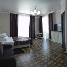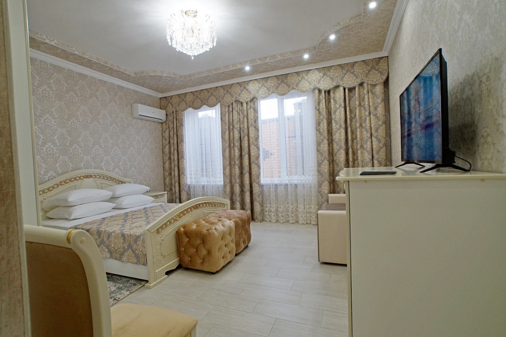 В номере: двуспальная кровать, односпальная кровать, шкаф, стулья, стол, прикроватные тумбы, туалетный столик, вешалка, зеркало, кондиционер, комод, телевизор, интернет, сейф, холодильник, фен, эл. чайник, санузел.