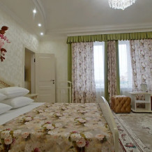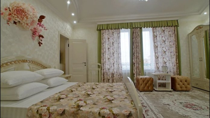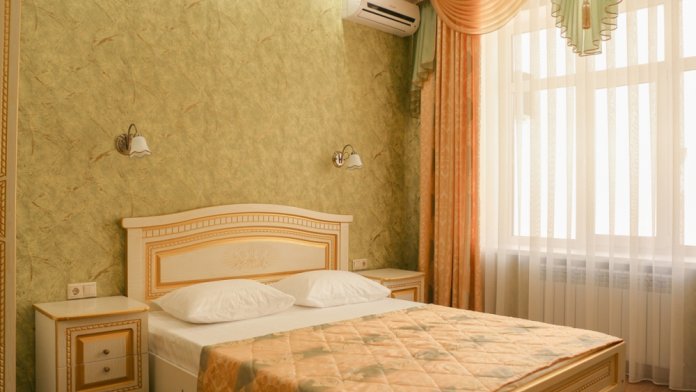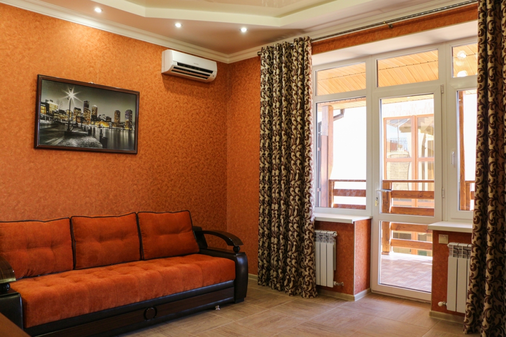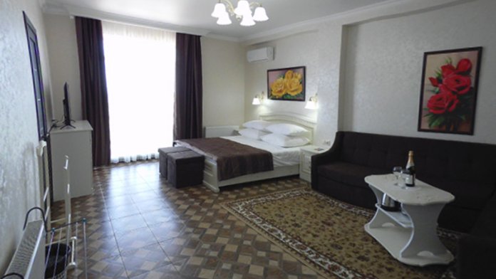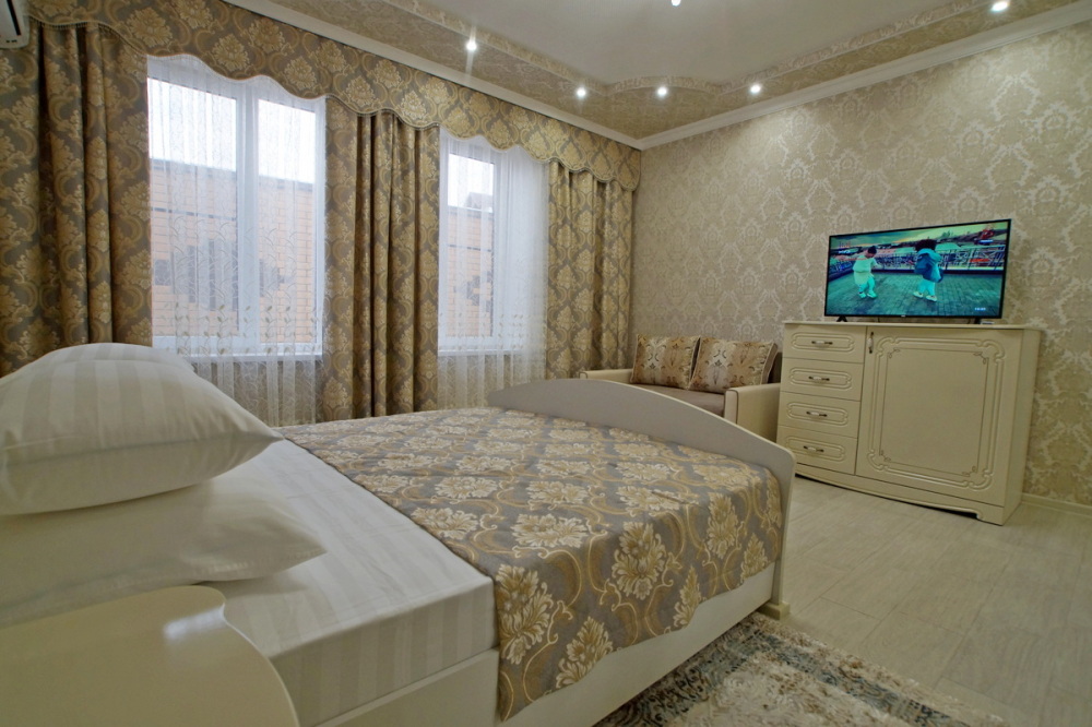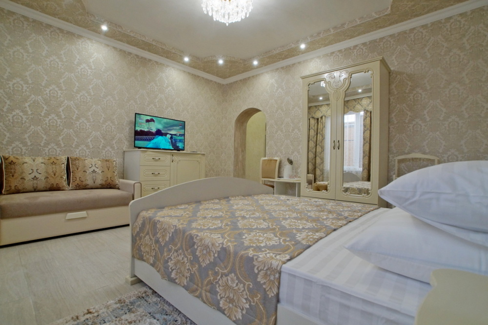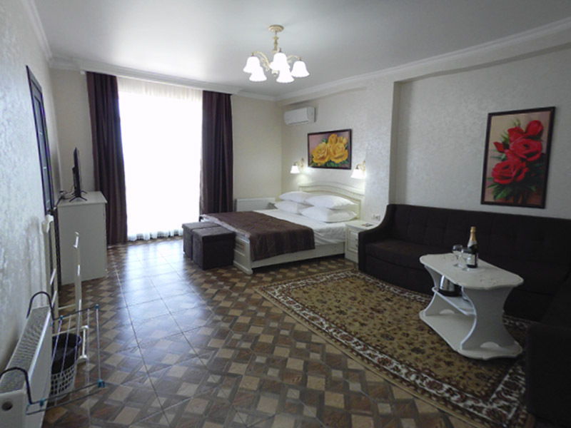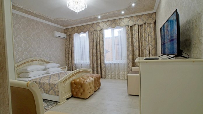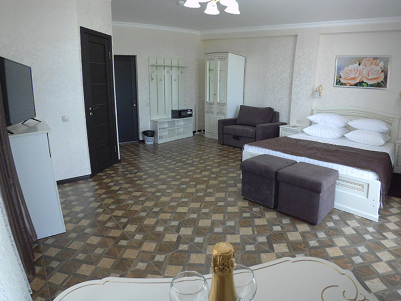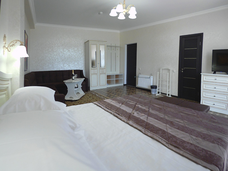 В номере: двуспальная кровать, доп. место угловой диван, шкаф, комод, прикроватные тумбы, туалетный столик, стол, вешалка, зеркало, кондиционер, телевизор, интернет, сейф, холодильник, св. печь, фен, эл. чайник, посуда, сушилка для белья, санузел.