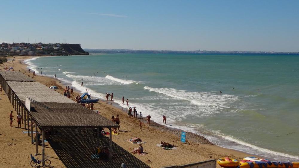 Пляжная полоса составляет влево - больше двух километров благоустроенного пляжа в длину со средней шириной в 150м. Пляж полностью благоустроен (спасатели, навесы,кафе на пляже, санузлы, детские аттракционы, периодически анимация, спорт.зоны). Пляжная полоса вправо - около 6 км диких пляжей (в т.ч. нудистских) с шикарными видами на прилегающие отвесные породы дна древнего моря.