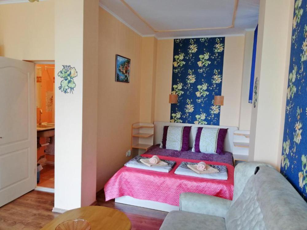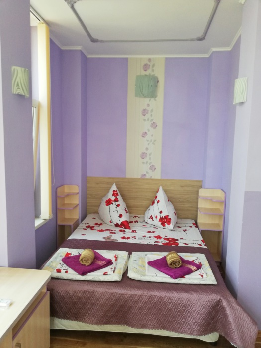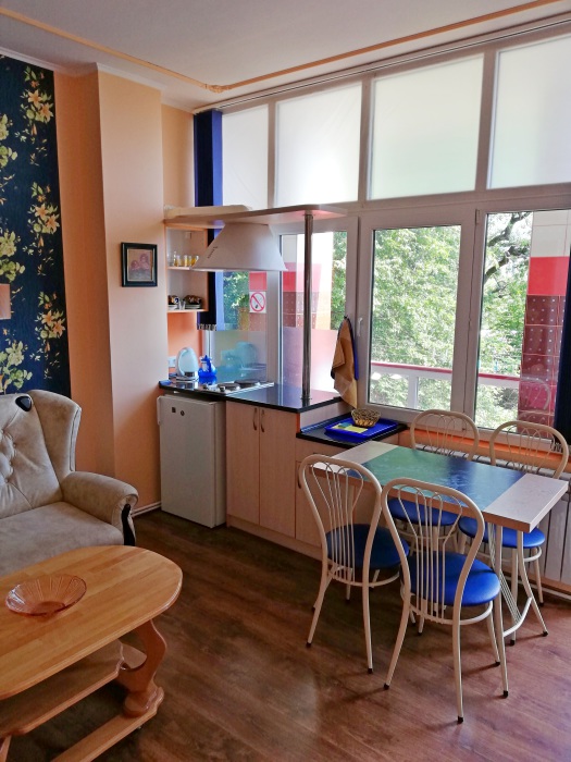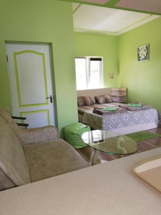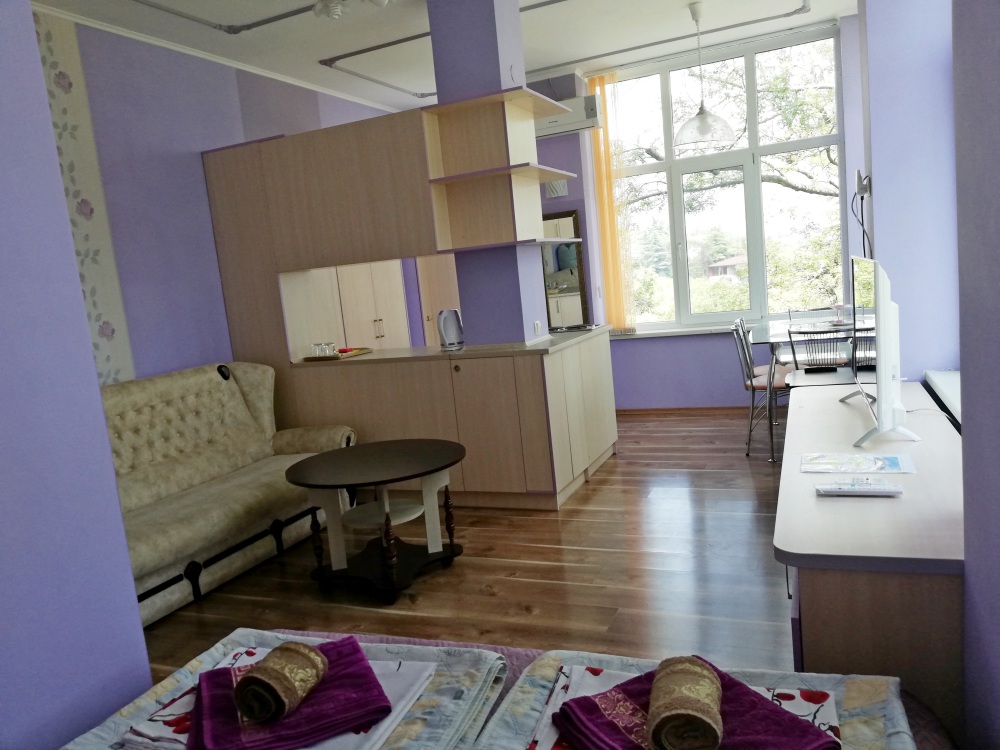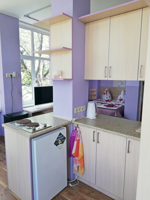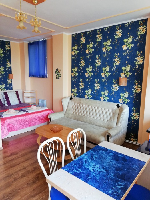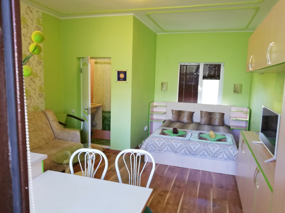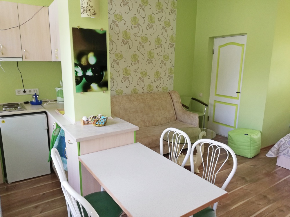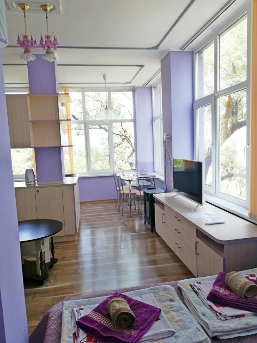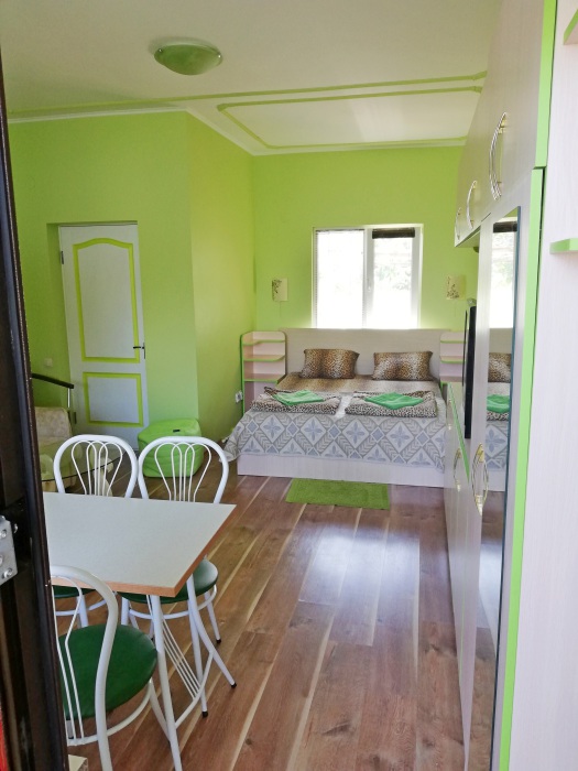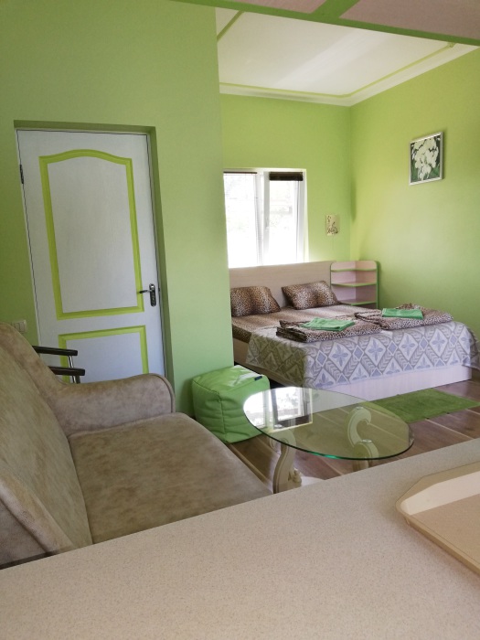Комната-студия на 2 этаже трехэтажного дома. Для проживания есть всё необходимое: кровать двухспальная с ортопедическим матрасом, прикроватные тумбы, диван-кровать, кондиционер, холодильник, варочная поверхность электрическая на 2 конфорки, ТВ, WI-FI, бойлер 80 л (вода без перебоев), фен, утюг, посуда, бельё, полотенца, балкон/лоджия, парковочное место.