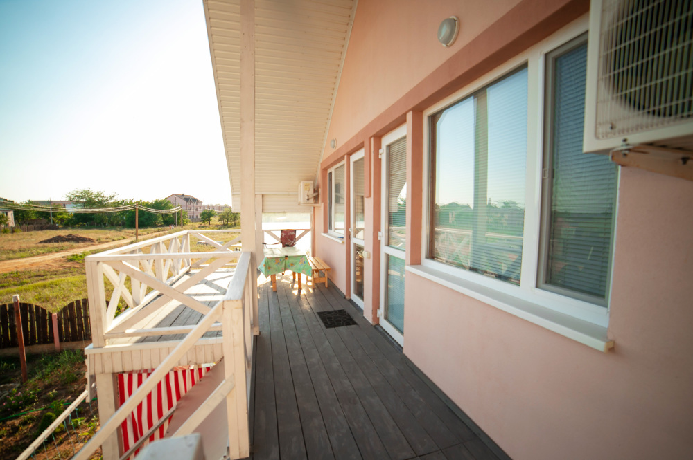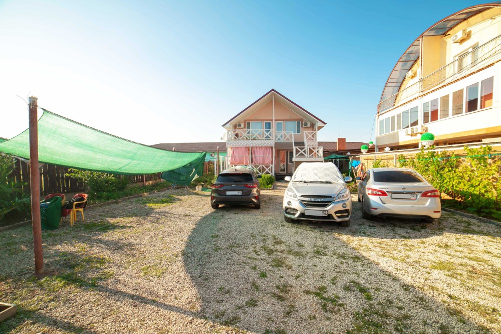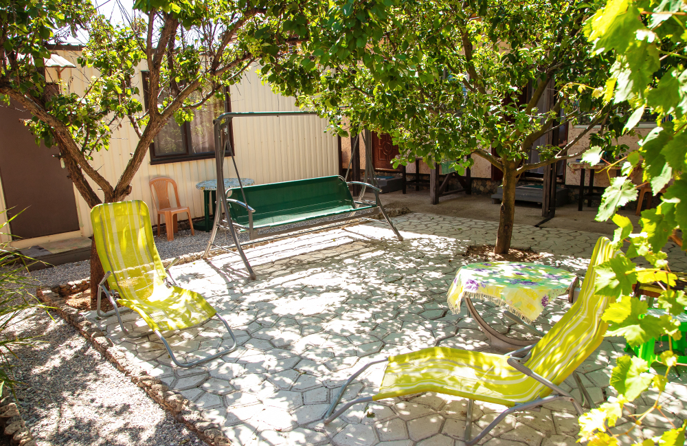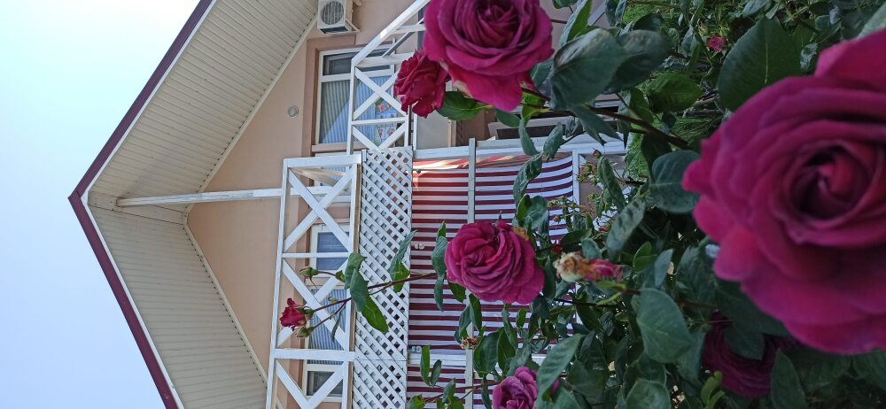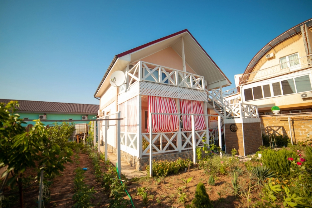 Окна номеров выходят либо на море, либо в сад. Своя территория, стоянка для машин, кухня с полным набором посуды, мангал, барбекю, шезлонги, качели, песочница, беседка, зоны отдыха и игры.
