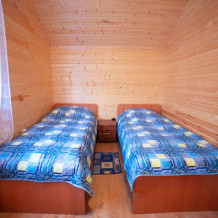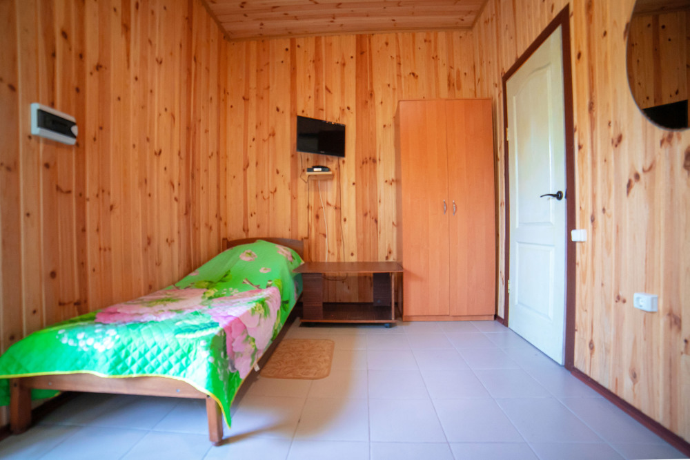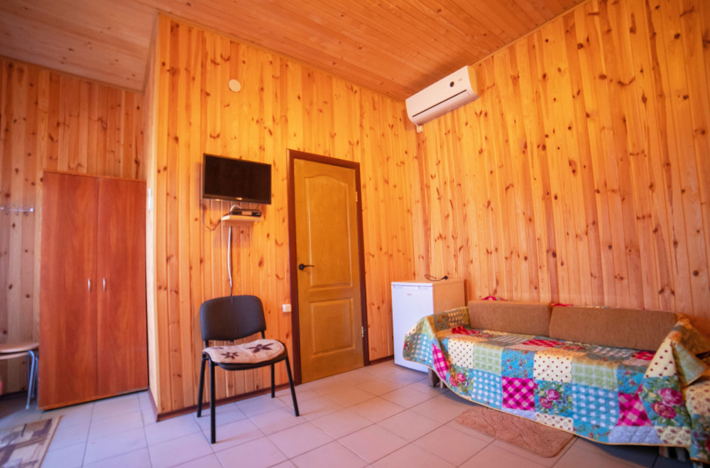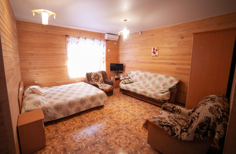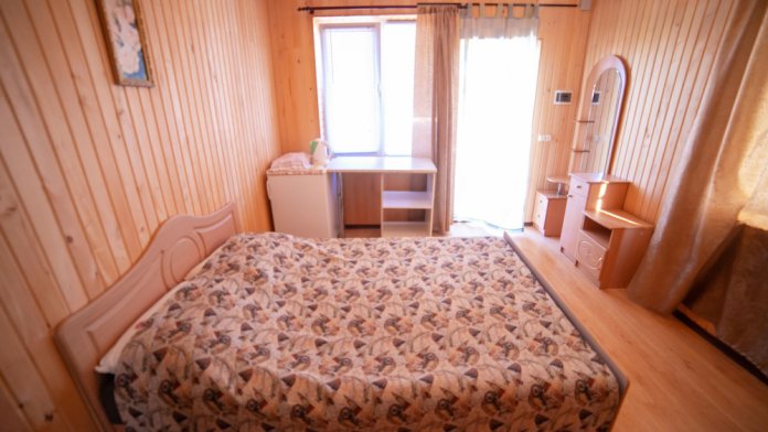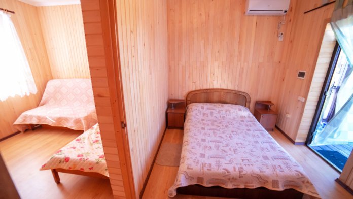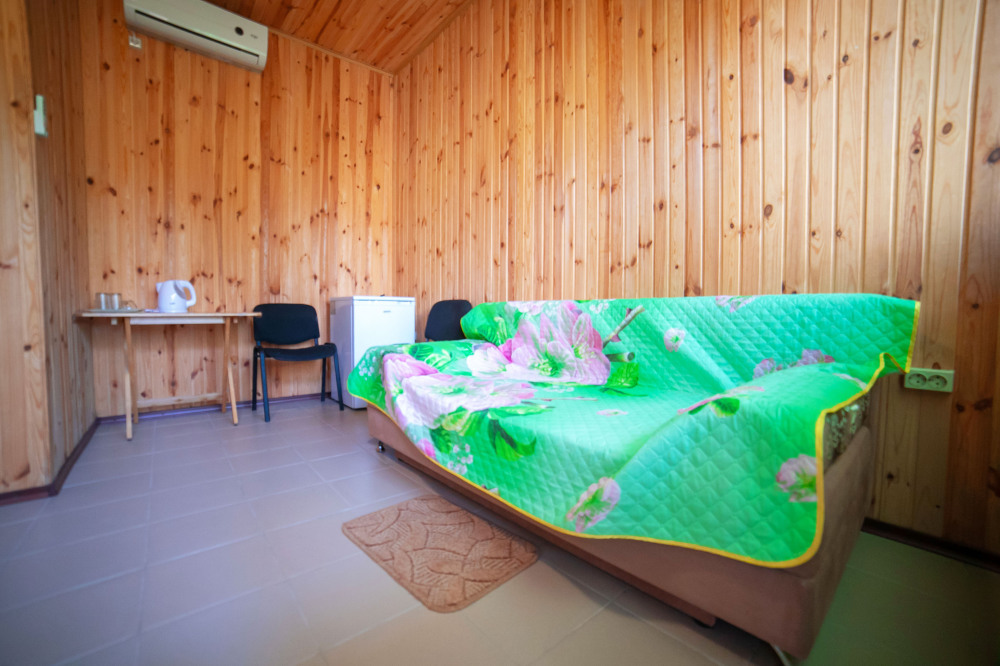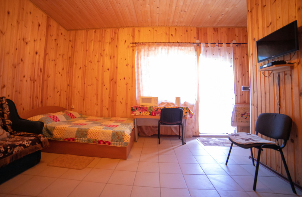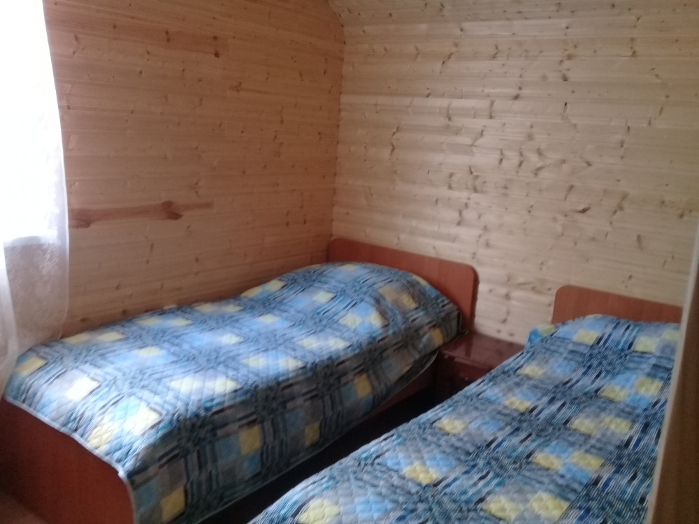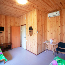 Комната с четырьмя односпальными кроватями, которые при желании можно расположить по собственному желанию. Также в номере шкаф, зеркало, два стола, стулья. Возле комнаты терраса со столом и стульями для отдыха. Интернет, холодная и горячая вода - круглосуточно.