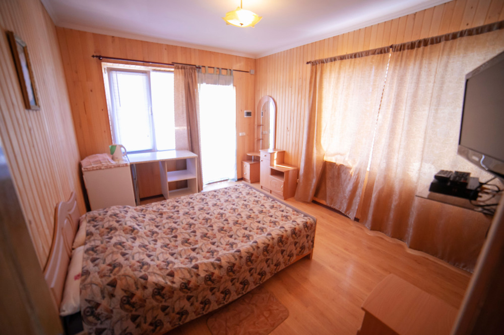 Один из 6-ти местных номеров - Студия имеет особый статус, так как он занимает весь первый этаж дома и имеет своею кухню с посудой и беседку для отдыха. В номере - кондиционер, стиральная машина, микроволновая печь, электрочайник, холодильник, телевизор, спутниковая антенна, еврокровать, два раскладных дивана, раскладное кресло и имеется возможность двух дополнительных мест. Два других 2-комнатных 6-местных расположены на отдельной территории площадью 4 сотки и еще два 2-комнатных 6-местных расположены на втором этаже, имеют большой балкон с видом на море, а также летнюю кухню и площадку для отдыха, которые используются только жильцами этих двух номеров.
