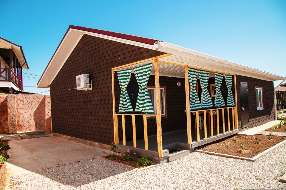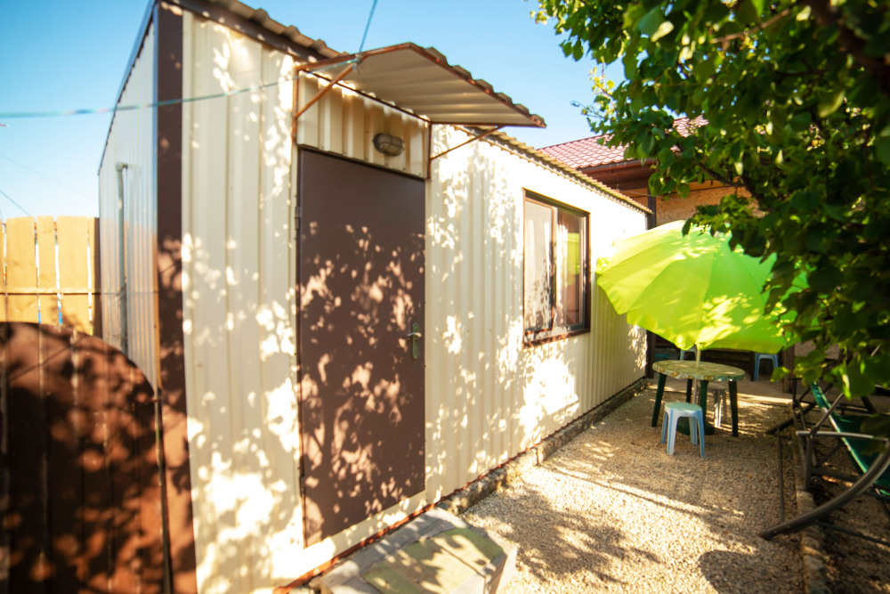 Номер сделан в виде отдельно стоящего вагончика, но со всеми удобствами и кондиционером, Возле номера выносной стол со стульями для отдыха на воздухе.